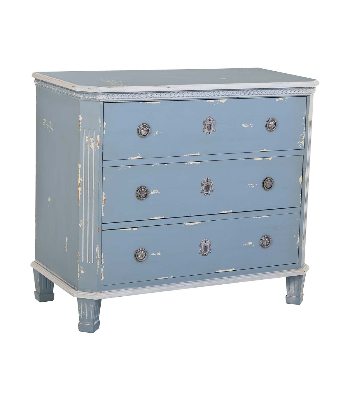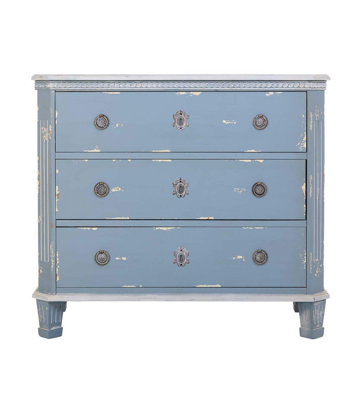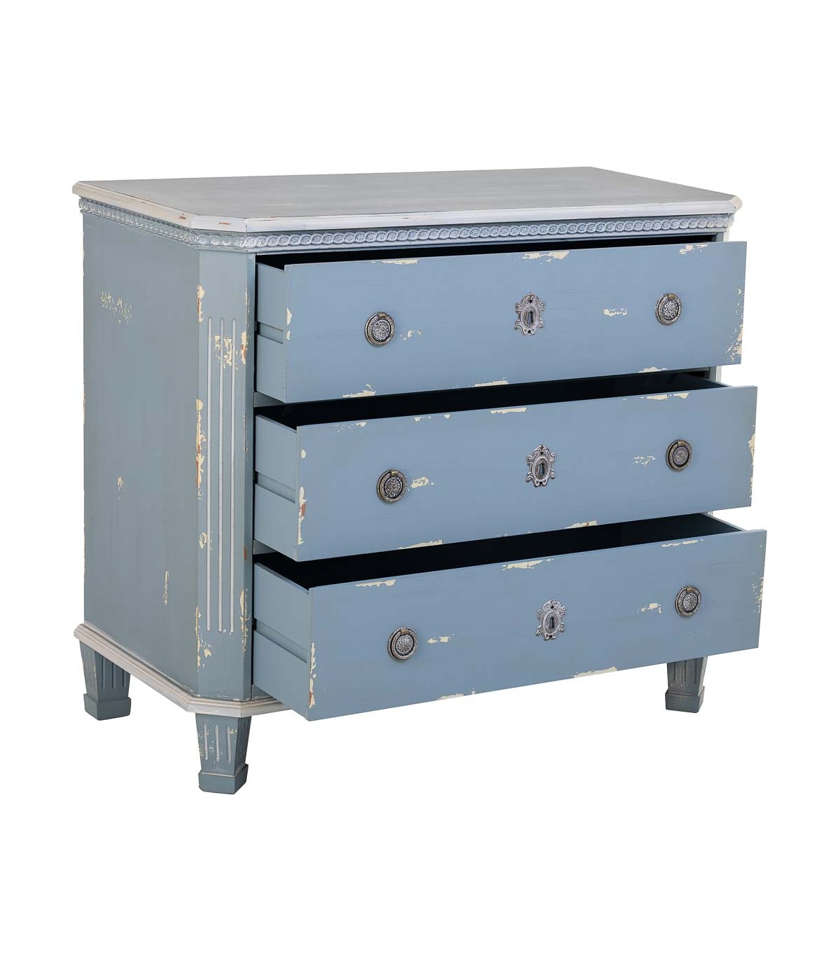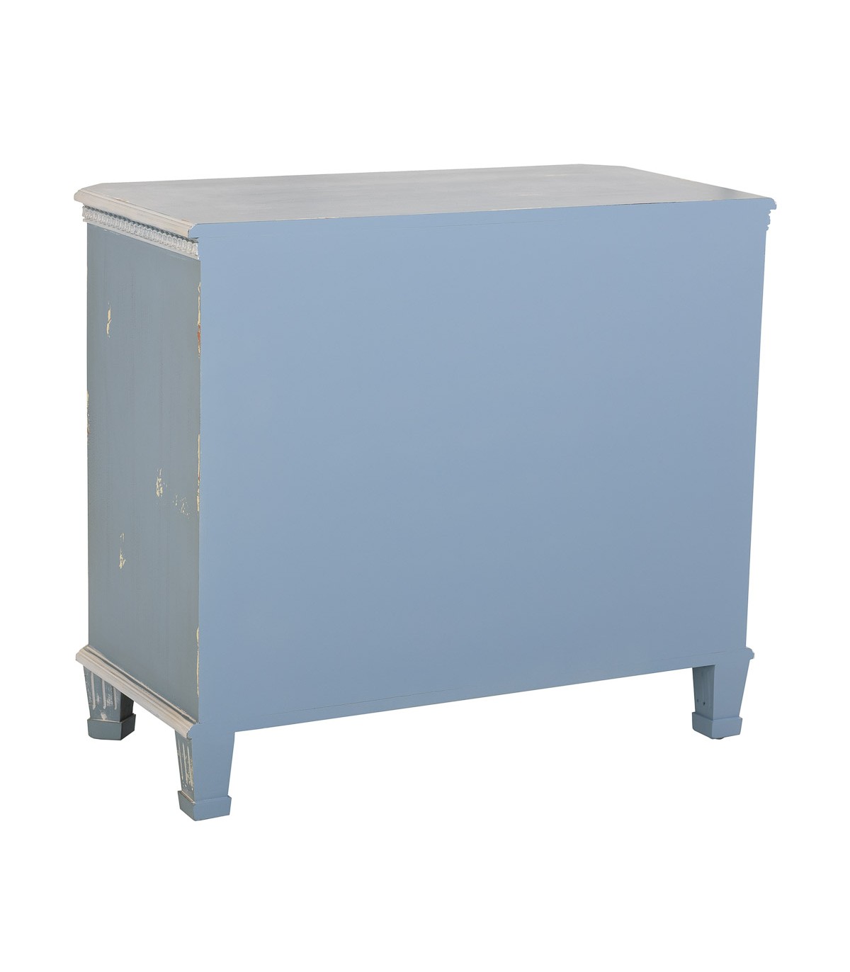 Aporta un aire vintage y sofisticado a tu hogar con esta cómoda de madera en azul decapado y detalles en blanco. Su diseño clásico con tiradores metálicos decorativos le otorga un encanto atemporal.