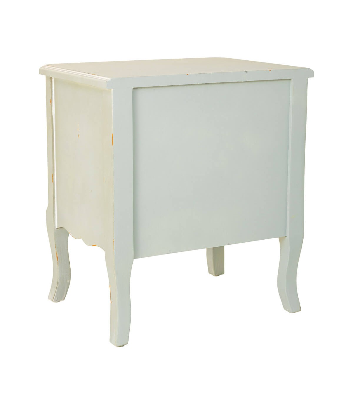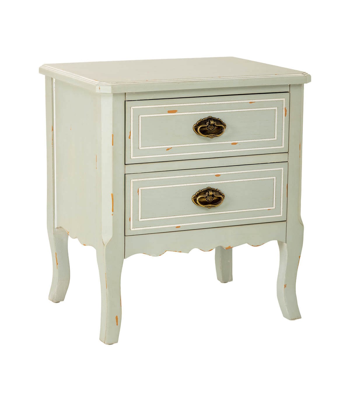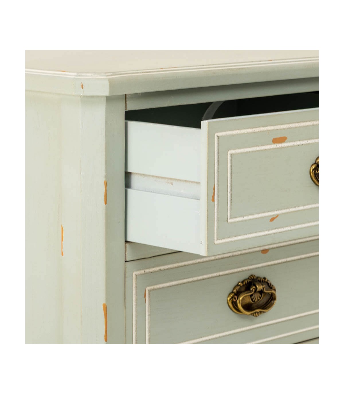 Una mesita encantadora de aire rústico y romántico con acabados artesanales que la convierten en un complemento ideal para dormitorios con alma. Fabricada en madera de pino, presenta líneas suaves, patas curvas y un delicado efecto envejecido en tono verde musgo con detalles blancos.