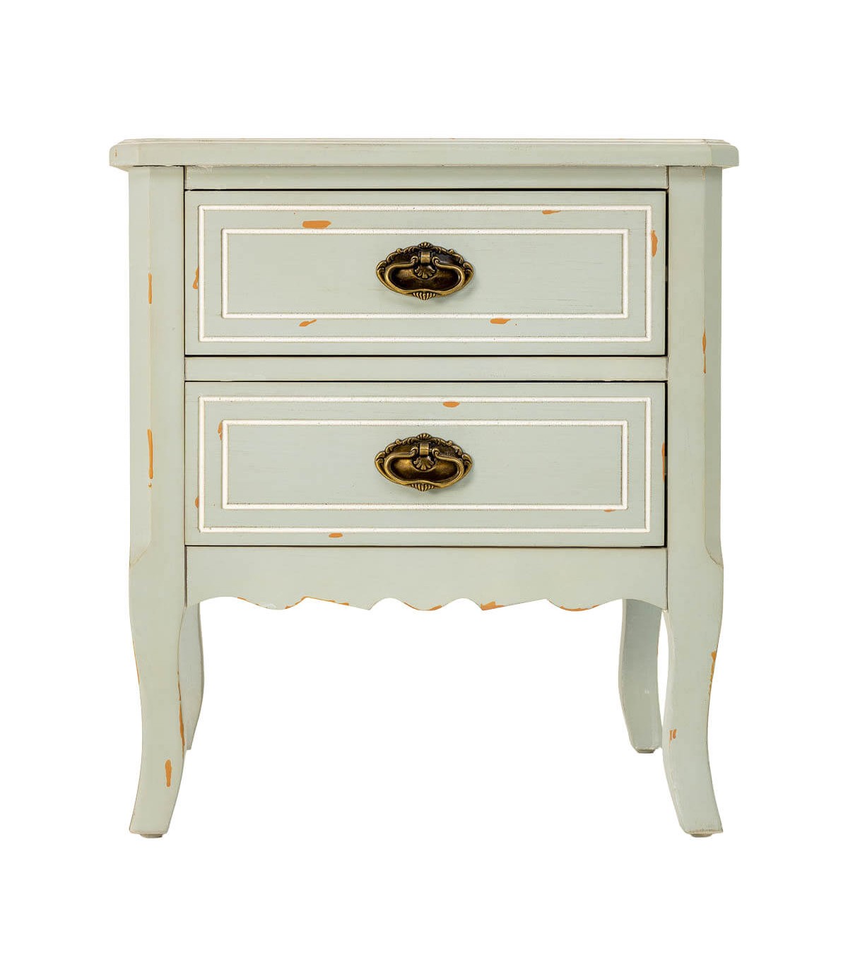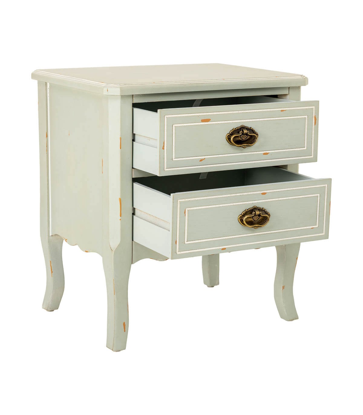 Sus dos cajones ofrecen almacenaje práctico para mantener el orden, y los tiradores metálicos en bronce envejecido aportan un toque clásico muy especial. Ideal para quienes buscan un mueble auxiliar con personalidad, calidez y funcionalidad.