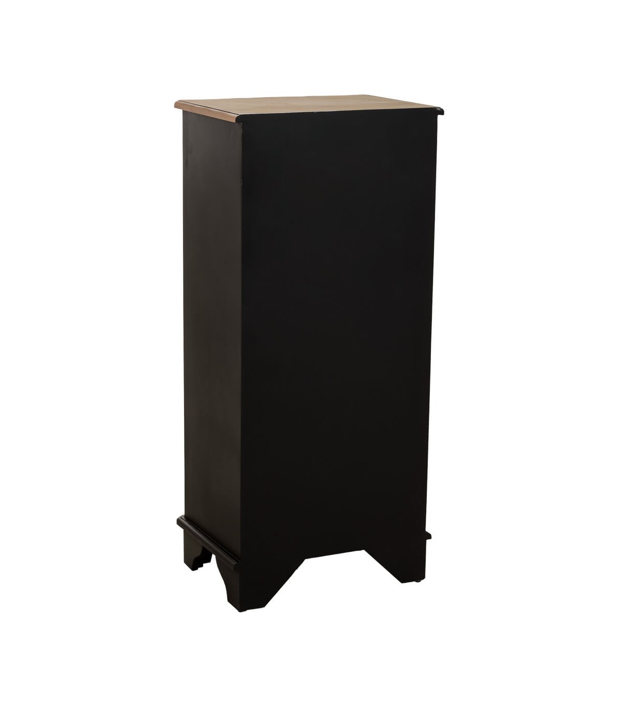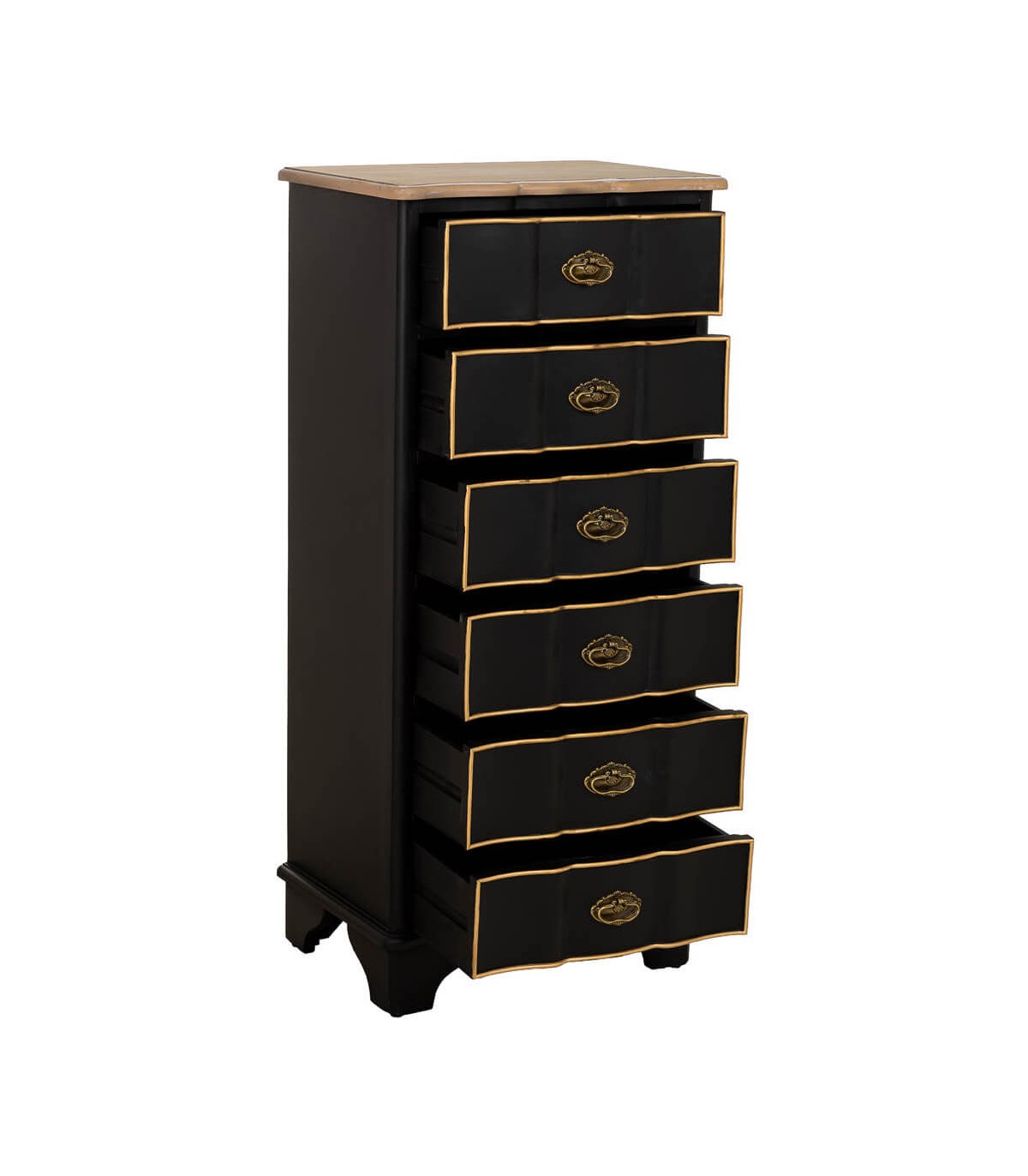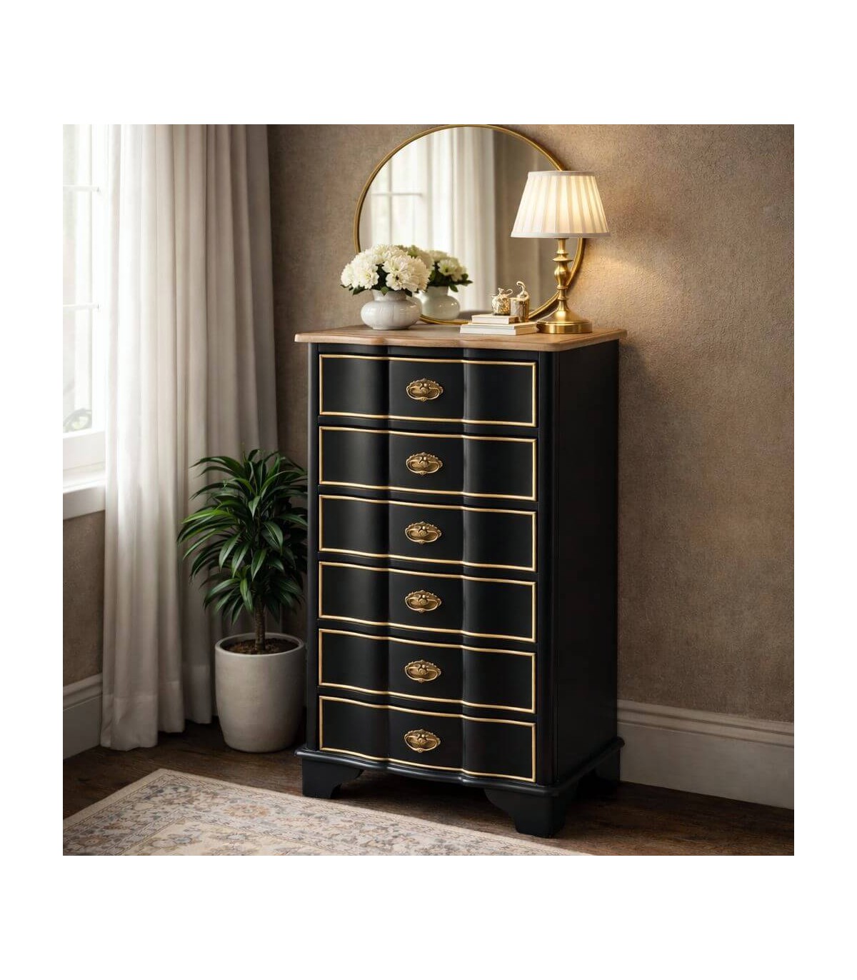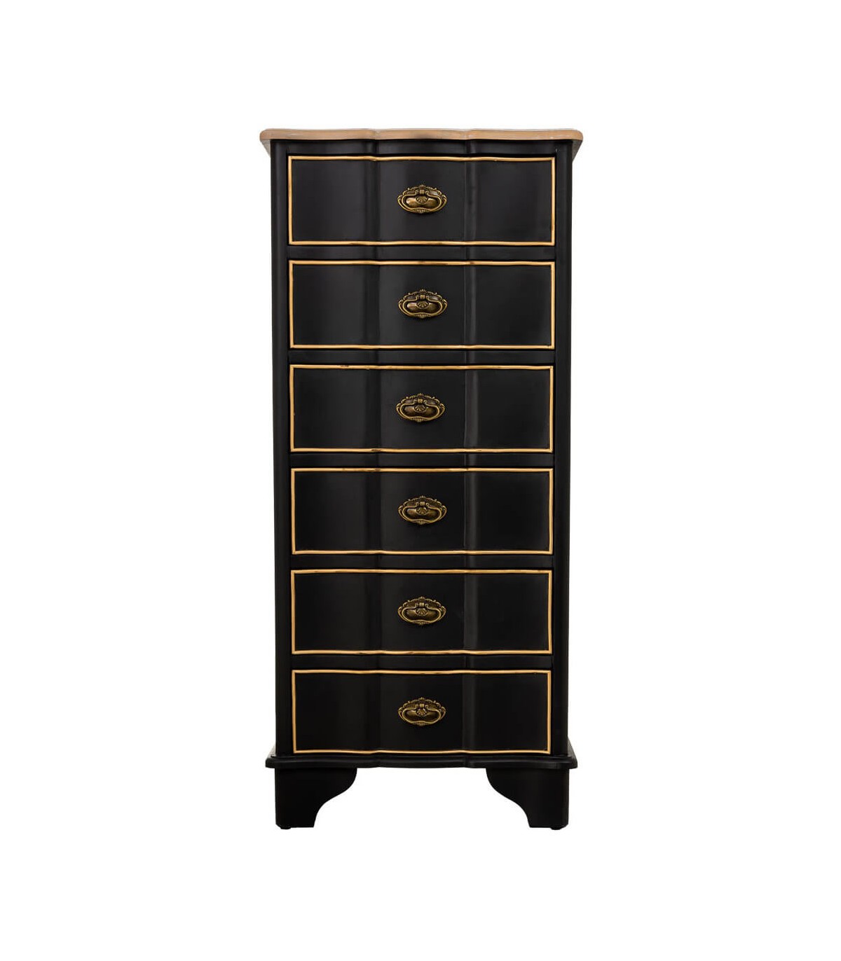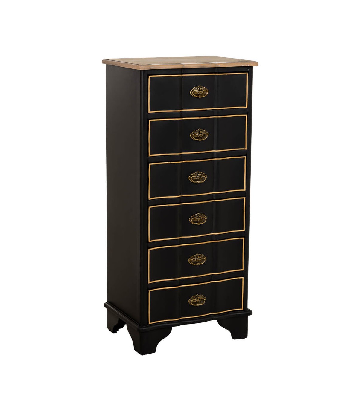 Sinfonier de estilo neoclásico concebido para aportar elegancia y verticalidad al espacio con una presencia refinada y atemporal. La combinación de la tapa en madera natural con el cuerpo lacado en negro crea un contraste sofisticado y equilibrado. Los cajones perfilados en tono dorado aportan un acento clásico que realza el carácter decorativo del mueble.