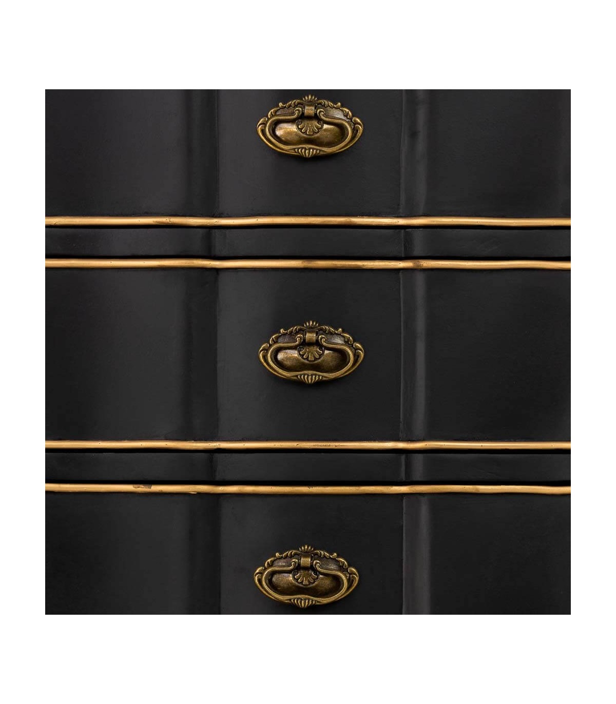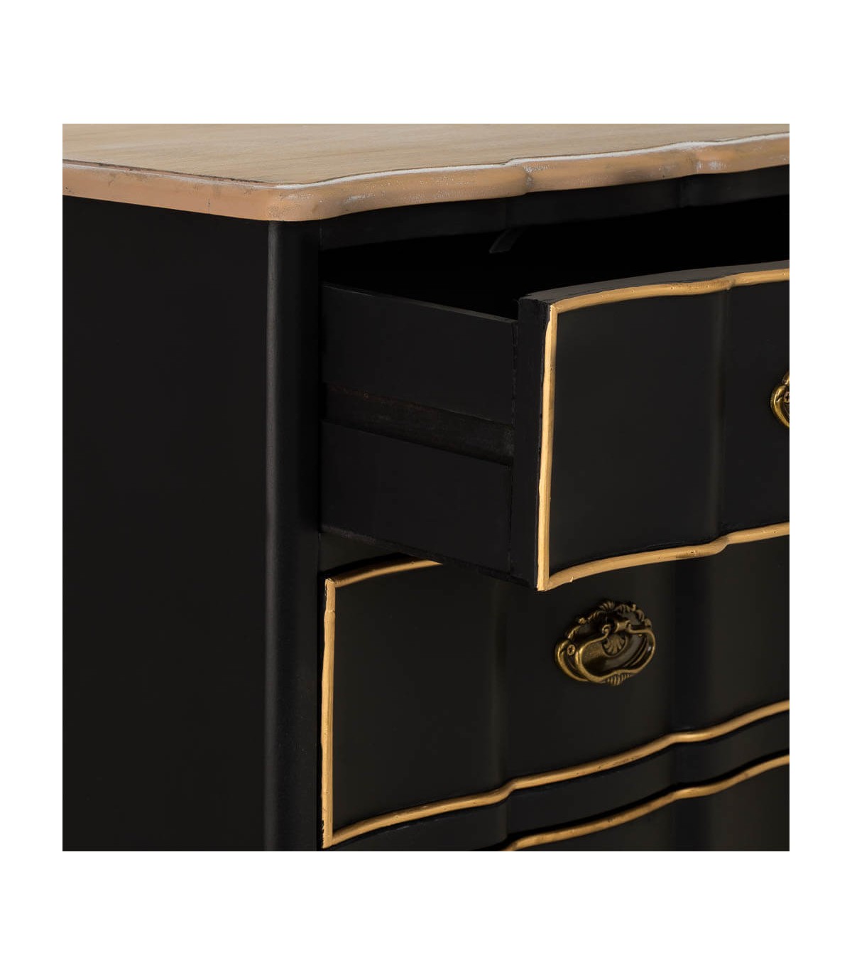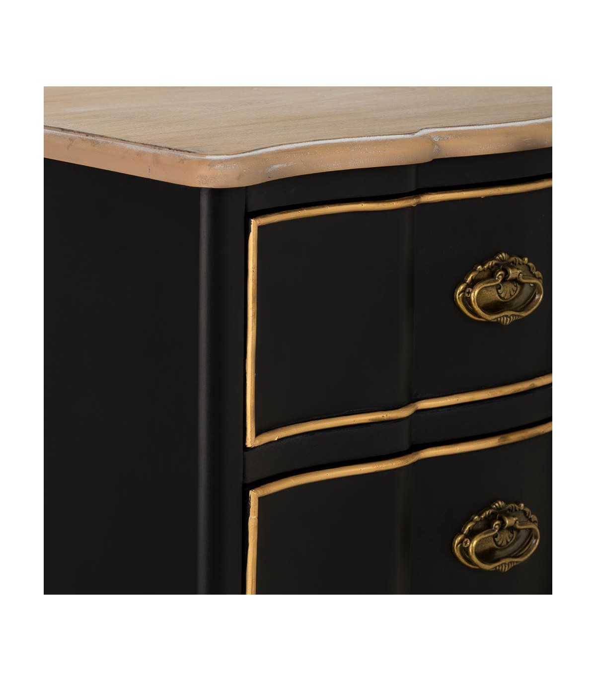 🎨 acabado: Tapa de madera natural, cuerpo lacado en negro, cajones perfilados en oro con tiradores metálicos a juego, fabricación artesanal.