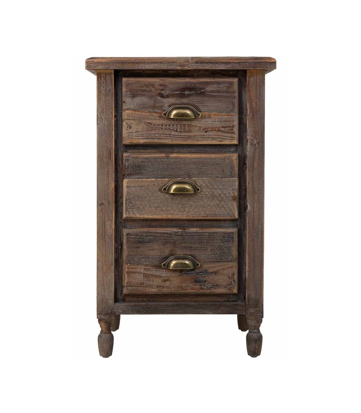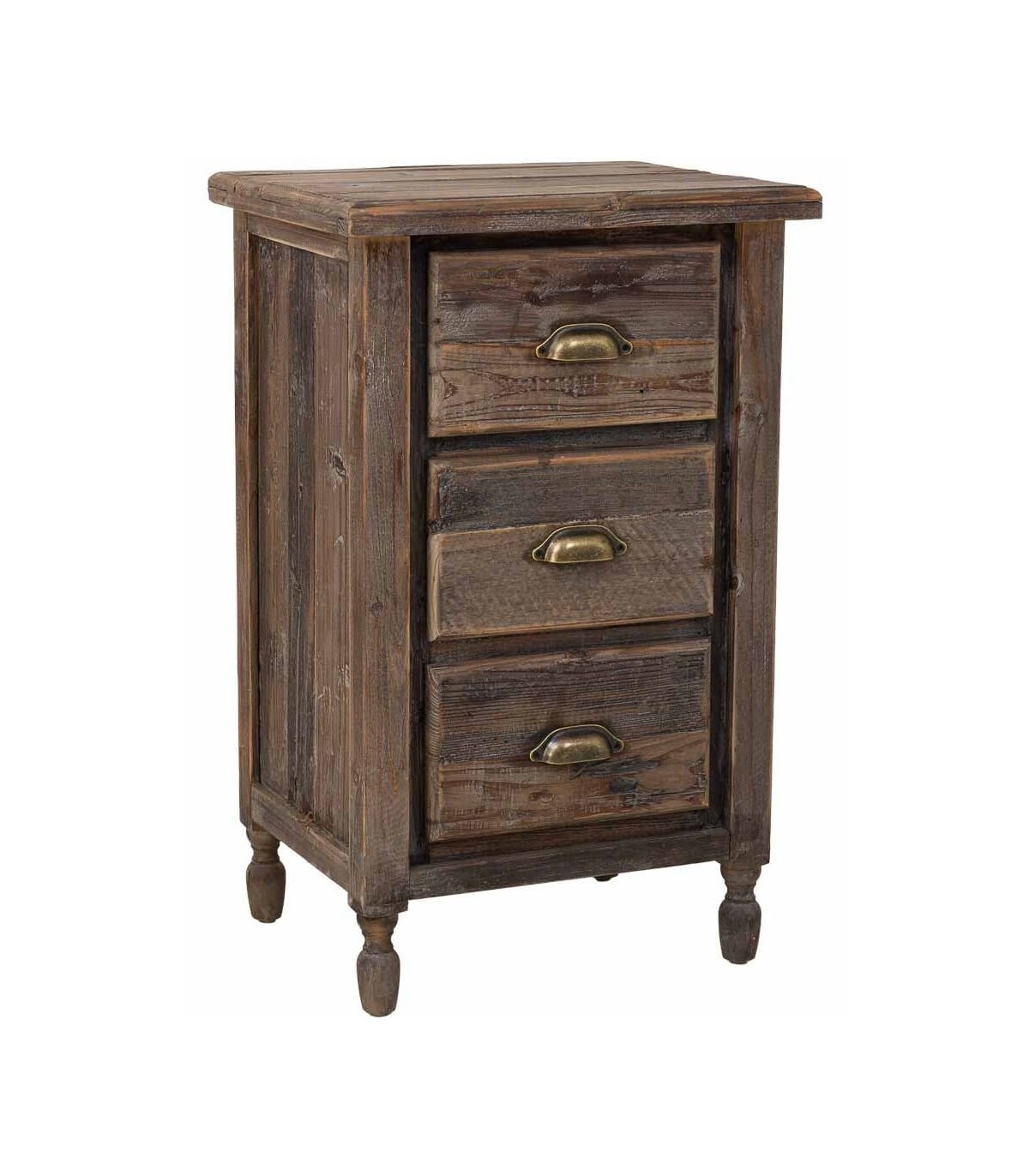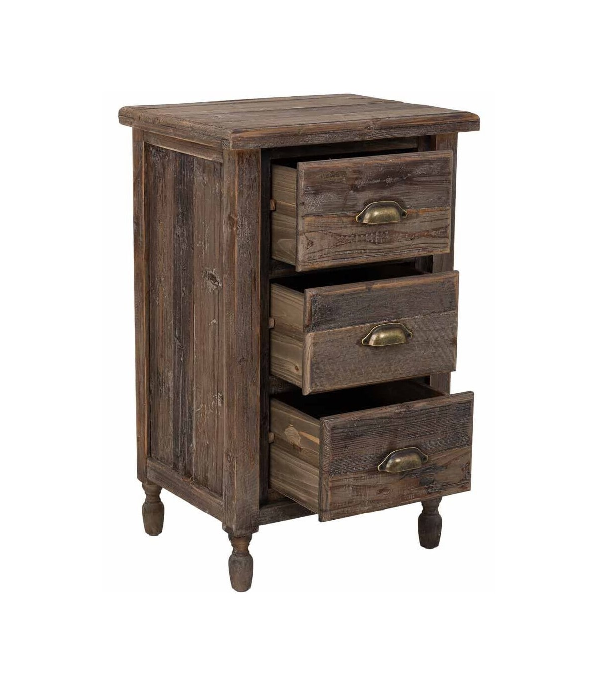 Dale un aire cálido y auténtico a tu dormitorio con esta mesita de noche alta de tres cajones, elaborada en madera maciza de abeto reciclado. Su diseño rústico de líneas sencillas y estructura robusta está realzado con un acabado envejecido que realza las vetas y texturas originales de la madera.
