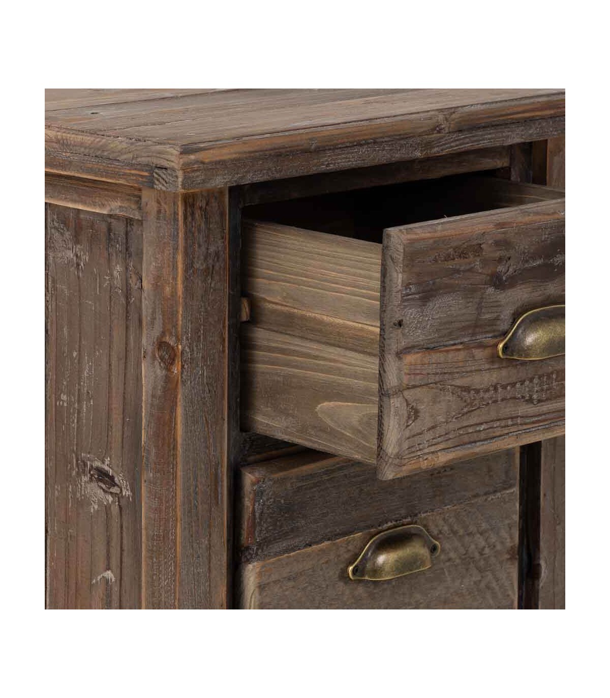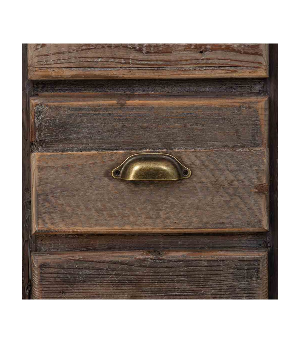 Los tiradores metálicos de estilo vintage en bronce patinado completan el conjunto, aportando un encanto atemporal. Ideal como mesita de noche o mueble auxiliar en ambientes relajados, bohemios o naturales, donde se aprecian los materiales con historia.