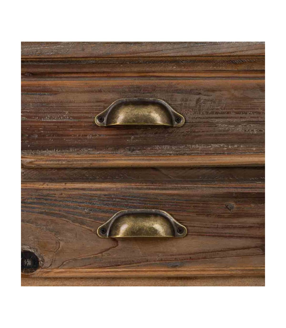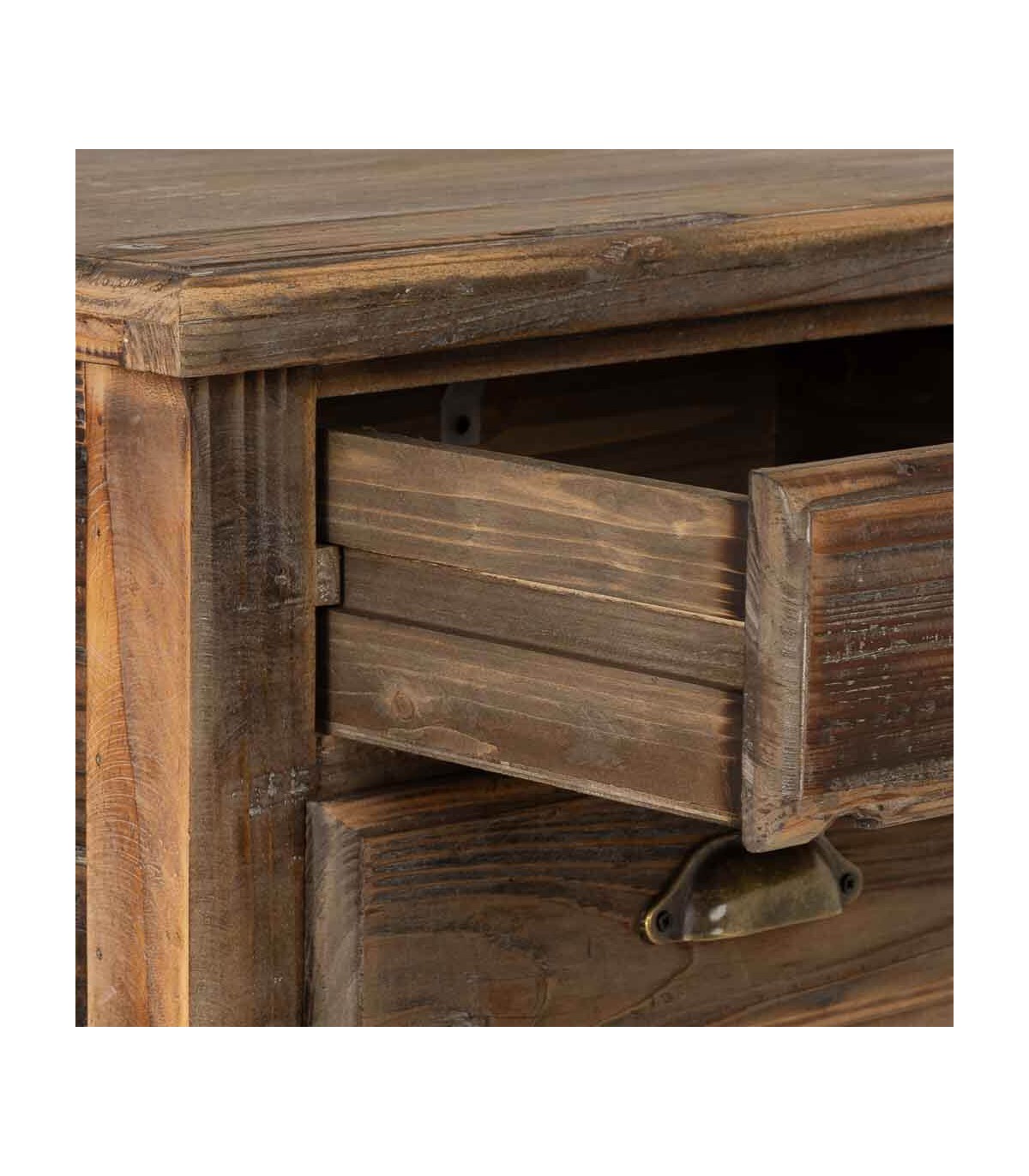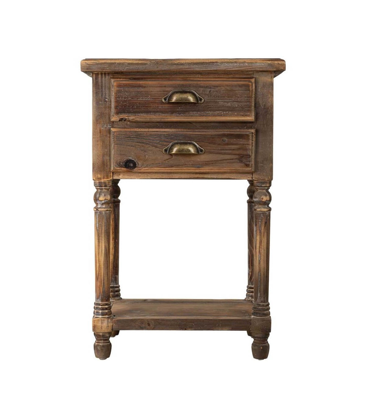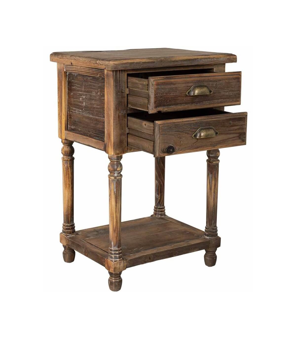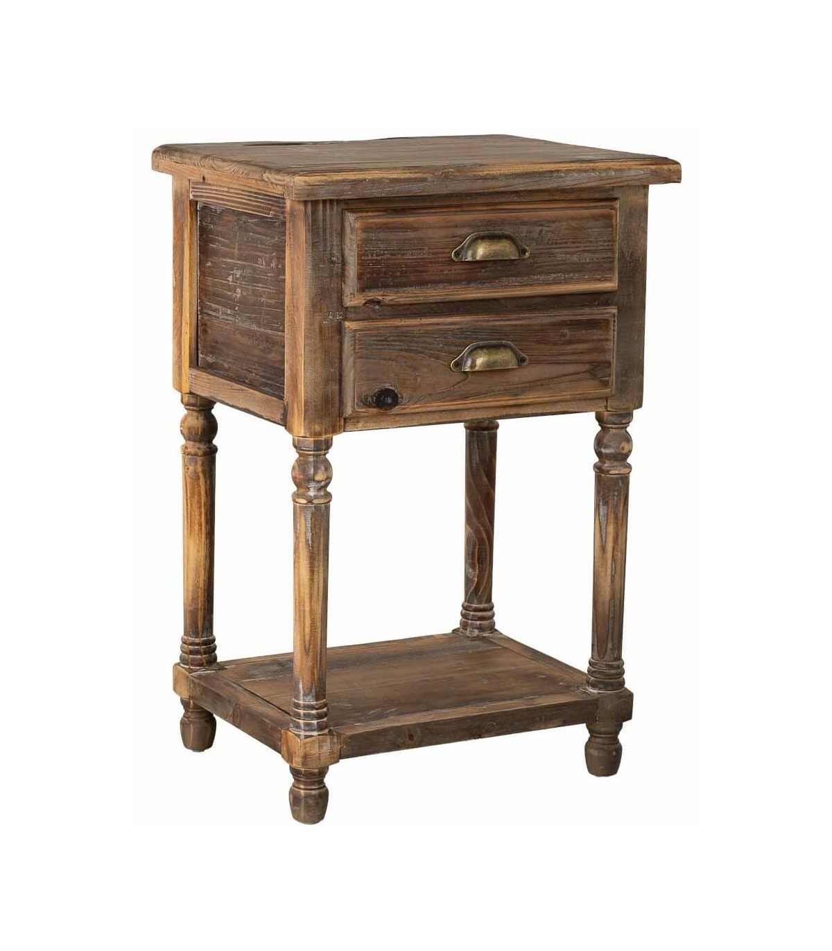 Sumérgete en la calidez del estilo rústico con esta mesita de noche elaborada en madera de abeto reciclado. Con un diseño robusto y funcional, incluye dos cajones con tiradores metálicos envejecidos y una balda inferior perfecta para colocar cestas o libros.