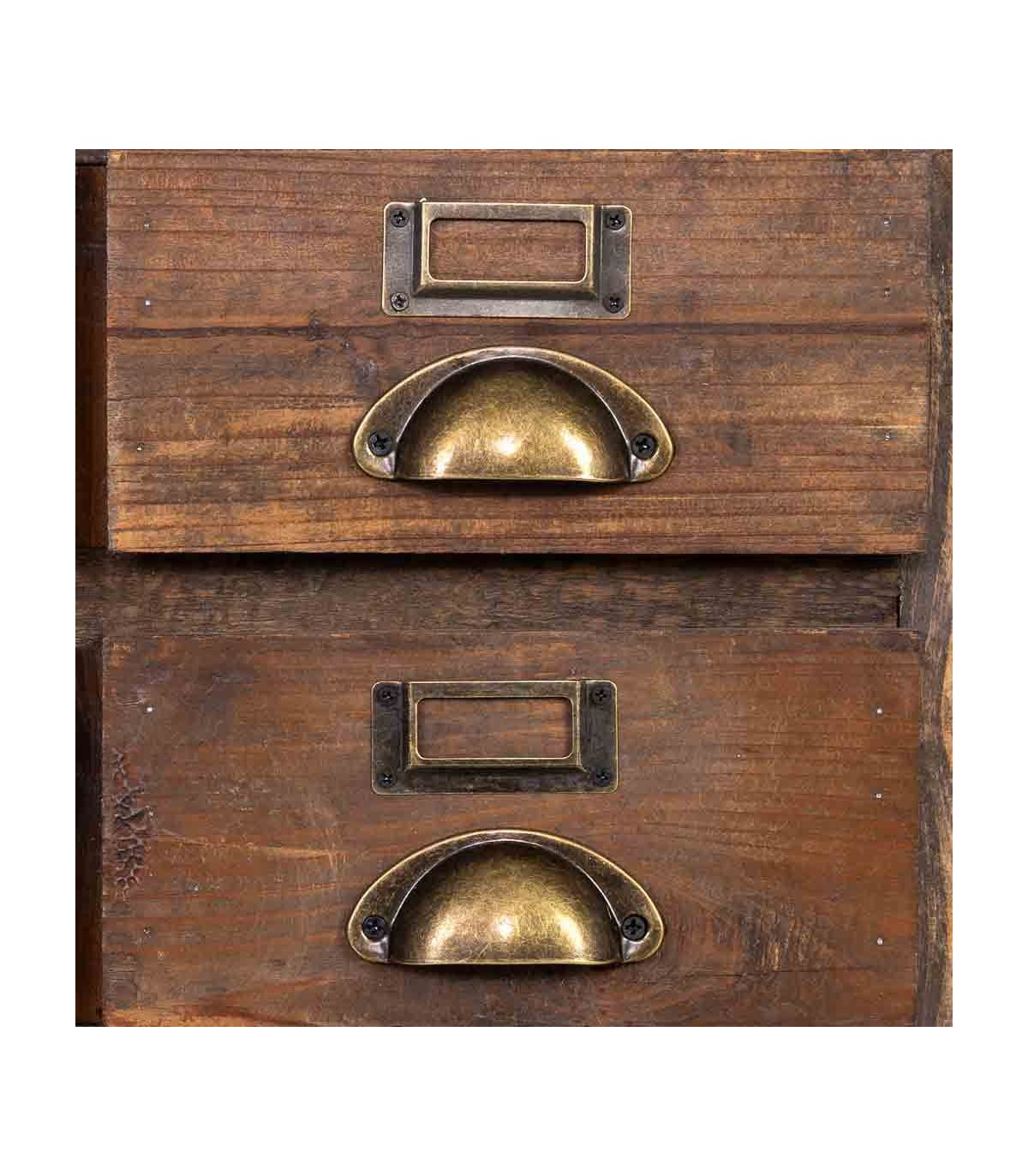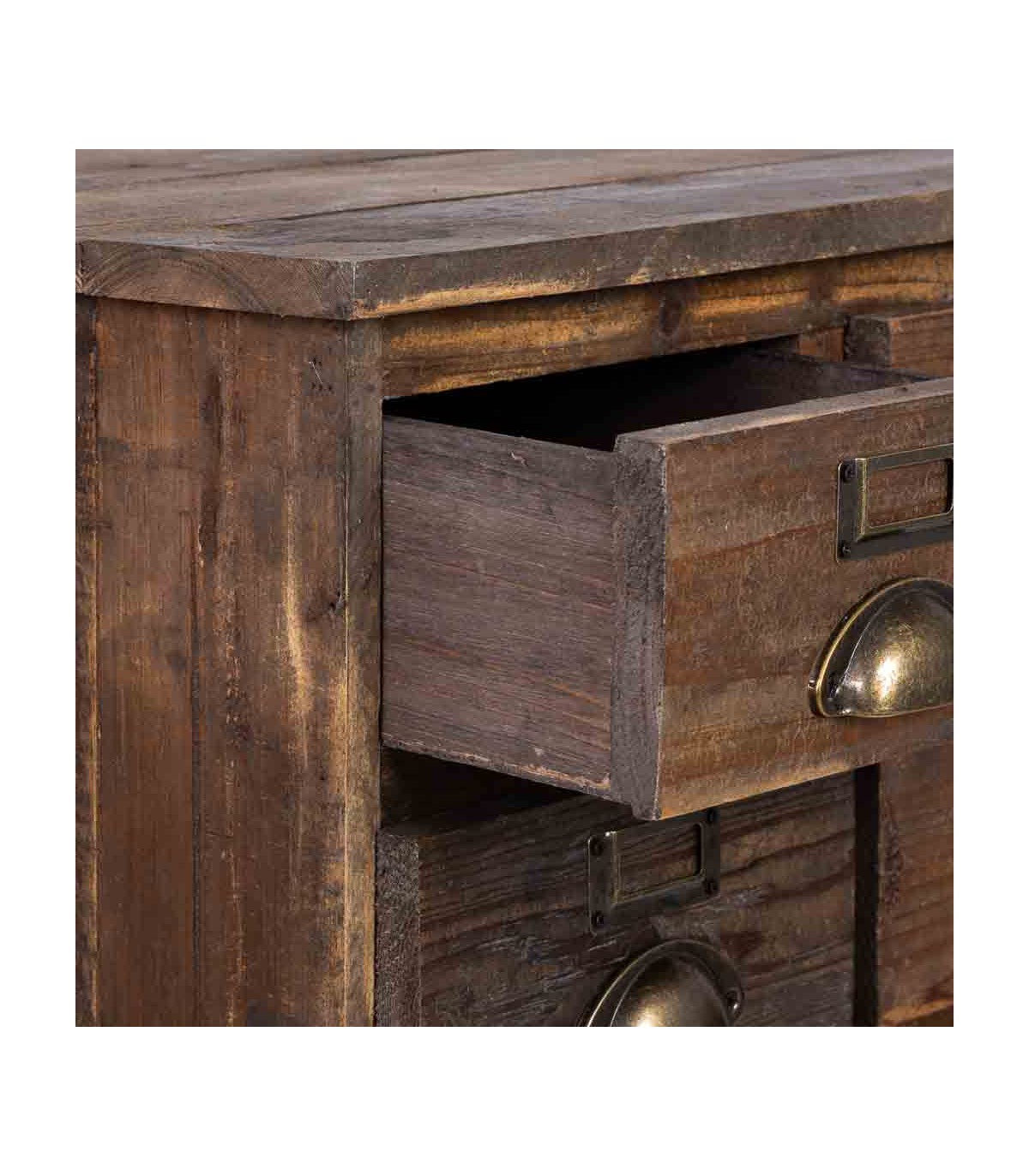 Aporta calidez y autenticidad a tu dormitorio con la Mesita de Noche Rústica de Madera Reciclada. Su diseño artesanal con 6 cajones ofrece espacio de almacenaje funcional sin renunciar al encanto del estilo boho rústico. Fabricada en madera maciza de abeto reciclado, su acabado en tono nogal envejecido resalta la belleza natural de la madera, mientras que los tiradores de metal bronce patinado aportan un toque vintage industrial.