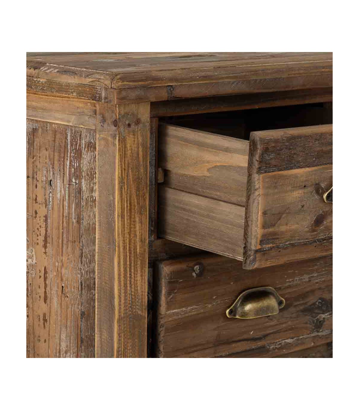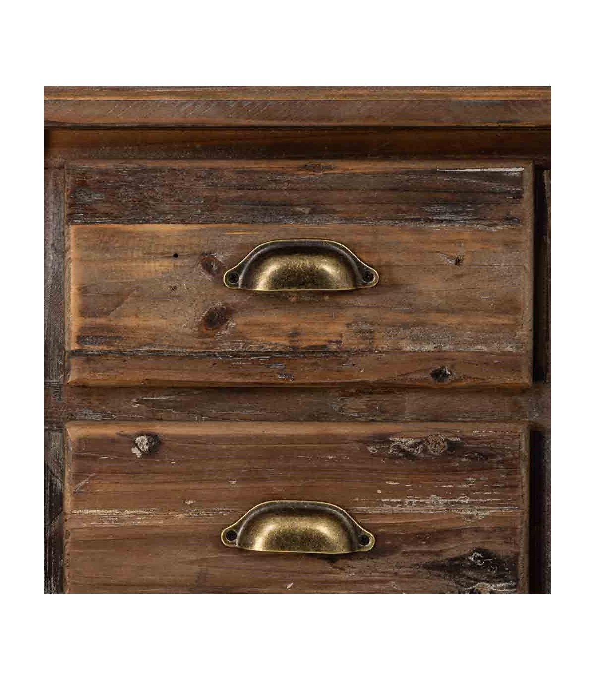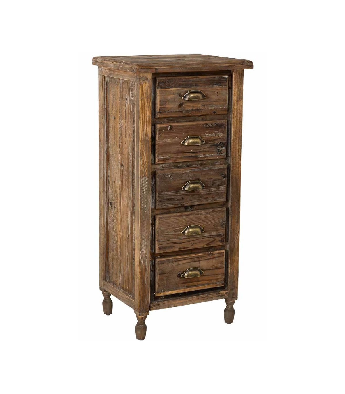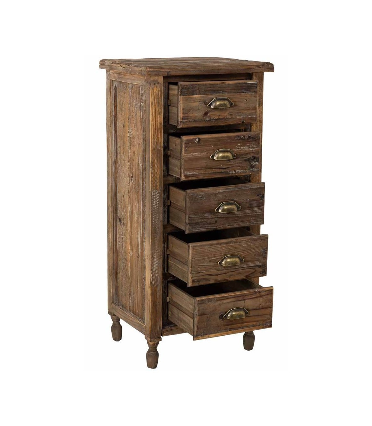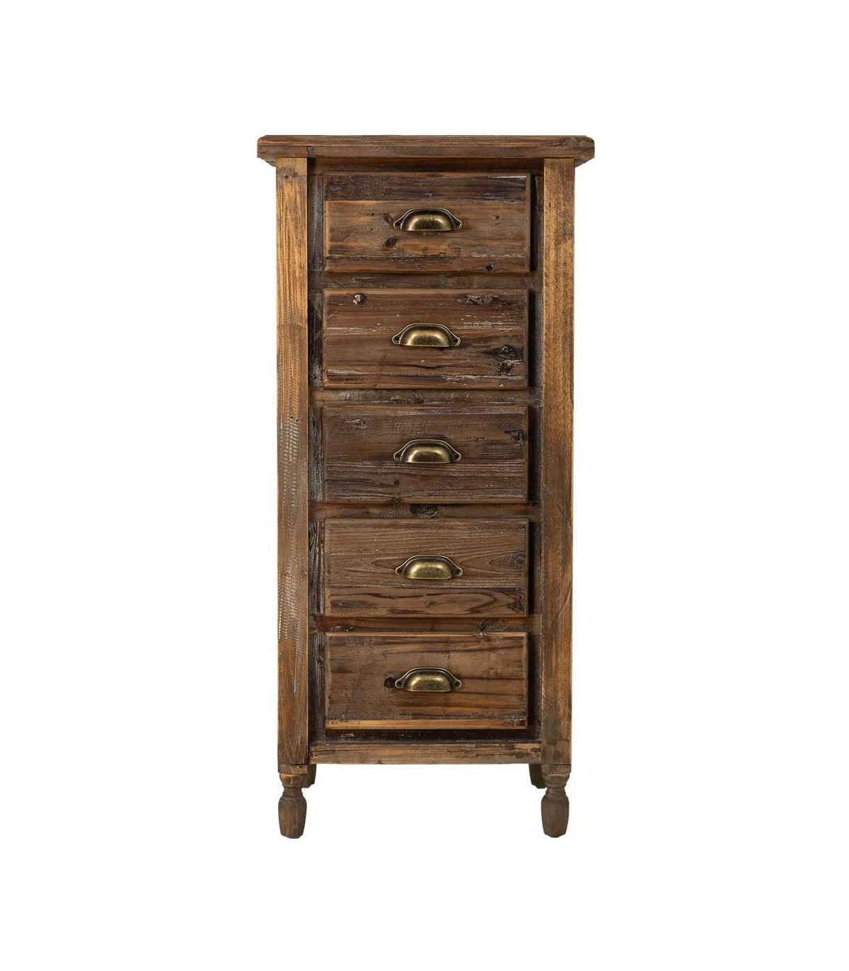 Aporta calidez y autenticidad a tu hogar con este encantador sinfonier de cinco cajones fabricado en madera maciza de abeto reciclado. Su estructura vertical optimiza el espacio, mientras que el acabado envejecido y los tiradores de bronce patinado realzan su esencia rústica.