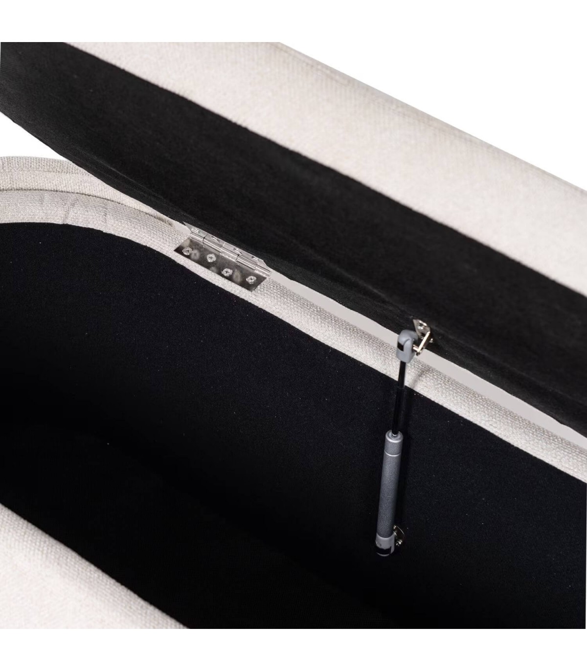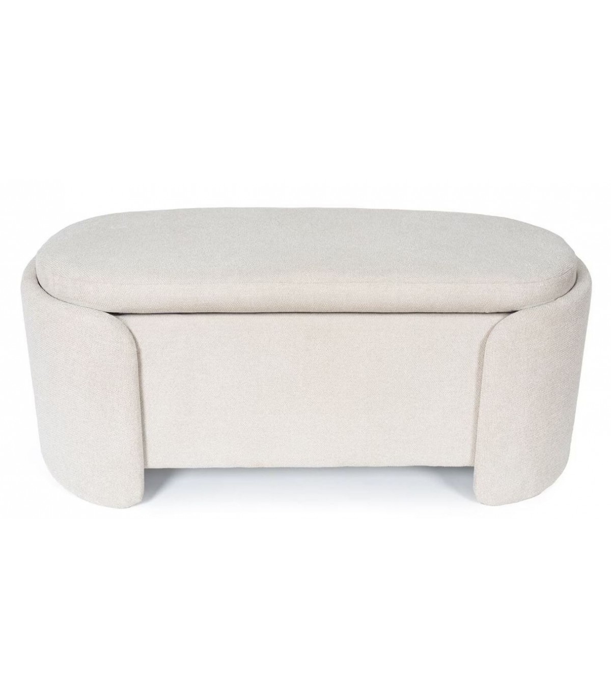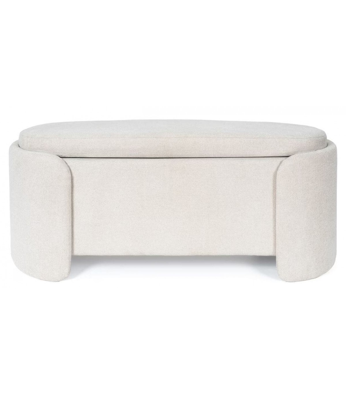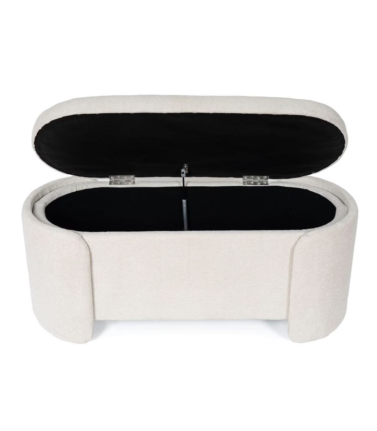 La forma redondeada de sus líneas transmite calidez, convirtiéndose en un complemento armónico para cualquier dormitorio o salón. Además de su atractivo estético, dispone de un práctico espacio de almacenaje oculto bajo la tapa, ideal para mantener el orden con estilo. Su tono neutro facilita la combinación con distintos ambientes y aporta un aire sereno al espacio.