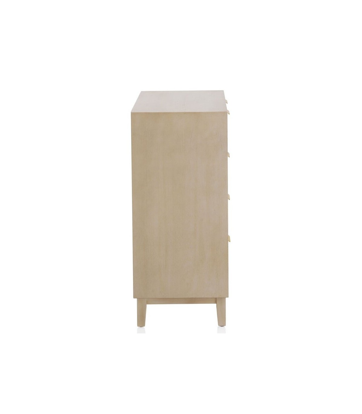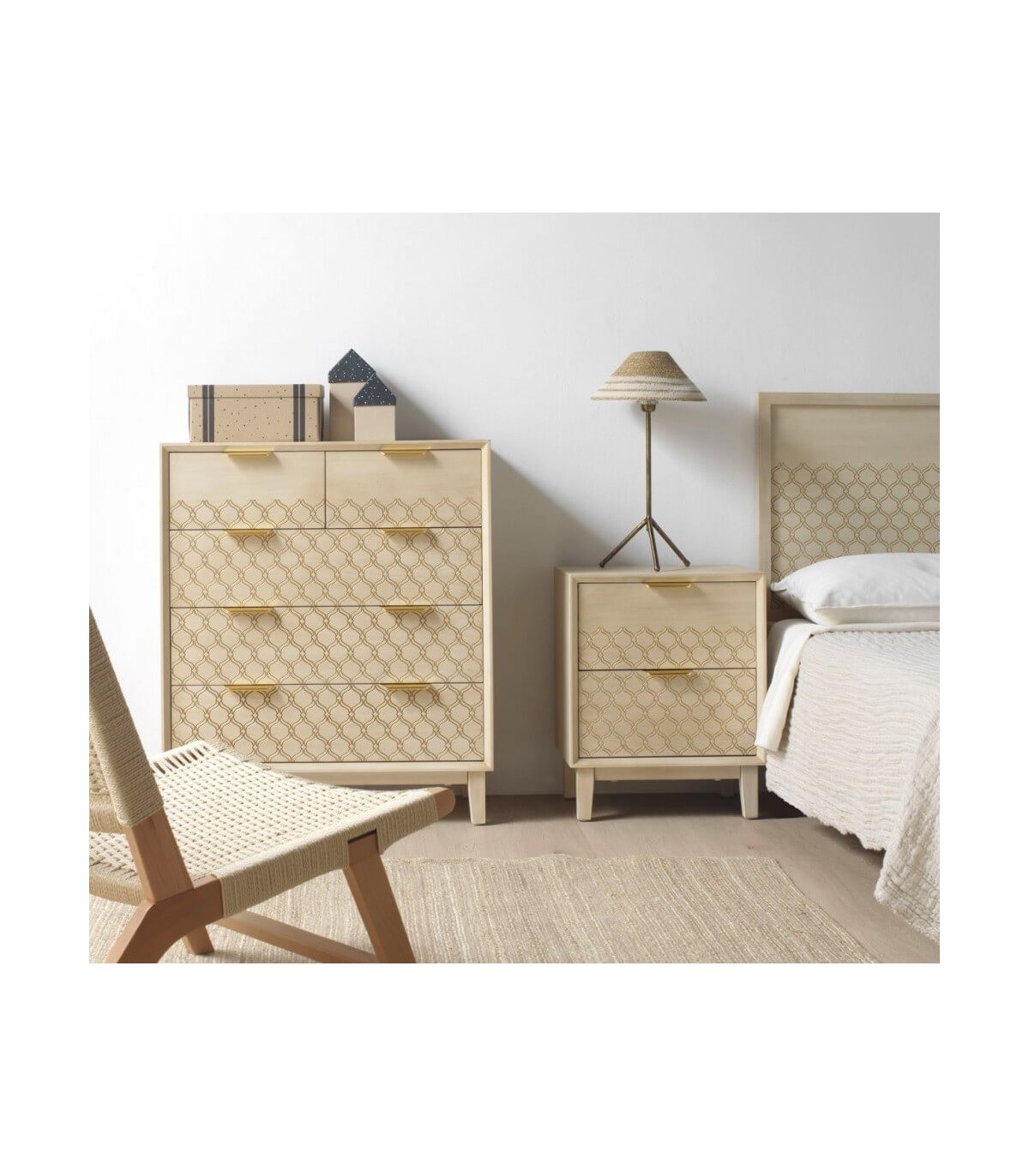 Cómoda de 5 cajones de nuestra colección Bastian, una colección que se caracteriza por la chapa de roble natural color marfil, con los frentes labrados y los tiradores en metal dorado, una colección de muebles de estilo nórdico con un punto chic, perfecta par tu dormitorio o tu salón.