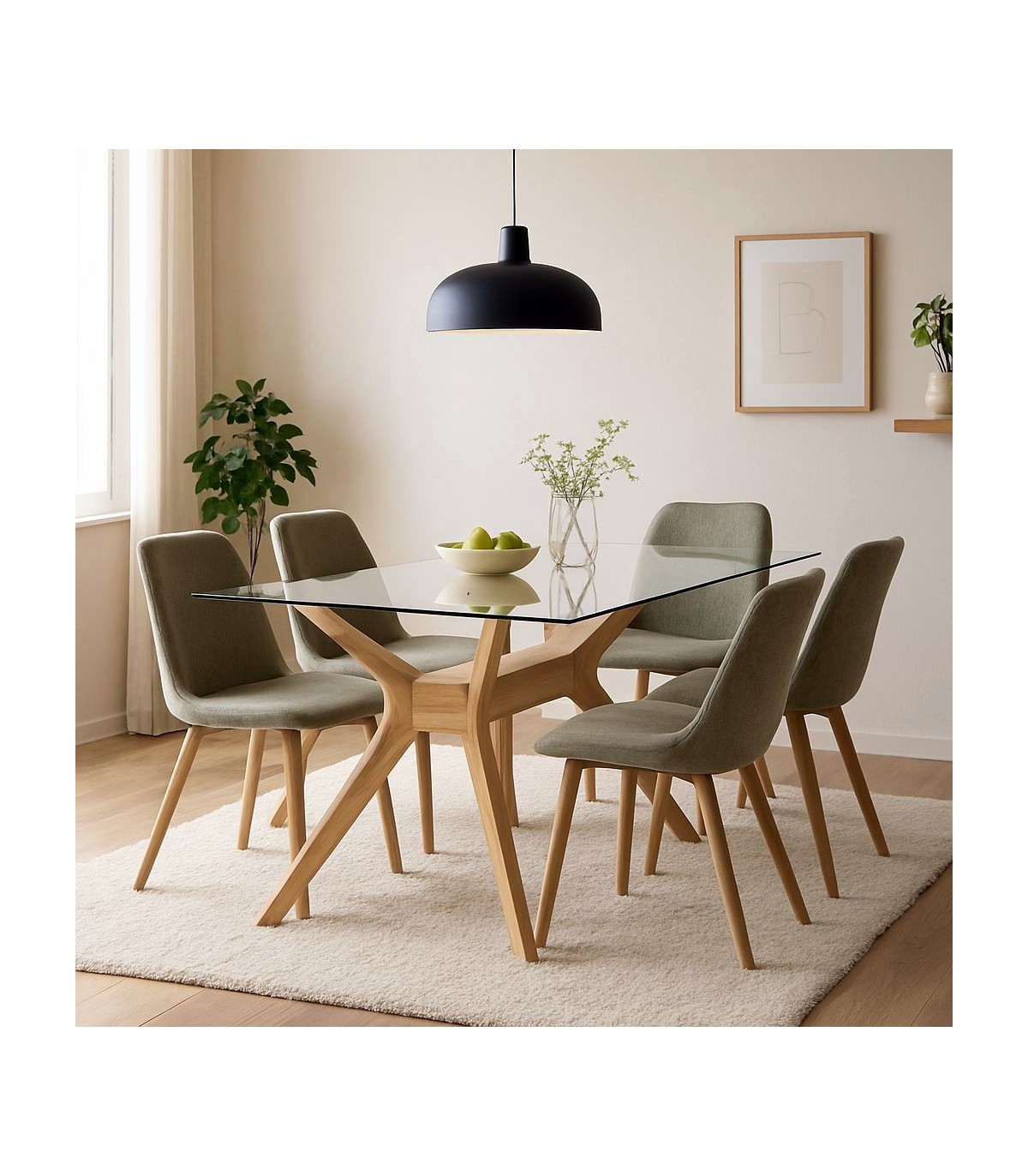 La mesa de comedor rectangular aporta ligereza y naturalidad al espacio gracias a la combinación de cristal templado transparente y la calidez de la madera. El sobre de cristal de líneas limpias potencia la luminosidad y deja ver la estructura en madera de hevea con acabado roble natural, creando un conjunto equilibrado y sereno.
