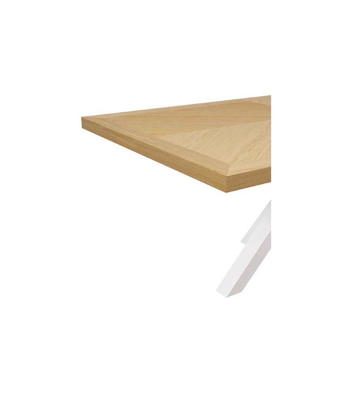 Esta mesa de comedor rectangular combina a la perfección elegancia, calidad y funcionalidad. Su estructura cuenta con un pie lacado en blanco, que aporta luminosidad y ligereza visual, contrastando con su impresionante tapa chapada en madera de roble plumeado a 4 aguas, un acabado exclusivo que resalta la belleza natural de la madera.