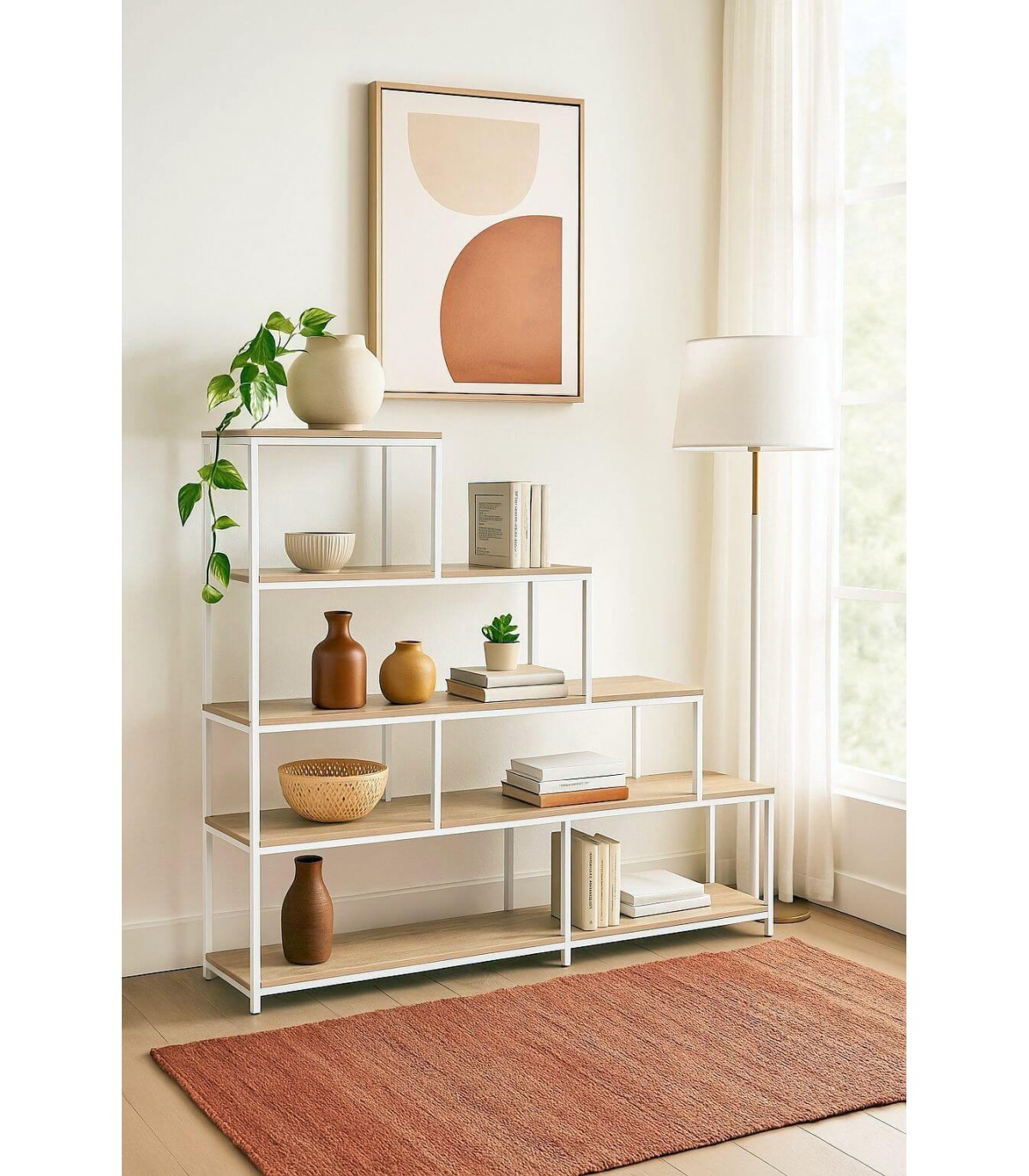 📚 Estantería Escalonada de MDF Roble y Metal Blanco – Estilo Nórdico ❄️