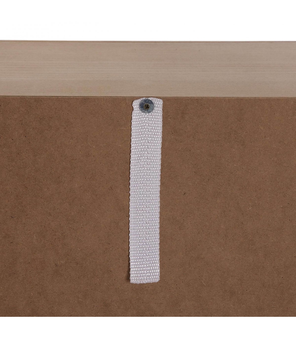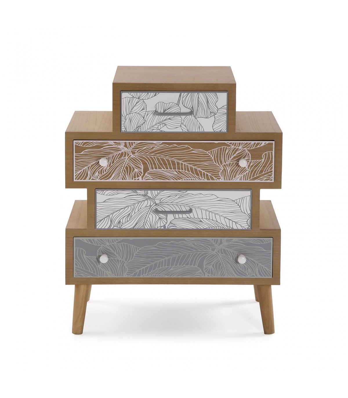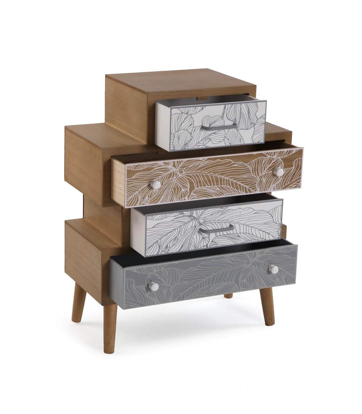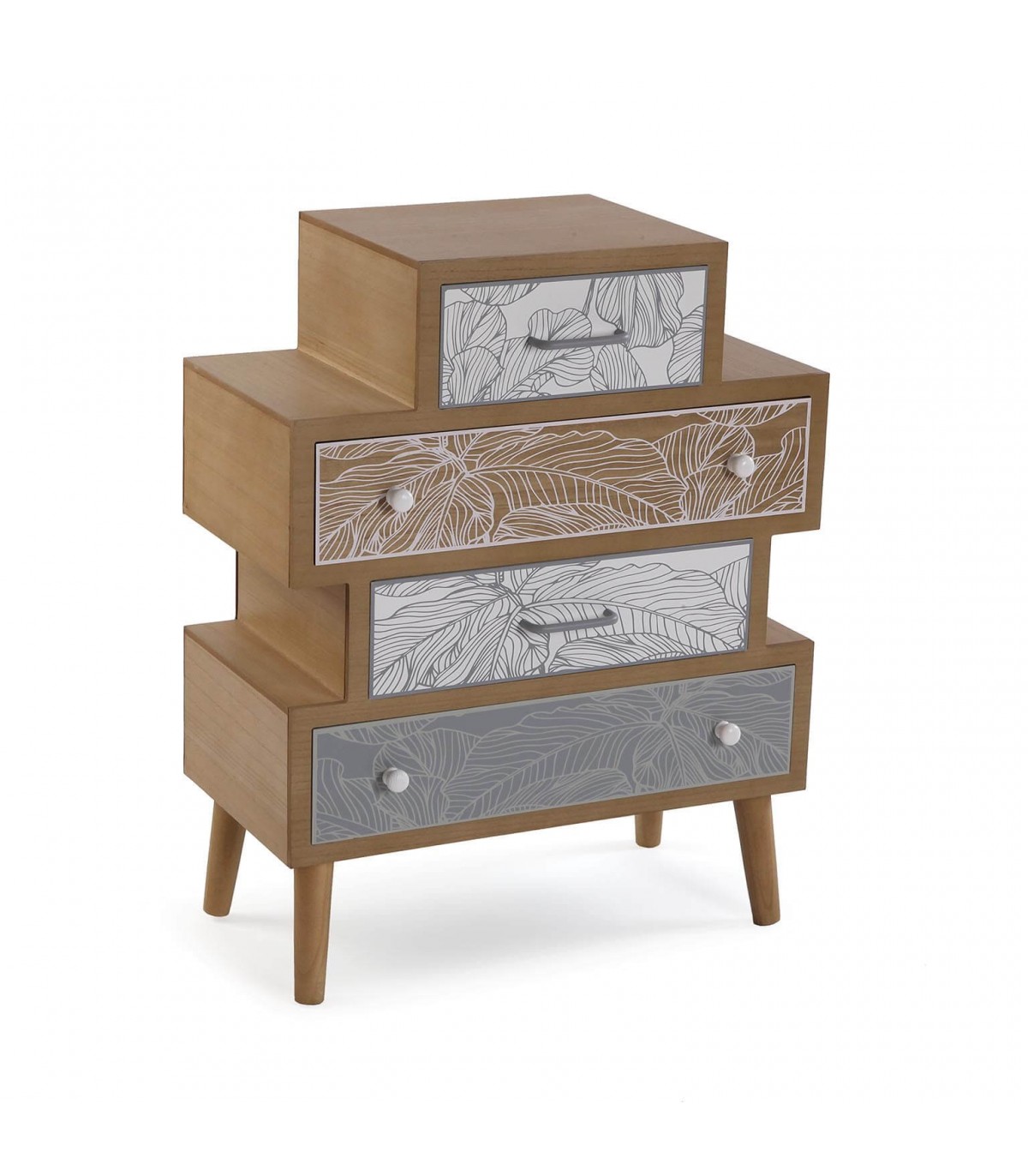 Acabado, madera acabado natural, frente de los cajones serigrafiados en blanco y gris, tiradores en madera blancos y metal grises.