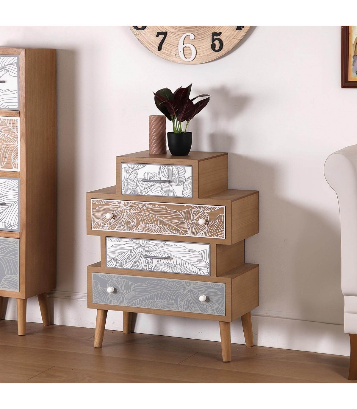 Mesita de noche grande de diseño irregular realizada en madera acabado natural, frente de los cajones serigrafiados en blanco y gris, tiradores en madera blancos y metal grises, perfecta para un dormitorio o como mueble auxiliar, para los que quieren un mueble práctico y decorativo, ideal para darle una nota original decoraciones planas.