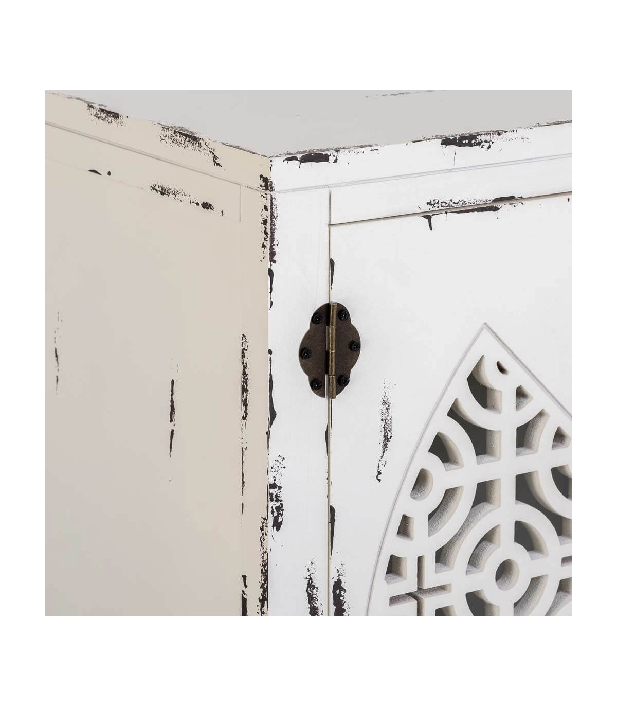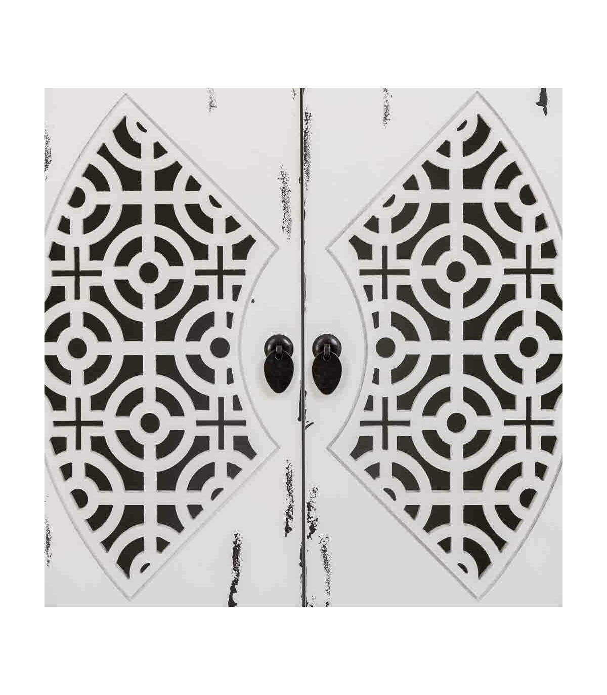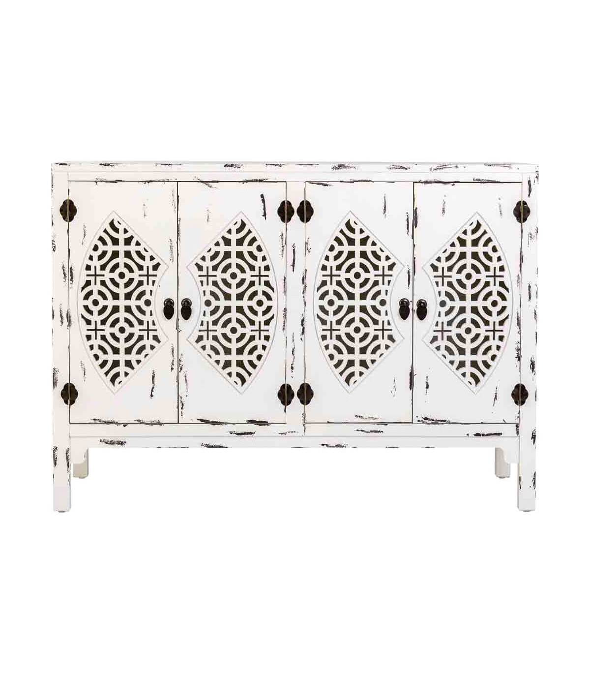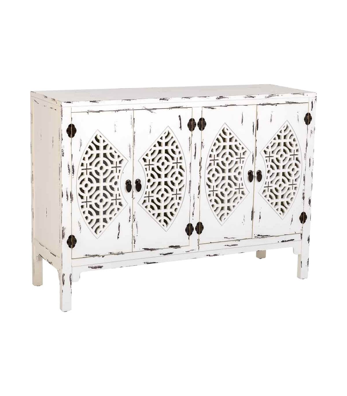 Aporta un toque exótico y elegante a tu hogar con este aparador de estilo oriental. Fabricado en madera de olmo, su diseño artesanal destaca por sus intrincados relieves en las puertas y su acabado decapado en blanco roto, que resalta su carácter vintage. Equipado con 4 puertas y tiradores de bronce, ofrece un amplio espacio de almacenamiento, perfecto para salones, comedores o recibidores con encanto.