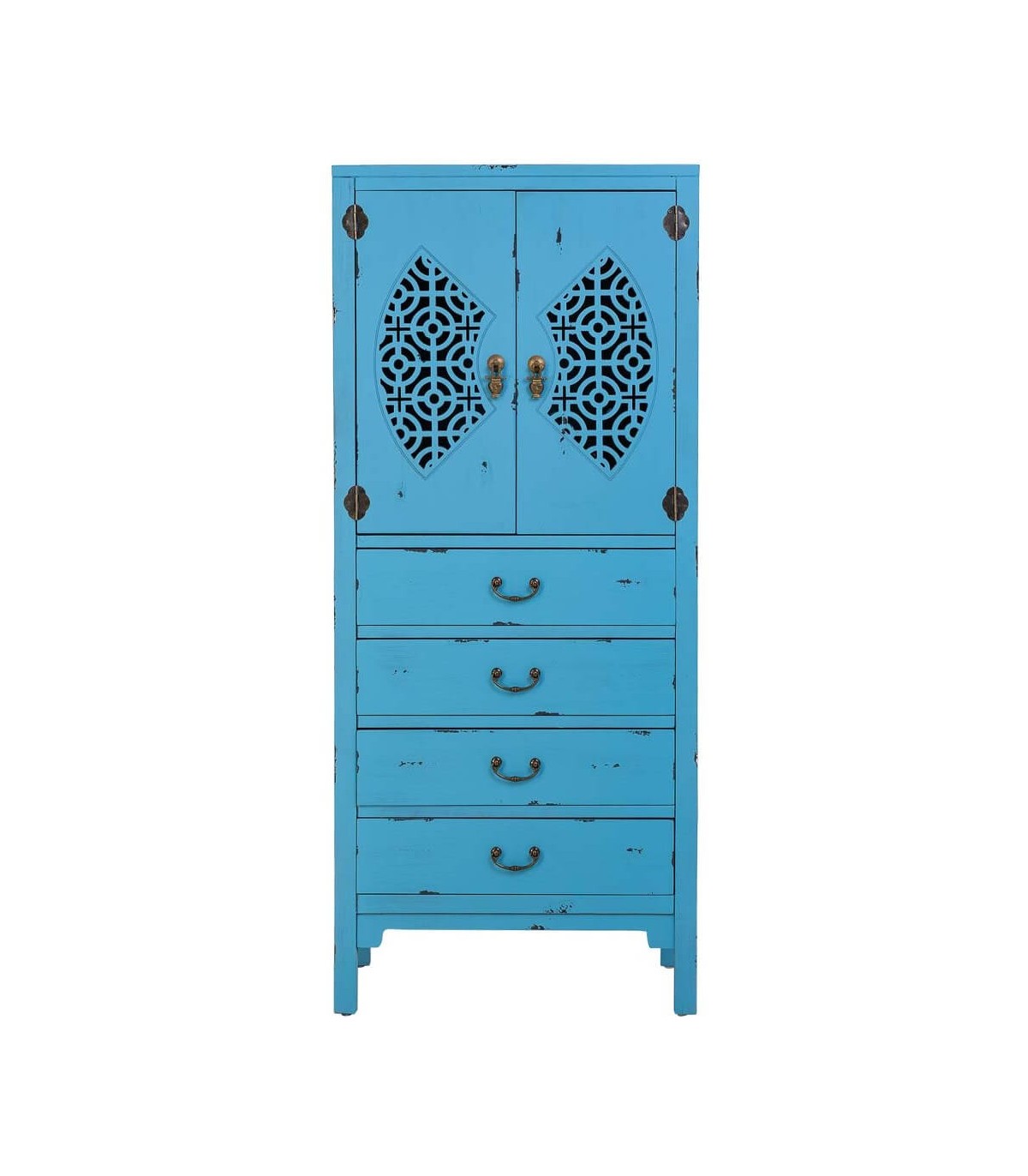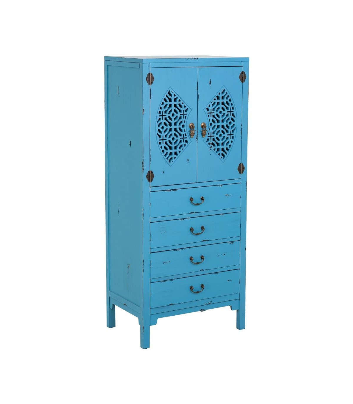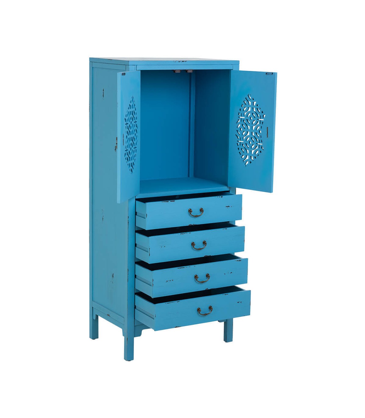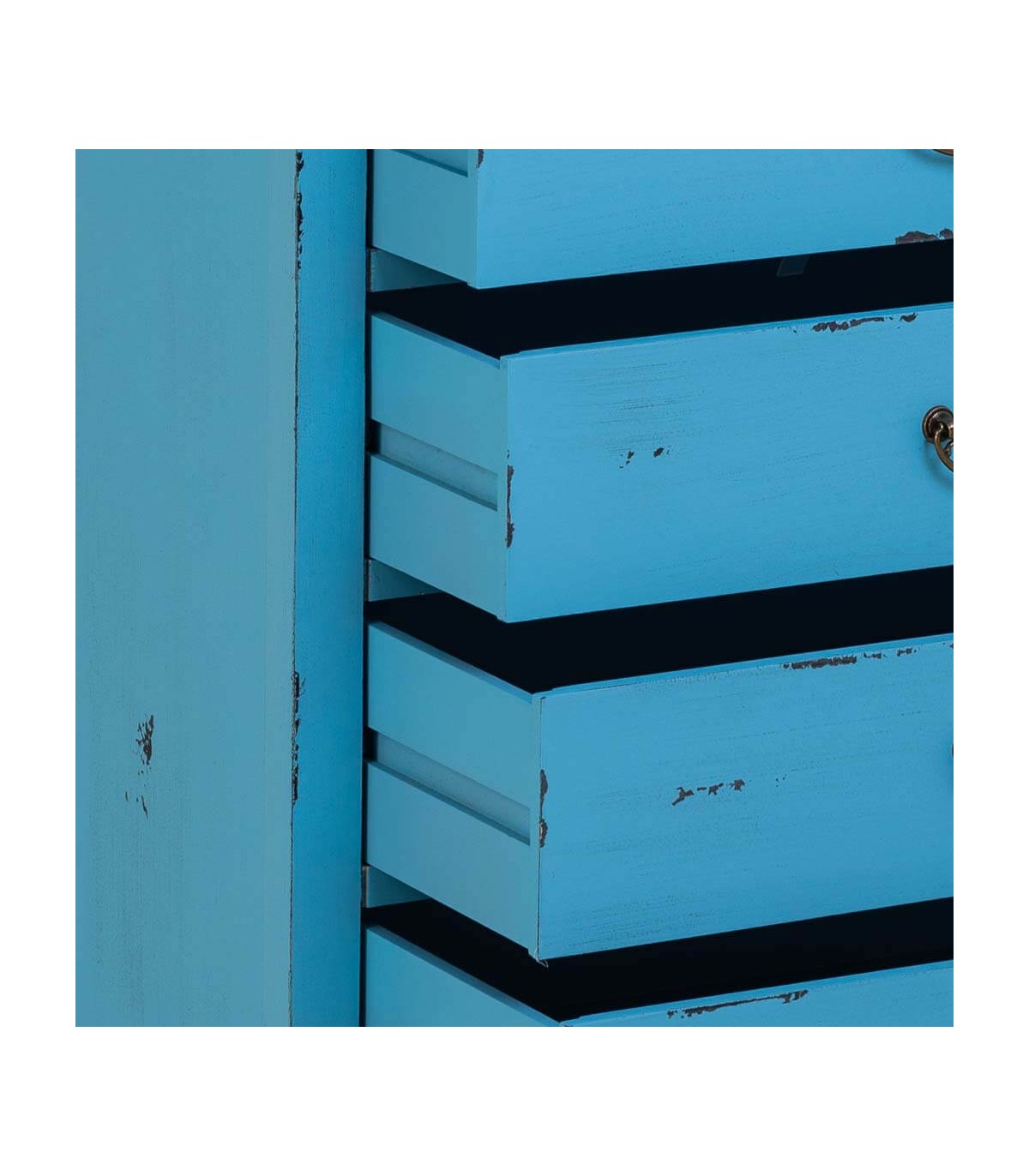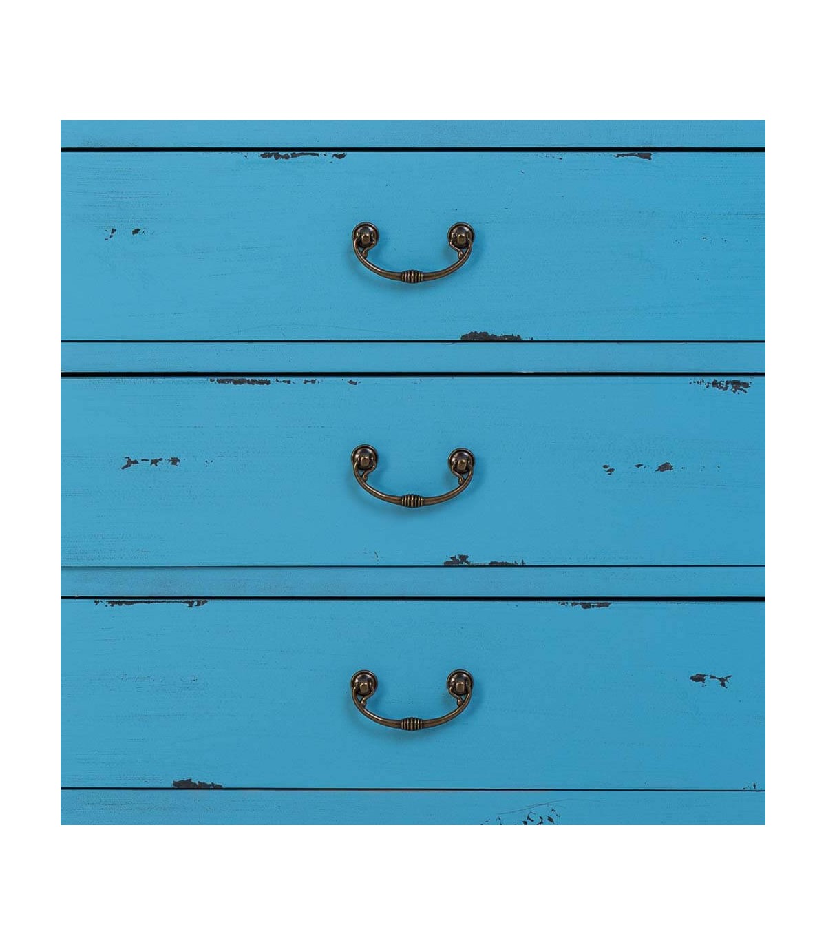 Fabricado en madera maciza de olmo, su acabado en azul envejecido con efecto decapado le otorga un carácter vintage. Los tiradores de bronce antiguo complementan su estética, convirtiéndolo en una pieza exclusiva ideal para salones, comedores o dormitorios con estilo oriental, boho o vintage.