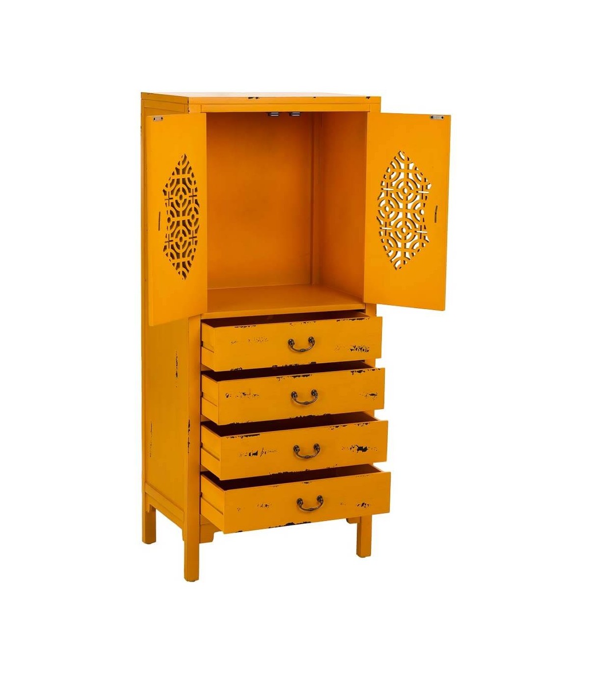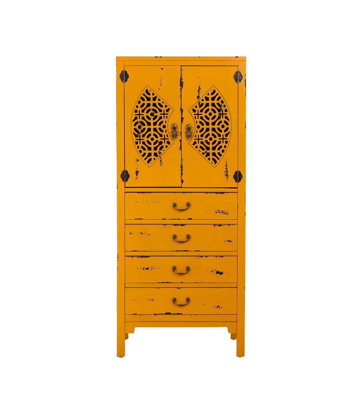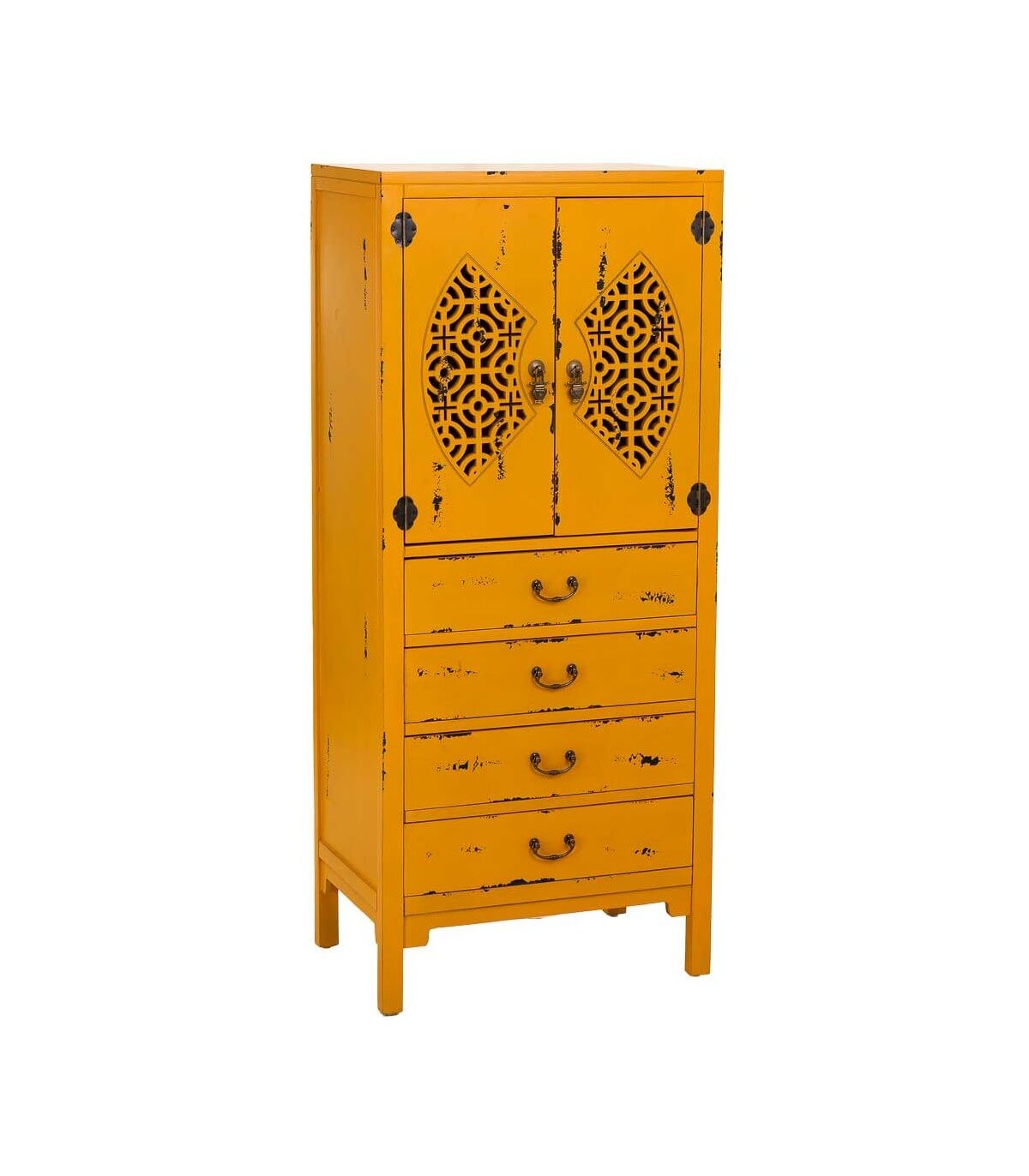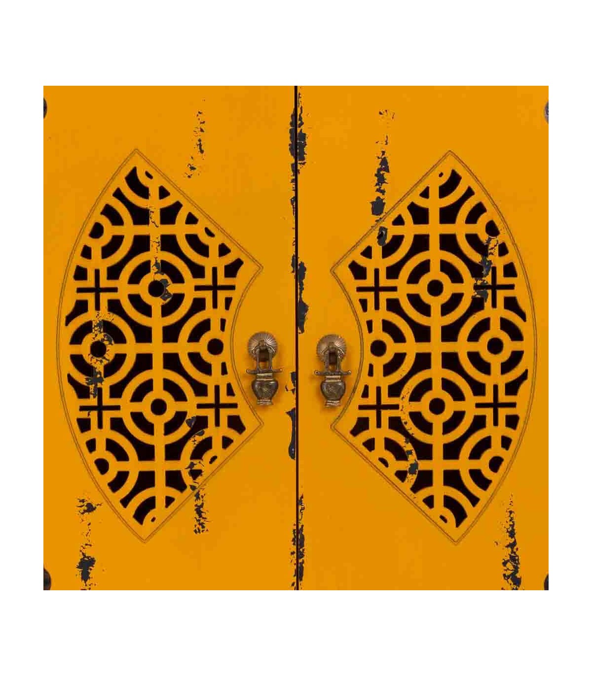 Dale un toque exótico y sofisticado a tu hogar con este elegante armario alacena de inspiración oriental. Fabricado en madera de olmo y trabajado artesanalmente, destaca por su vibrante acabado en amarillo envejecido con detalles tallados en sus puertas.