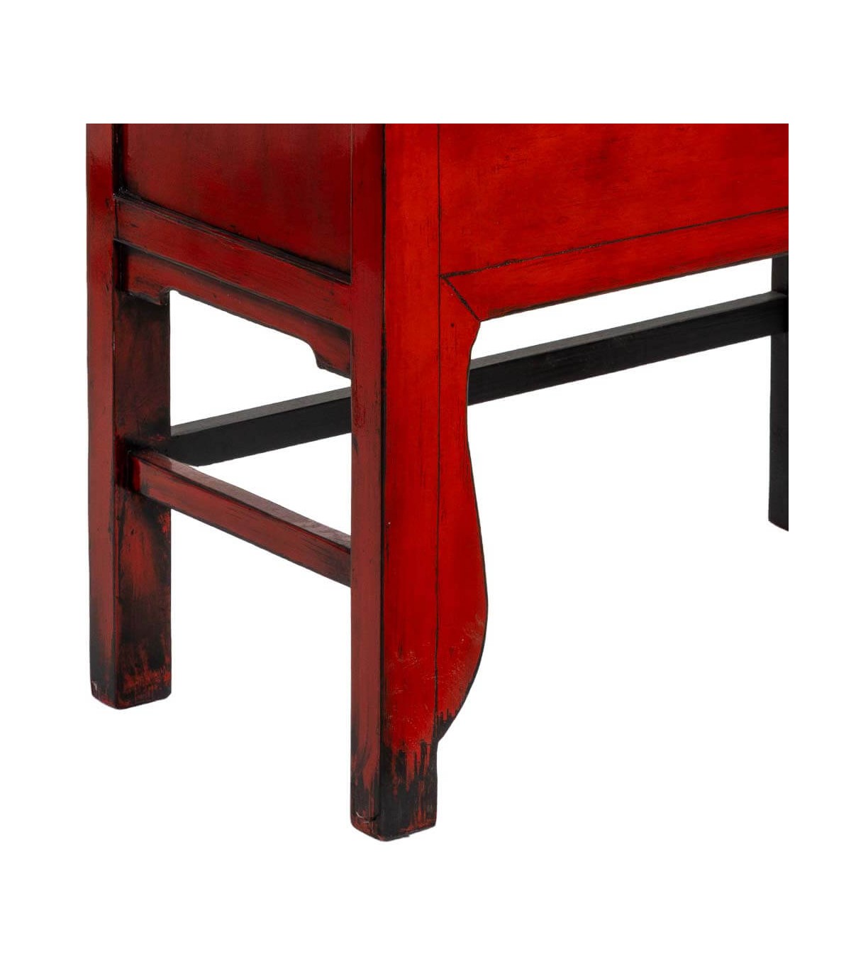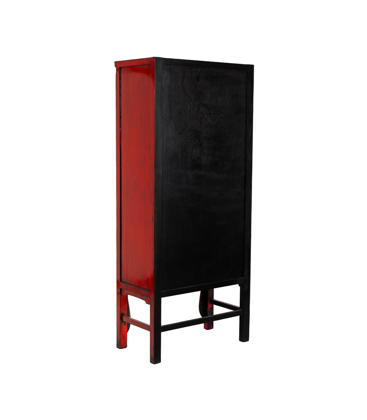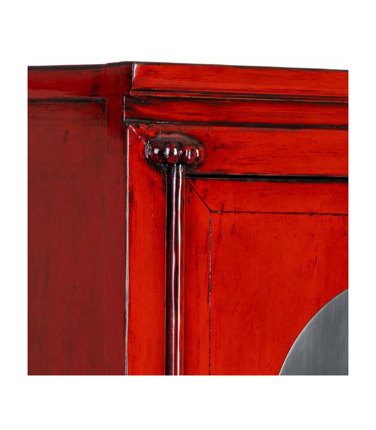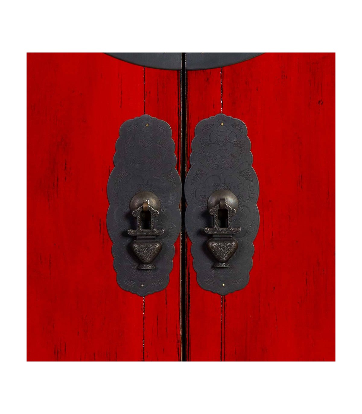 Este armario alacena destaca por su presencia escultórica y su acabado rojo lacado artesanalmente, que aporta la intensidad característica del estilo oriental tradicional. Sus dos puertas enmarcan un gran herraje frontal patinado en negro, añadiendo un aire ceremonial que convierte la pieza en un punto focal dentro del salón, comedor o recibidor.