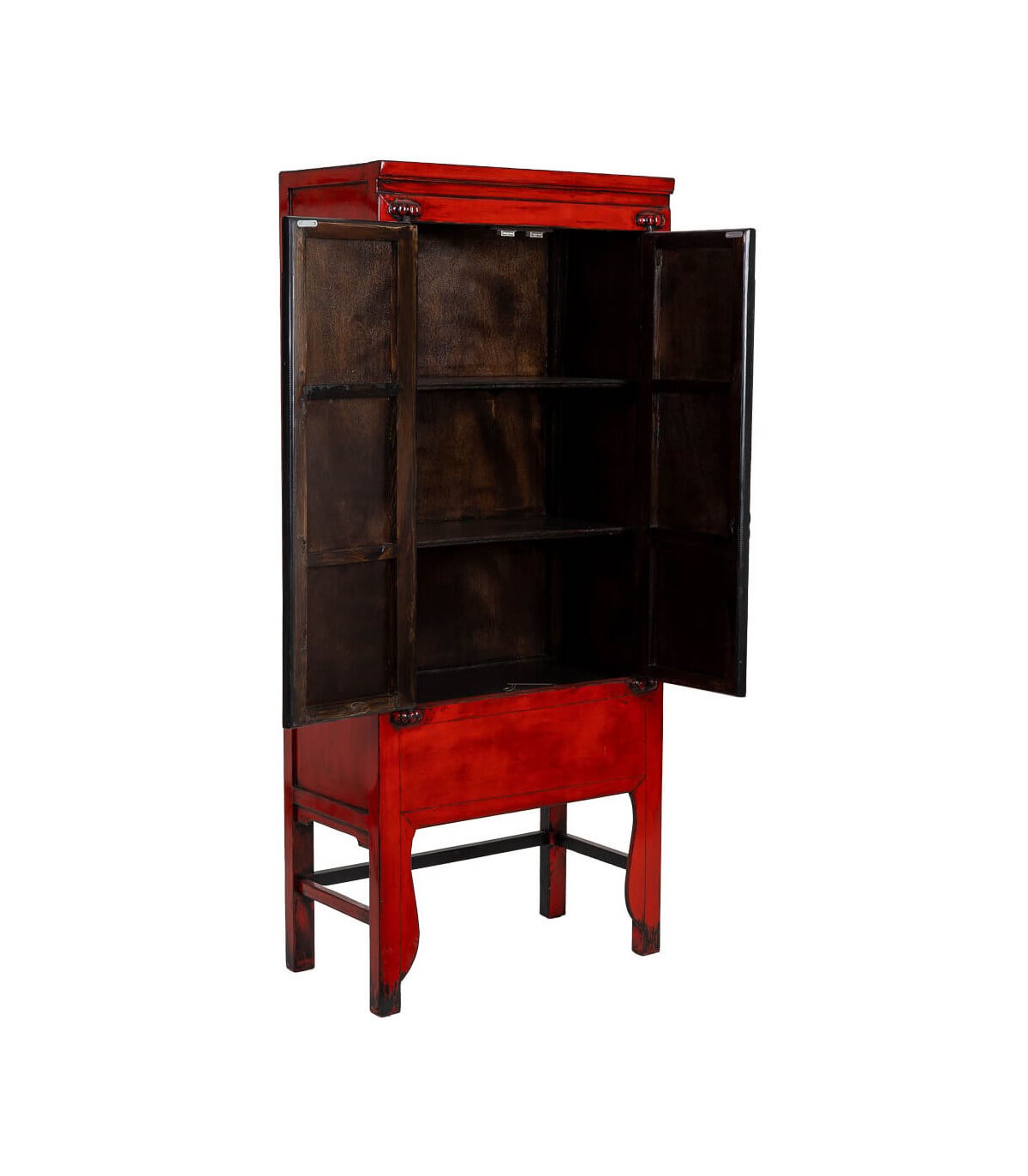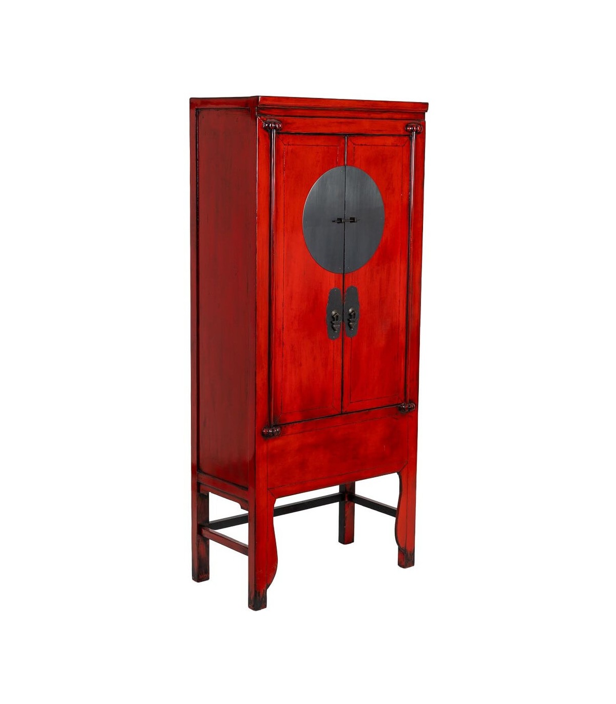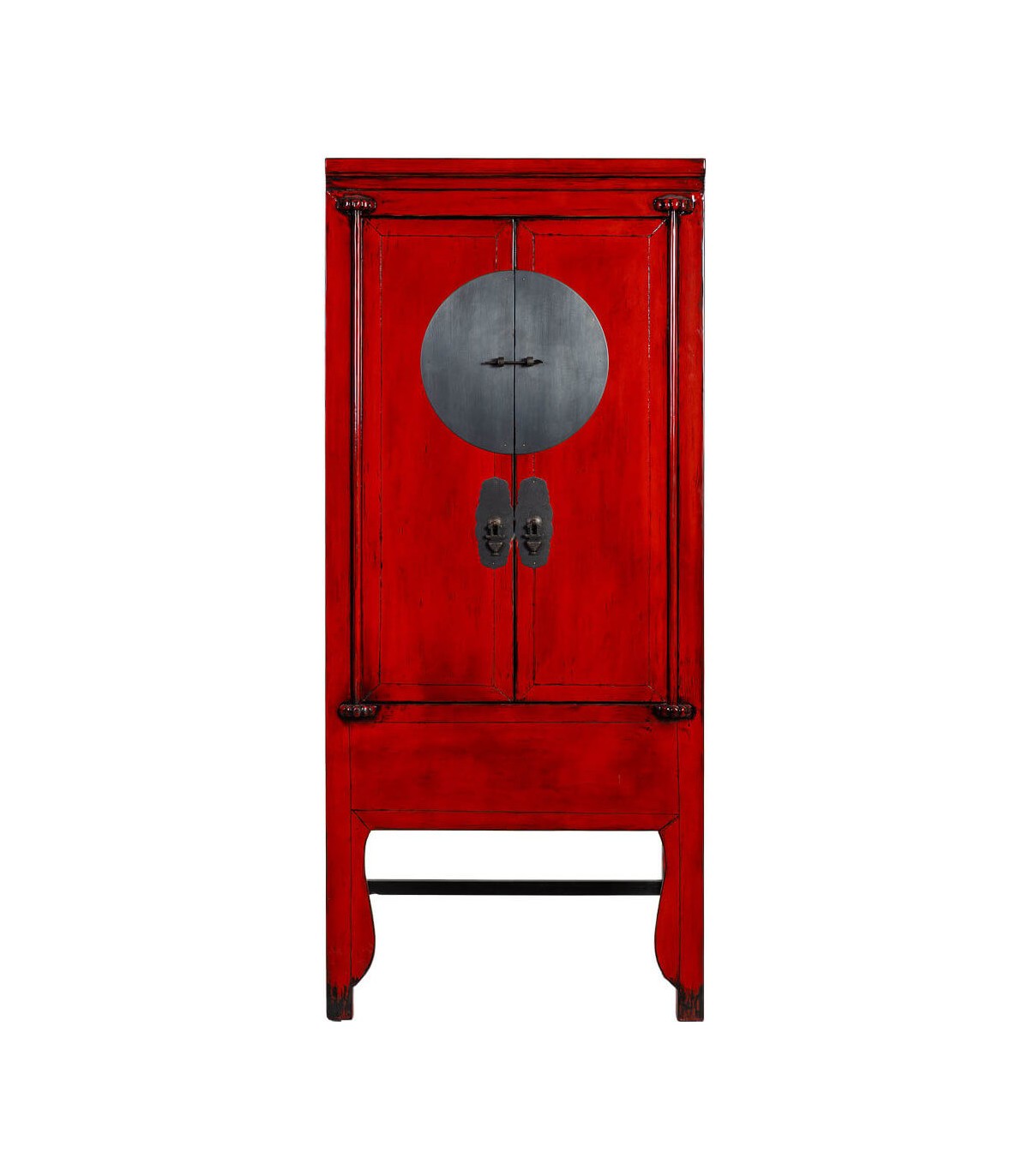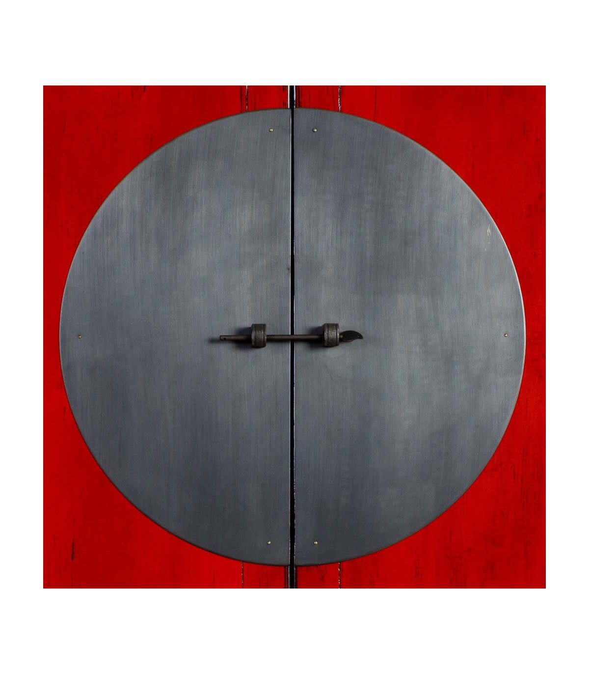 Este armario alacena destaca por su presencia escultórica y su acabado rojo lacado artesanalmente, que aporta la intensidad característica del estilo oriental tradicional. Sus dos puertas enmarcan un gran herraje frontal patinado en negro, añadiendo un aire ceremonial que convierte la pieza en un punto focal dentro del salón, comedor o recibidor.