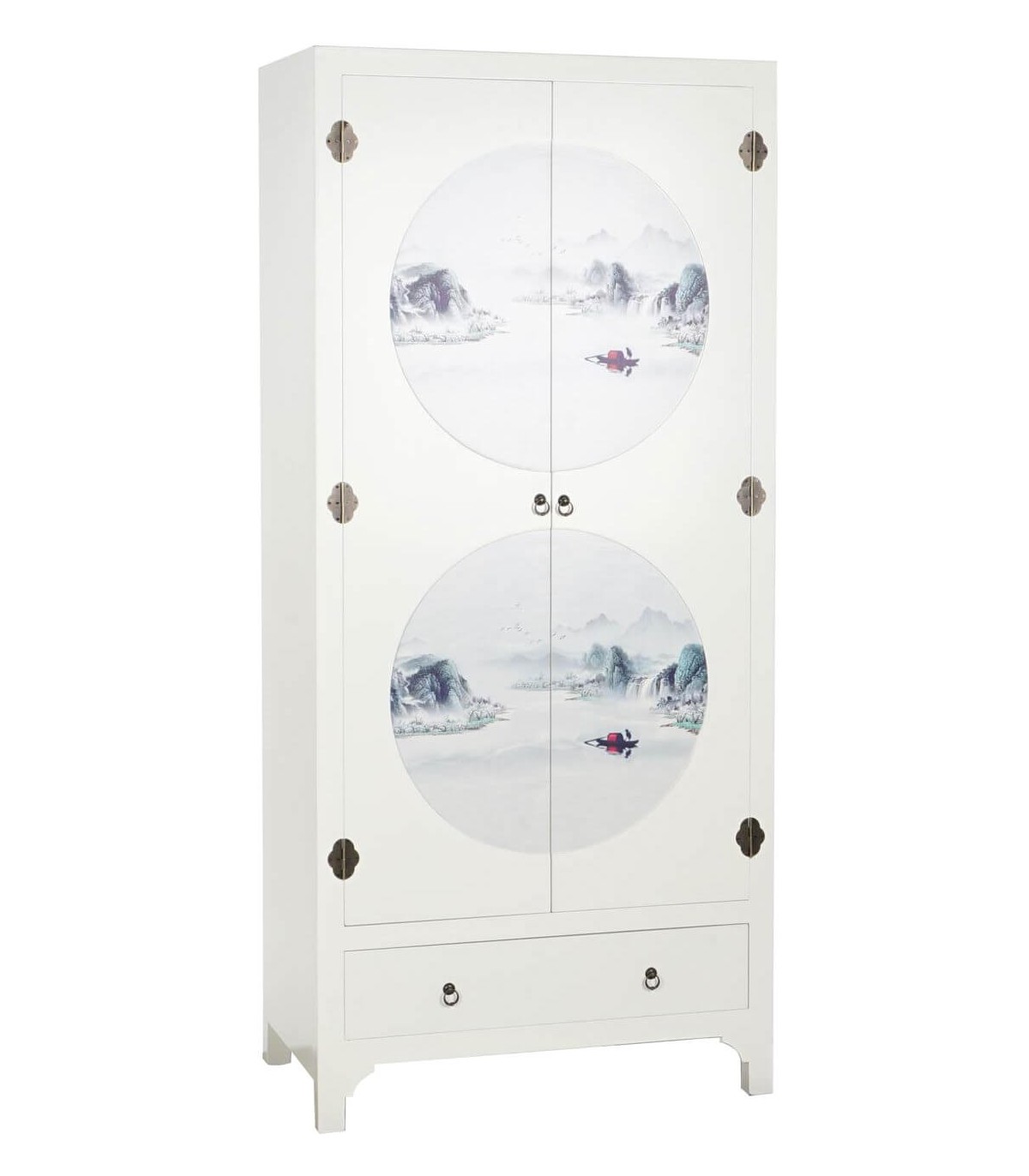 Armario ropero, de estilo oriental lacado en blanco con 2 círculos paisajistas, de buena capacidad, muy practico perfecto para tu dormitorio o una entrada.