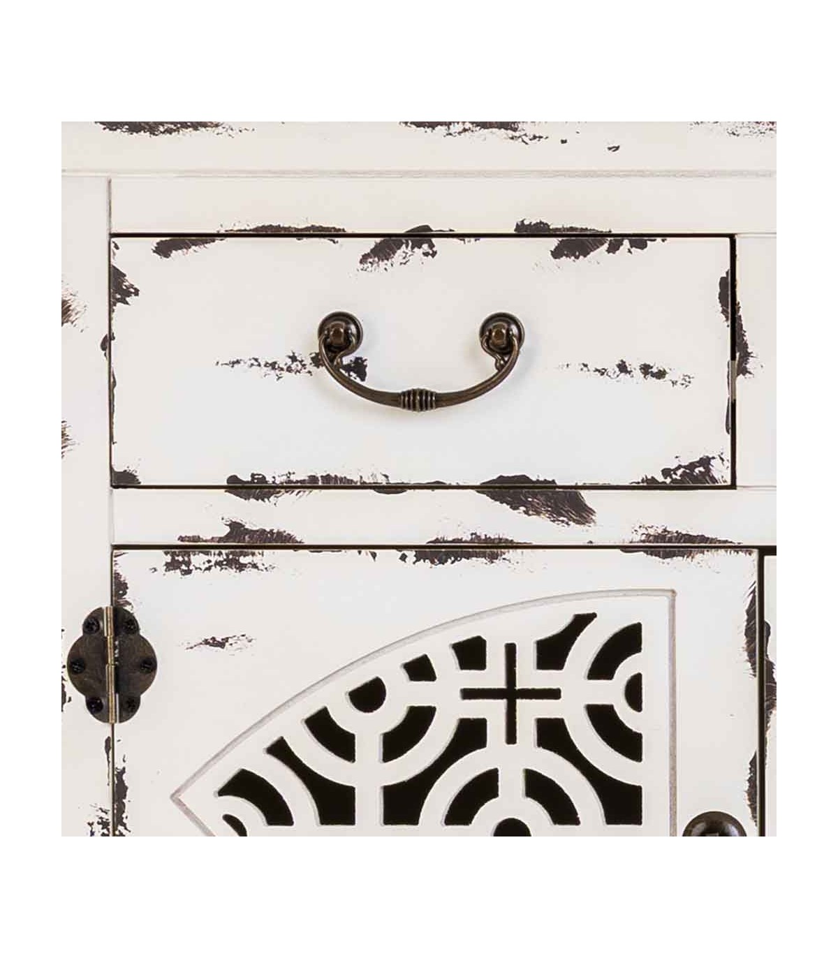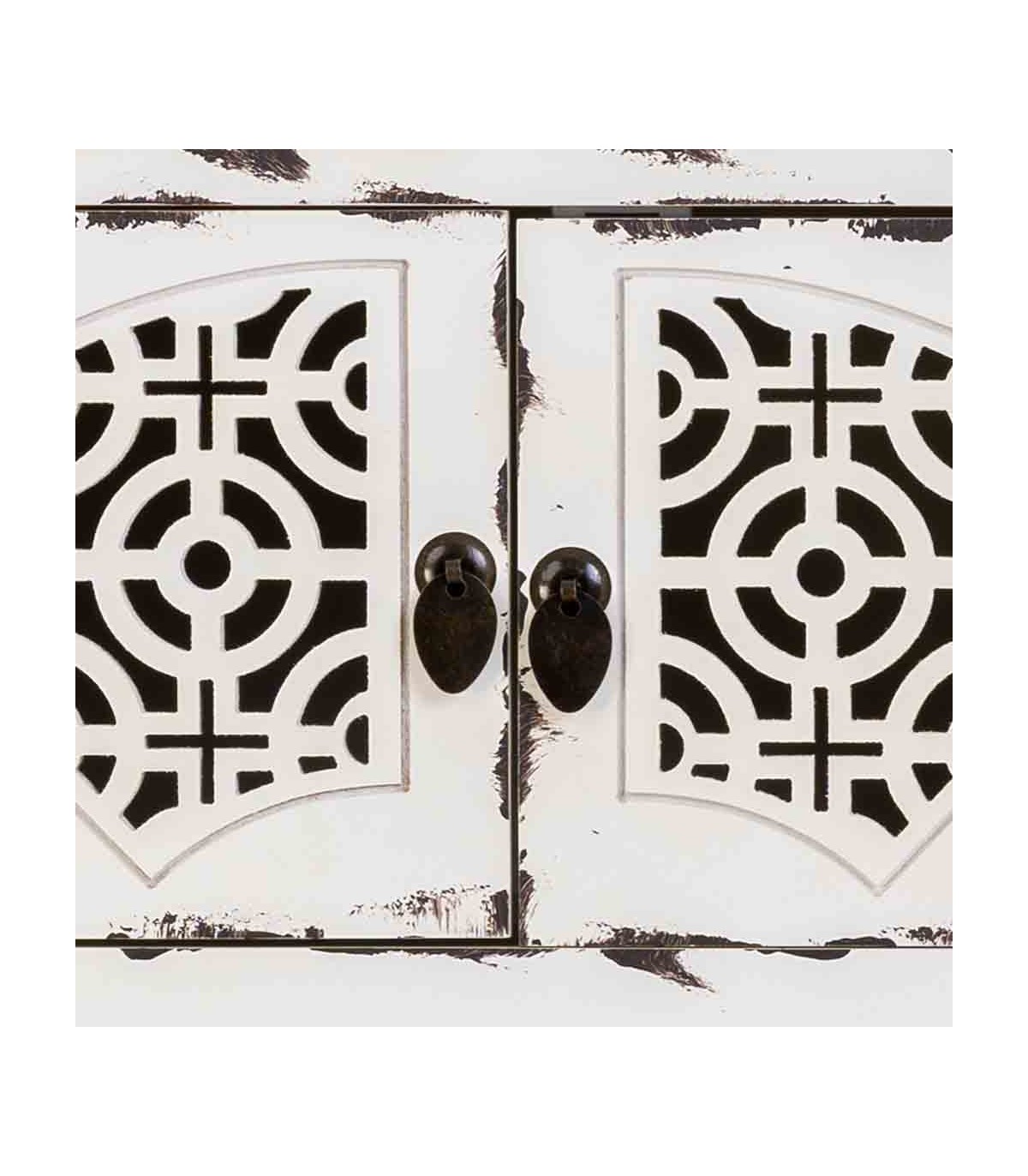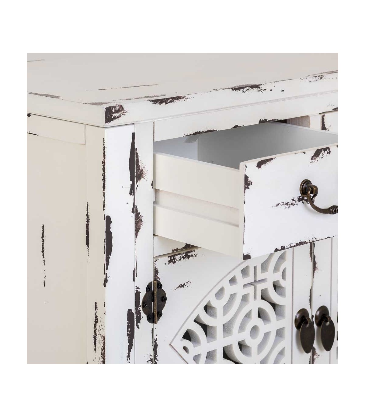 Acabado, frente de las puertas talladas a mano, decapado en color blanco, tiradores de bronce. Fabricación artesanal. entendemos las variaciones de tonalidad, tamaño y forma o ciertas imperfecciones (grietas, nudos, marcas) como un valor añadido que la convierten en pieza única.
