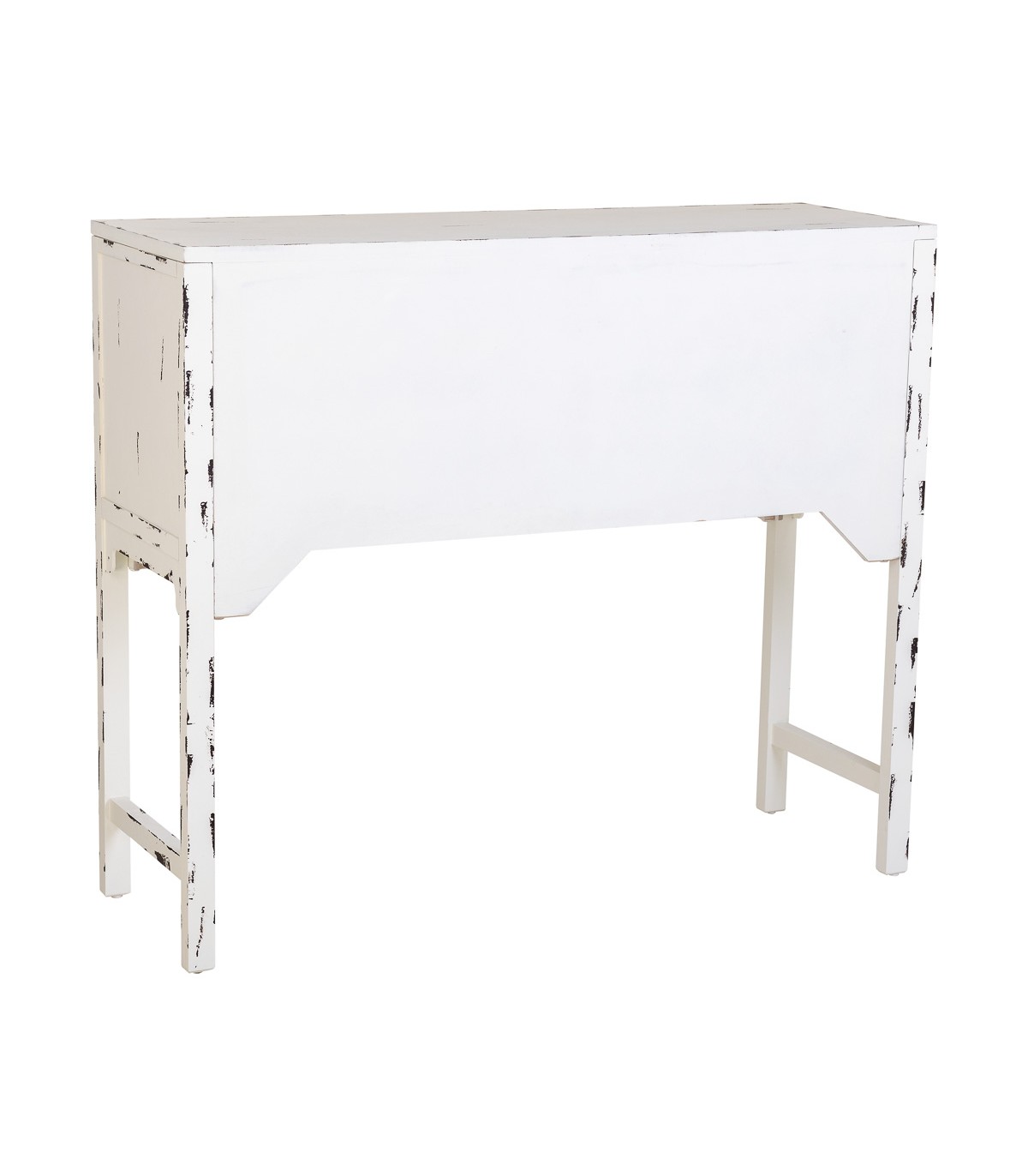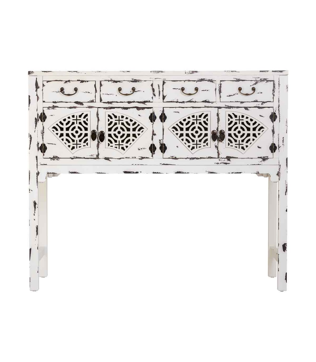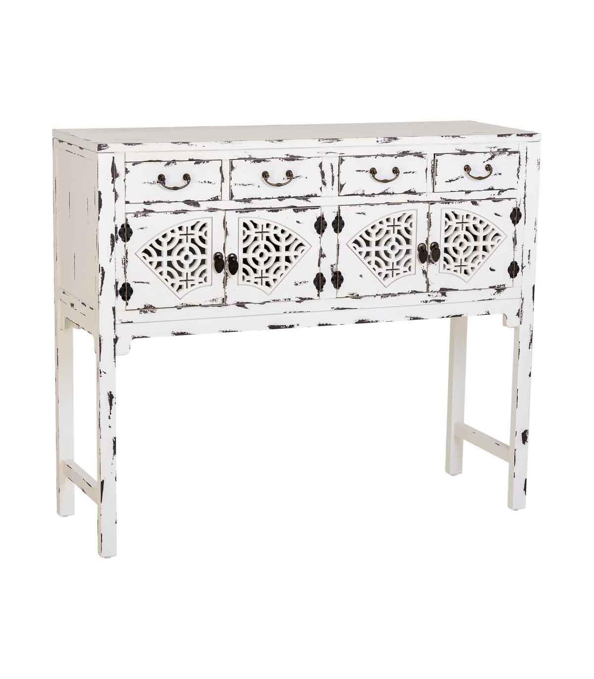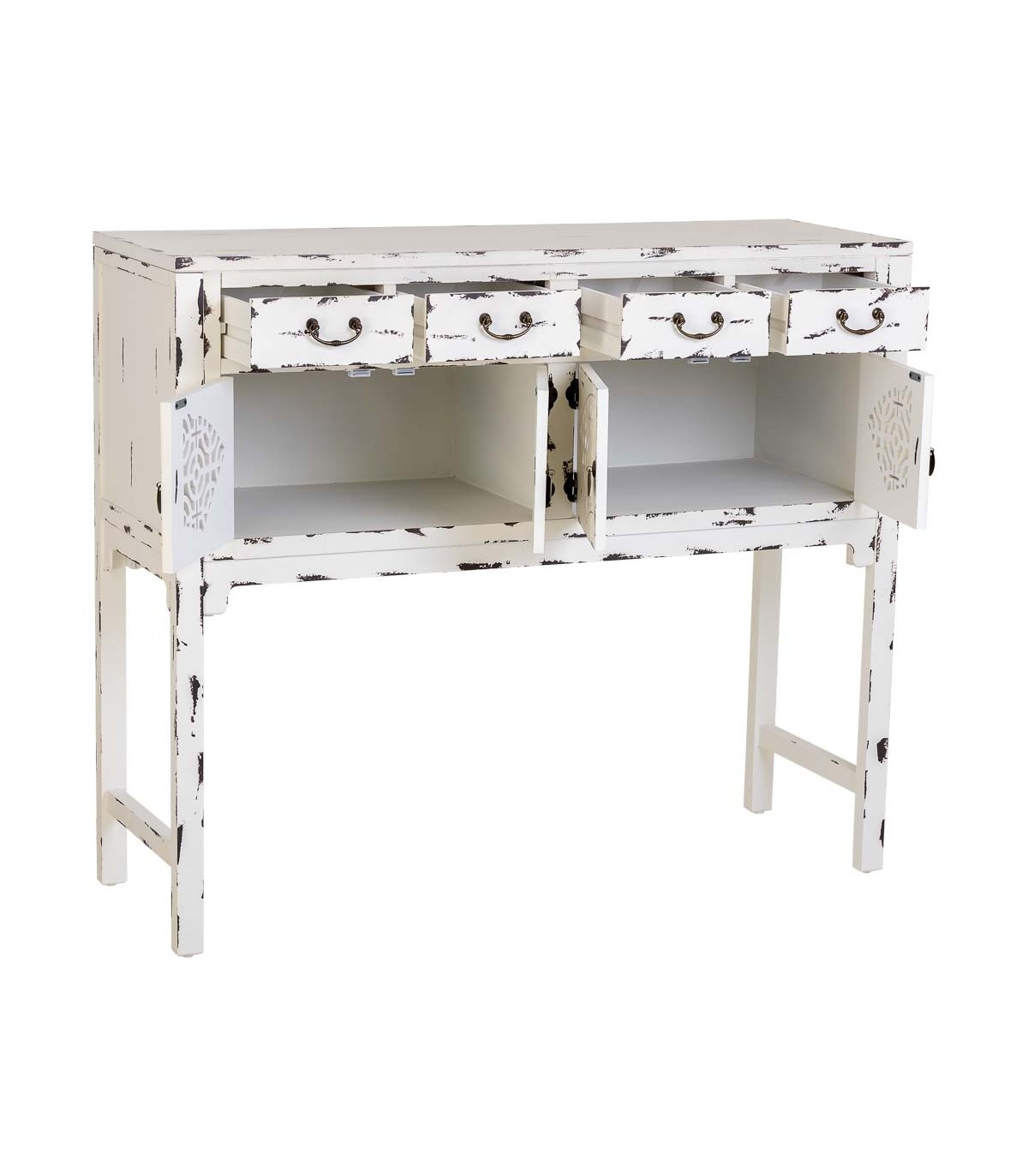 Aporta un toque exótico y elegante a tu hogar con esta consola de entrada grande, fabricada en madera tallada y decapada en blanco. Su diseño oriental y su acabado artesanal la convierten en una pieza decorativa exclusiva.