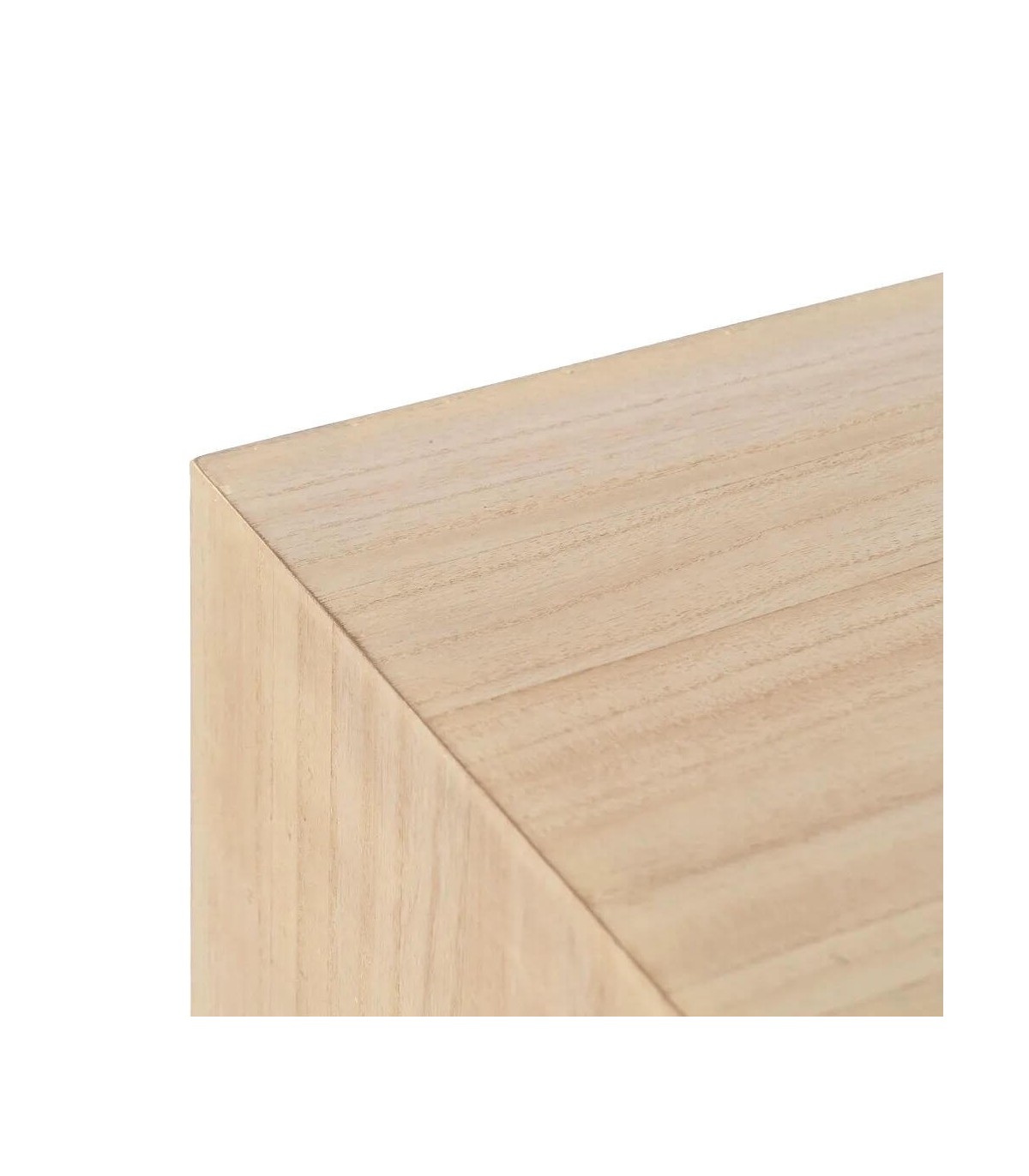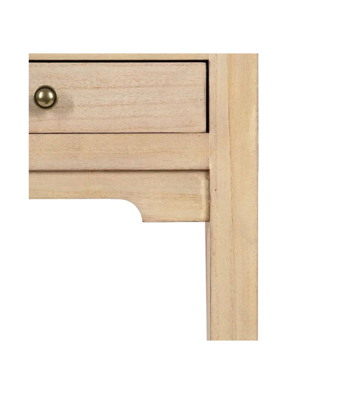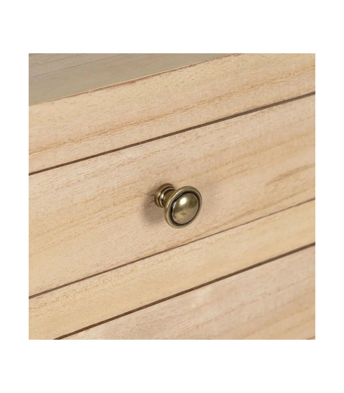 Fabricada en madera de paulonia y DM, su acabado en tono natural resalta la belleza de la madera, combinando a la perfección con los tiradores en metal bronce para un toque sofisticado y atemporal. Ideal para entradas, pasillos o cualquier rincón que necesite un mueble con estilo.