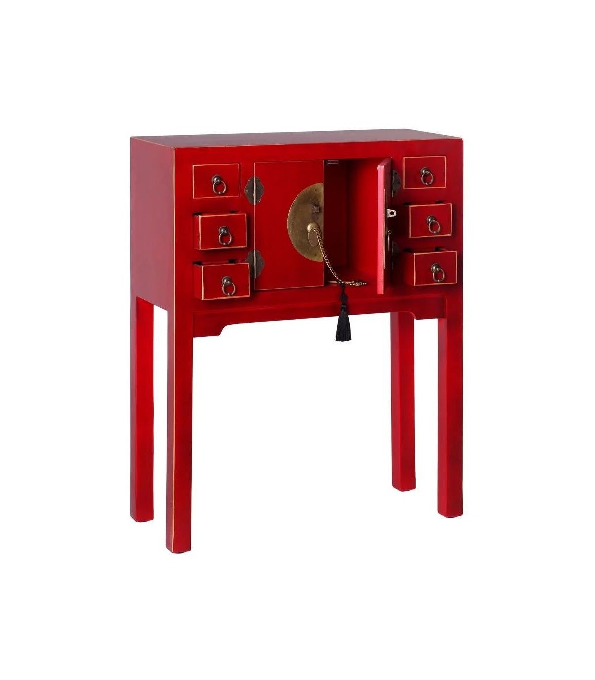 Consola de entrada pequeña de estilo oriental lacada en rojo perfilada en oro y unos tiradores característicos de su estilo en acabado bronce, una consola muy práctica y decorativa.