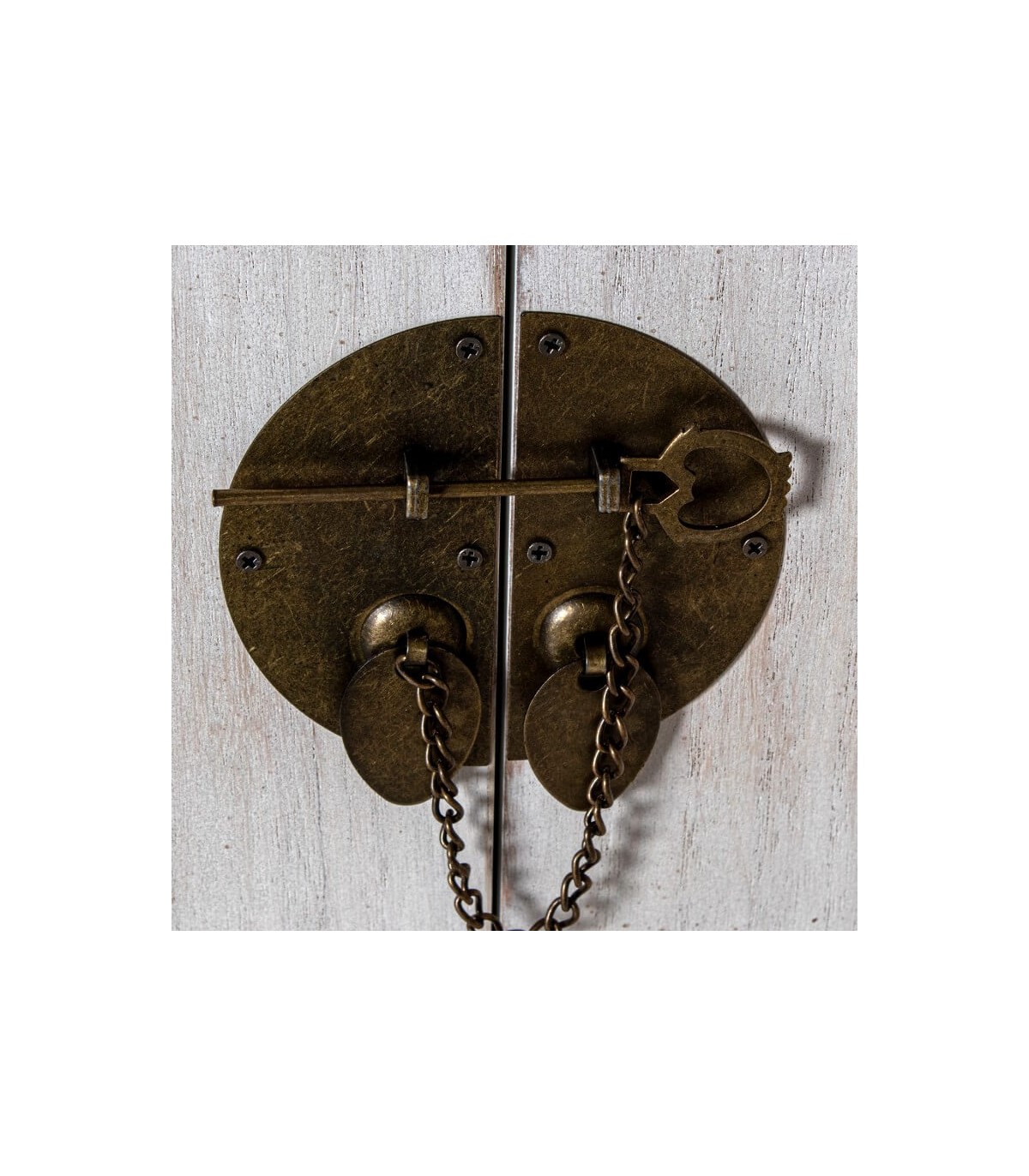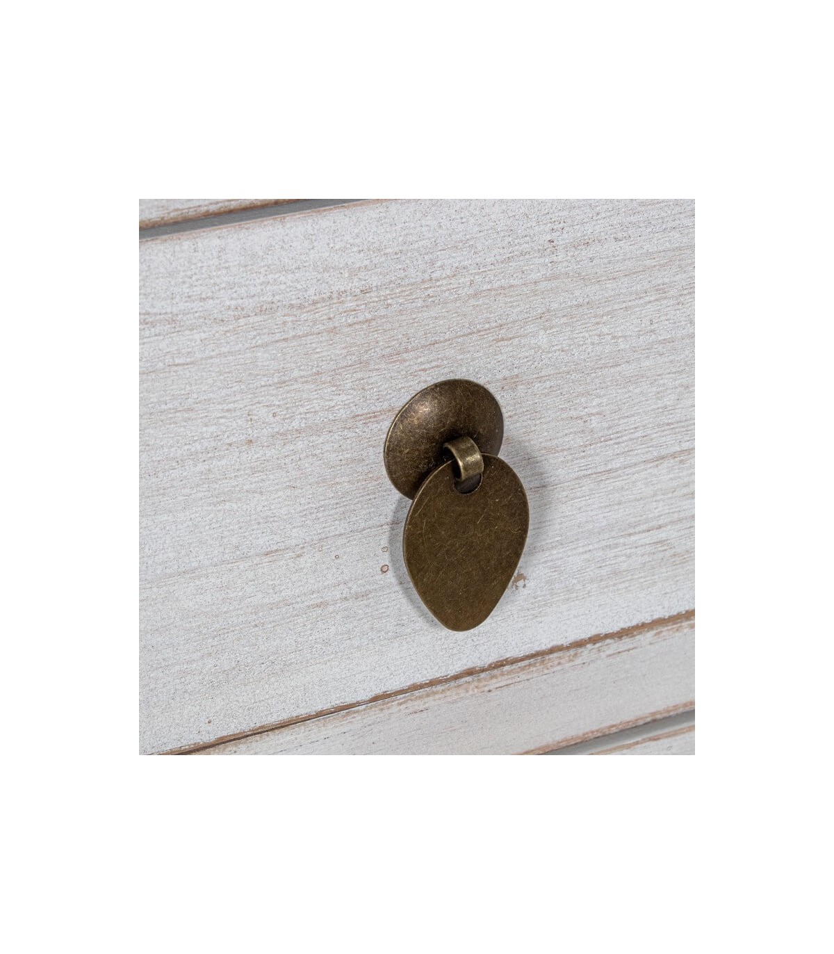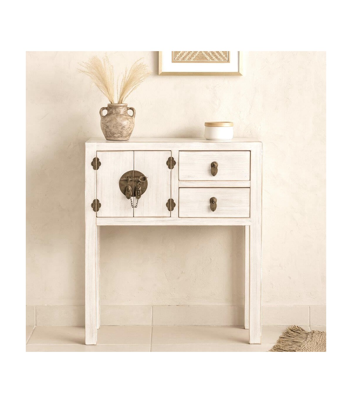 Esta consola de entrada fusiona líneas rectas con herrajes orientales para ofrecer un diseño equilibrado, sobrio y con personalidad. Su acabado en madera blanqueada aporta luminosidad y textura, mientras que los detalles metálicos en bronce patinado evocan tradición y elegancia exótica.