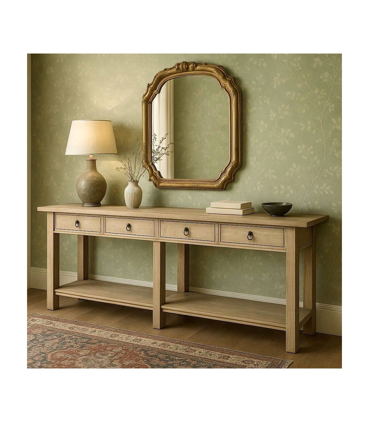 Consola de entrada XXL fabricada en madera maciza de pino con acabado natural que resalta su veta y textura. Diseño de líneas depuradas que combina la calidez de la madera con la solidez del metal negro en los tiradores. Dispone de cuatro amplios cajones y un estante inferior que aportan funcionalidad sin perder equilibrio estético.