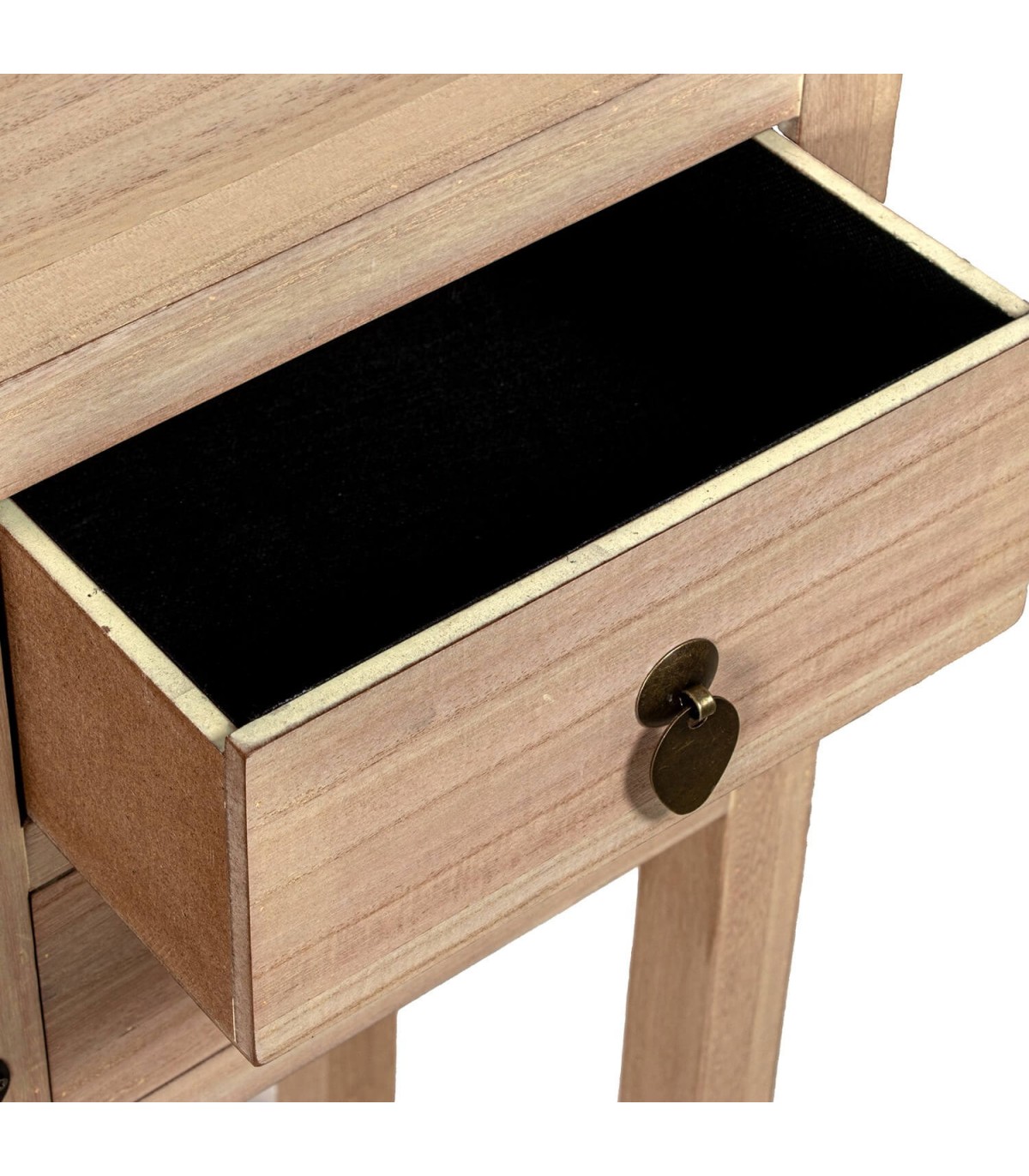 Dos puertas frontales con herrajes de bronce patinado evocan un aire exótico y guardan pequeños objetos con discreción. Los cajones superiores facilitan organizar llaves o documentos, manteniendo el espacio ordenado con un toque elegante. El formato compacto y las líneas depuradas permiten integrarla en recibidores o rincones reducidos con armonía