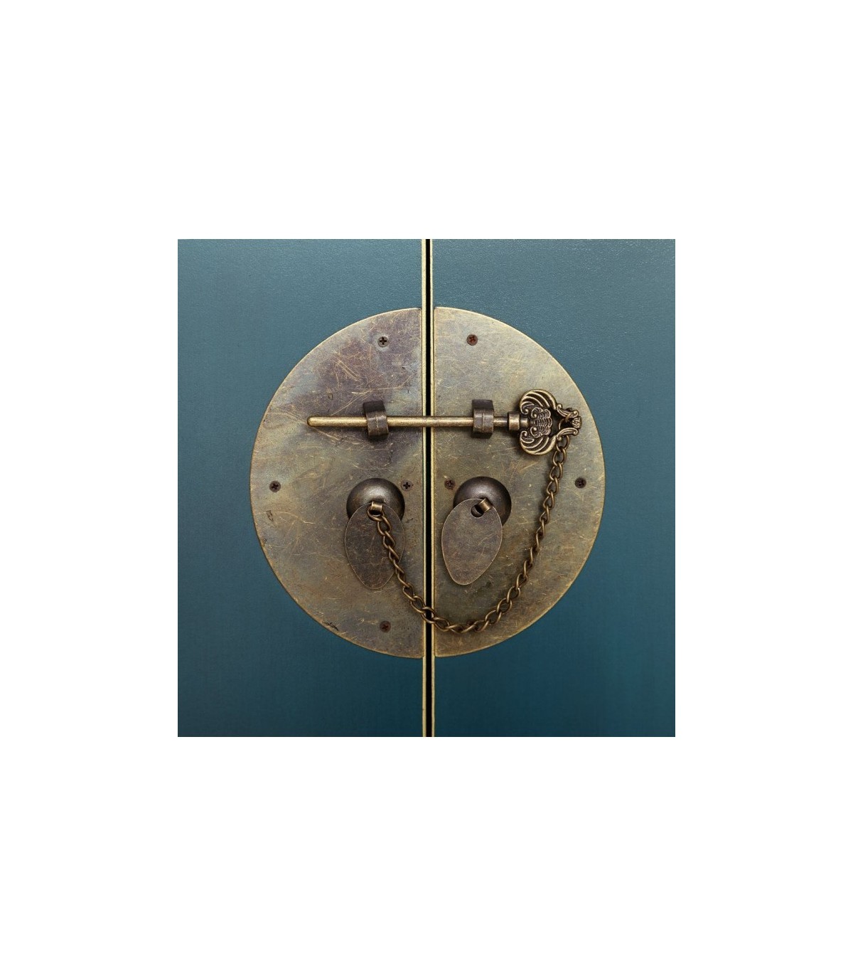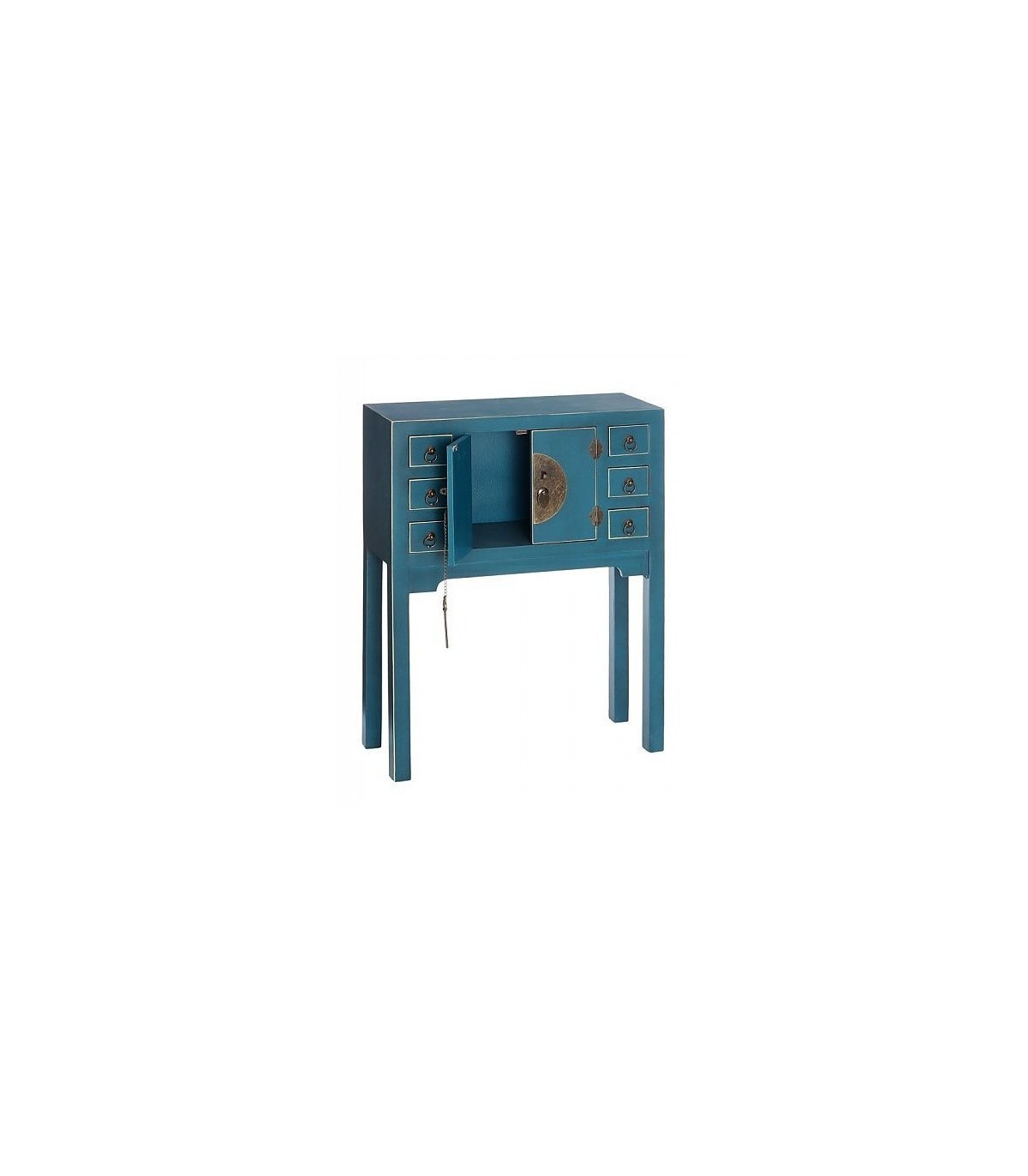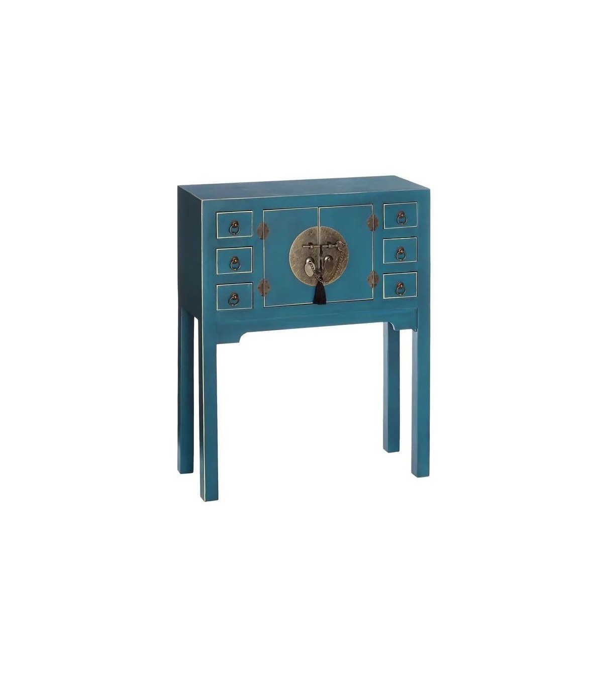 Consola de estilo oriental realizada en madera mdf lacada en azul con los cantos perfilados en oro, con seis cajones y dos puertas, una nota perfecta de color en tu decoración.