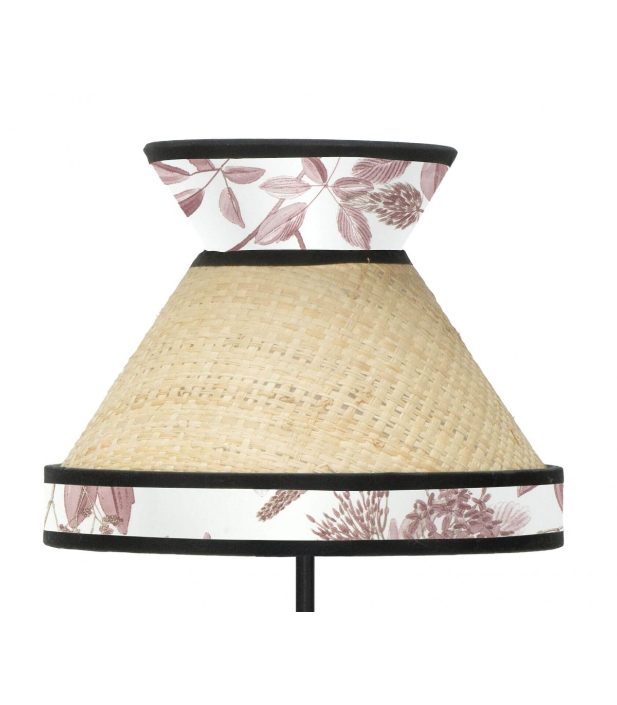 🎨 Acabado: Pie de metal negro mate. Pantalla cónica de ratán trenzado combinada con tela blanca estampada en tonos granate.