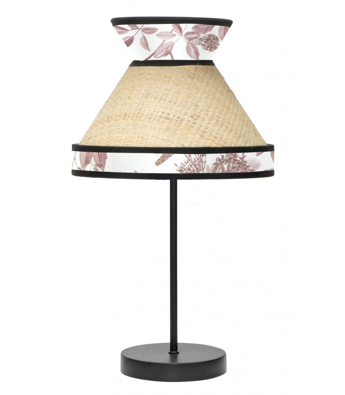 Una lámpara de sobremesa que conquista por su diseño original y equilibrado. Su pantalla cónica de ratán trenzado combina a la perfección con detalles textiles en blanco con estampado floral granate, evocando un estilo oriental con un toque contemporáneo.