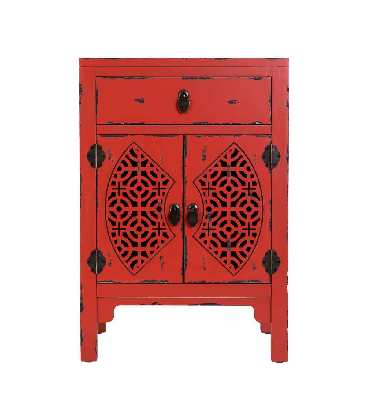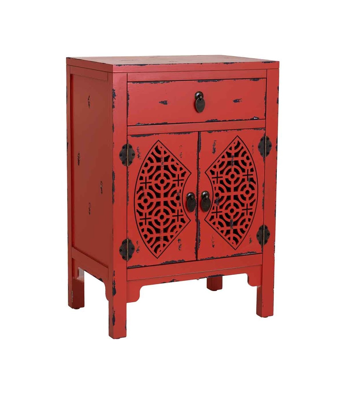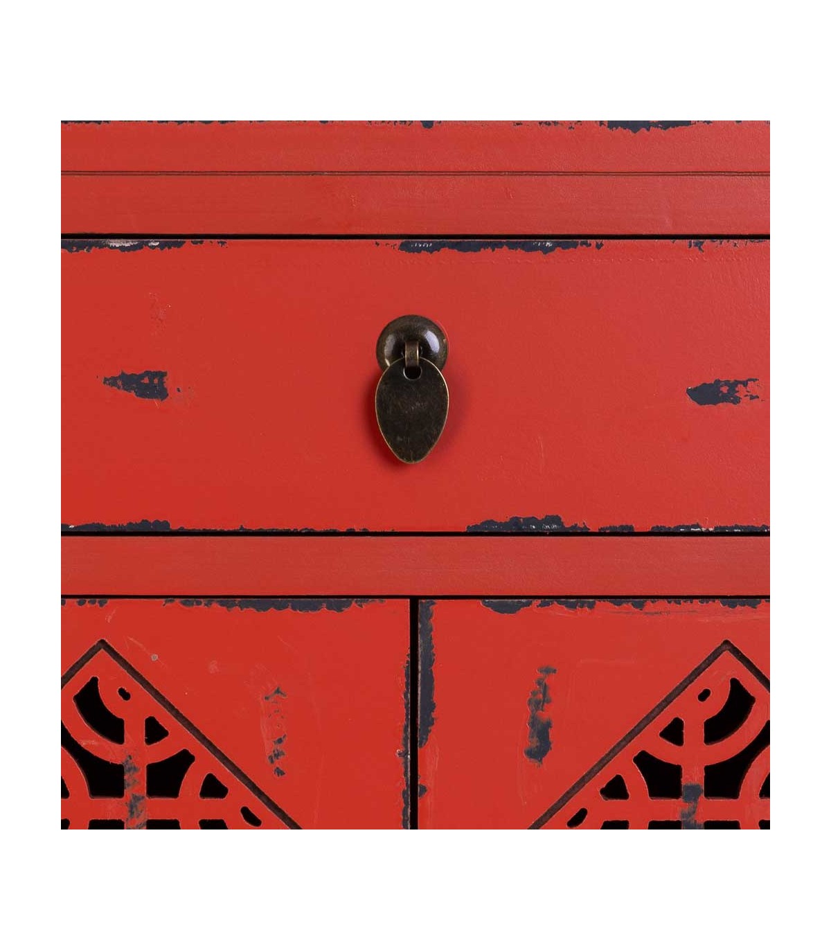 • Aporta un toque exótico y sofisticado a tu dormitorio con esta mesita de noche en madera de olmo decapada en rojo. Su diseño oriental, con detalles calados y herrajes de bronce, le confiere un carácter elegante y artesanal.