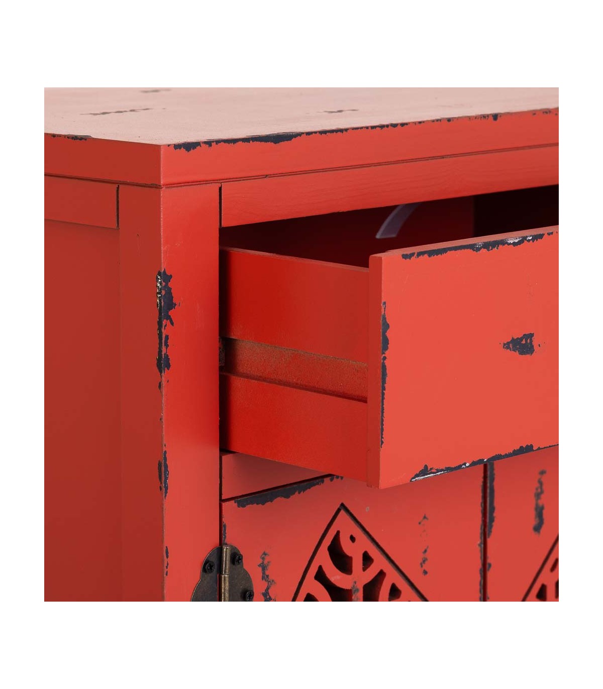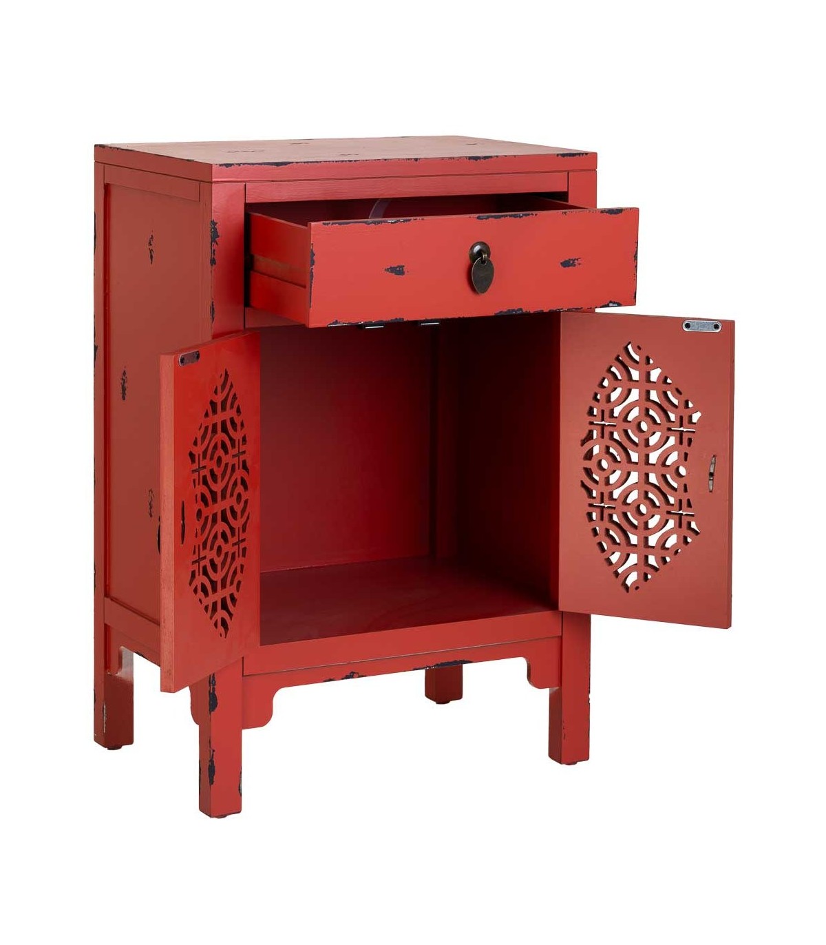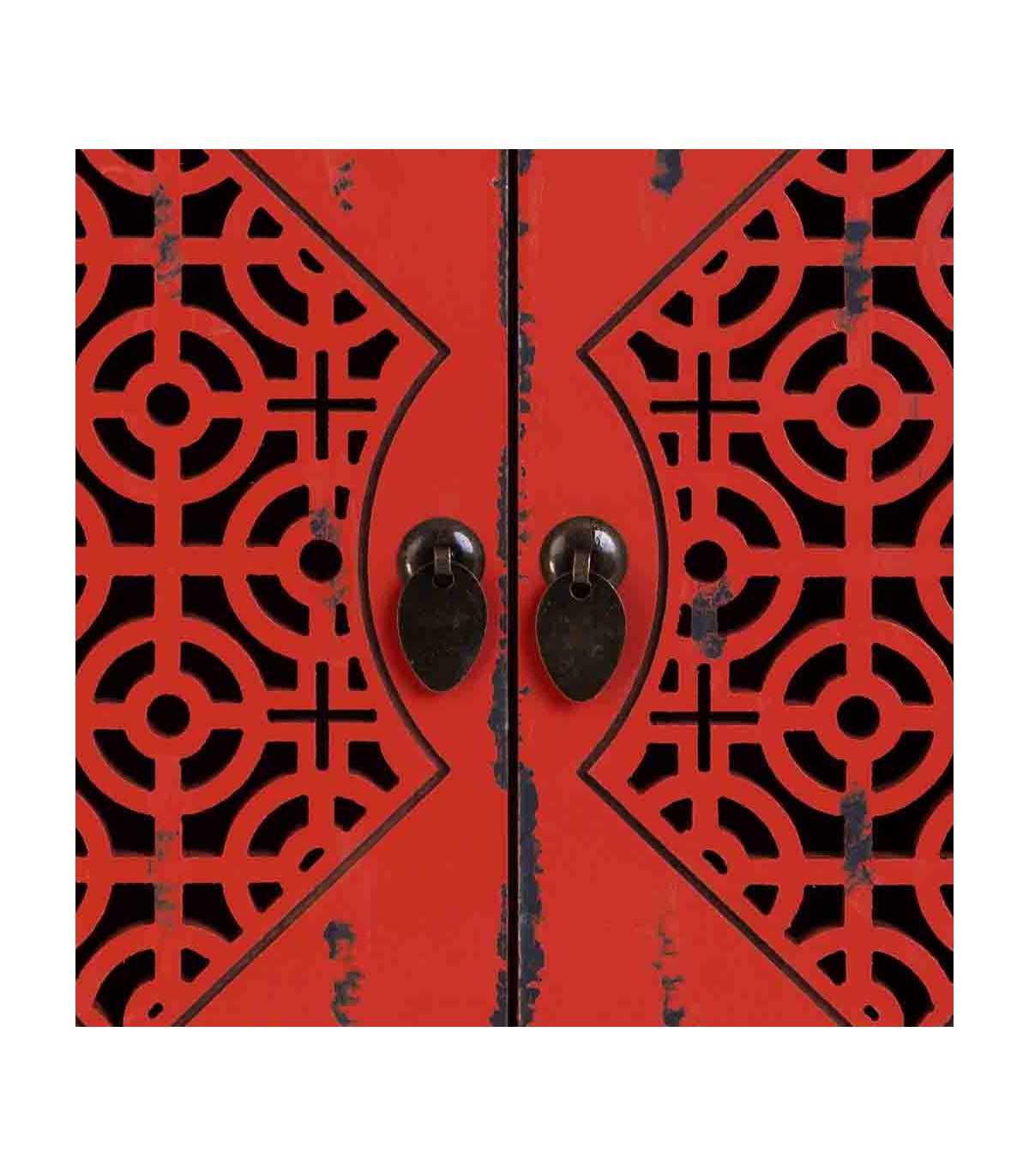 • Aporta un toque exótico y sofisticado a tu dormitorio con esta mesita de noche en madera de olmo decapada en rojo. Su diseño oriental, con detalles calados y herrajes de bronce, le confiere un carácter elegante y artesanal.
