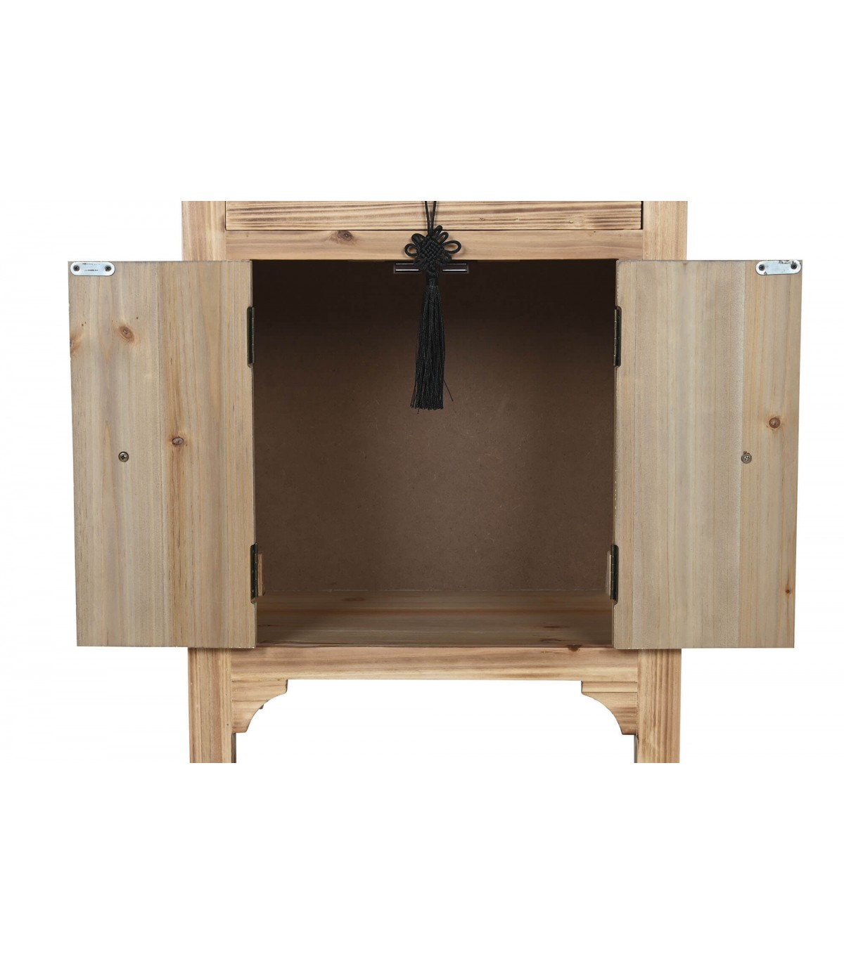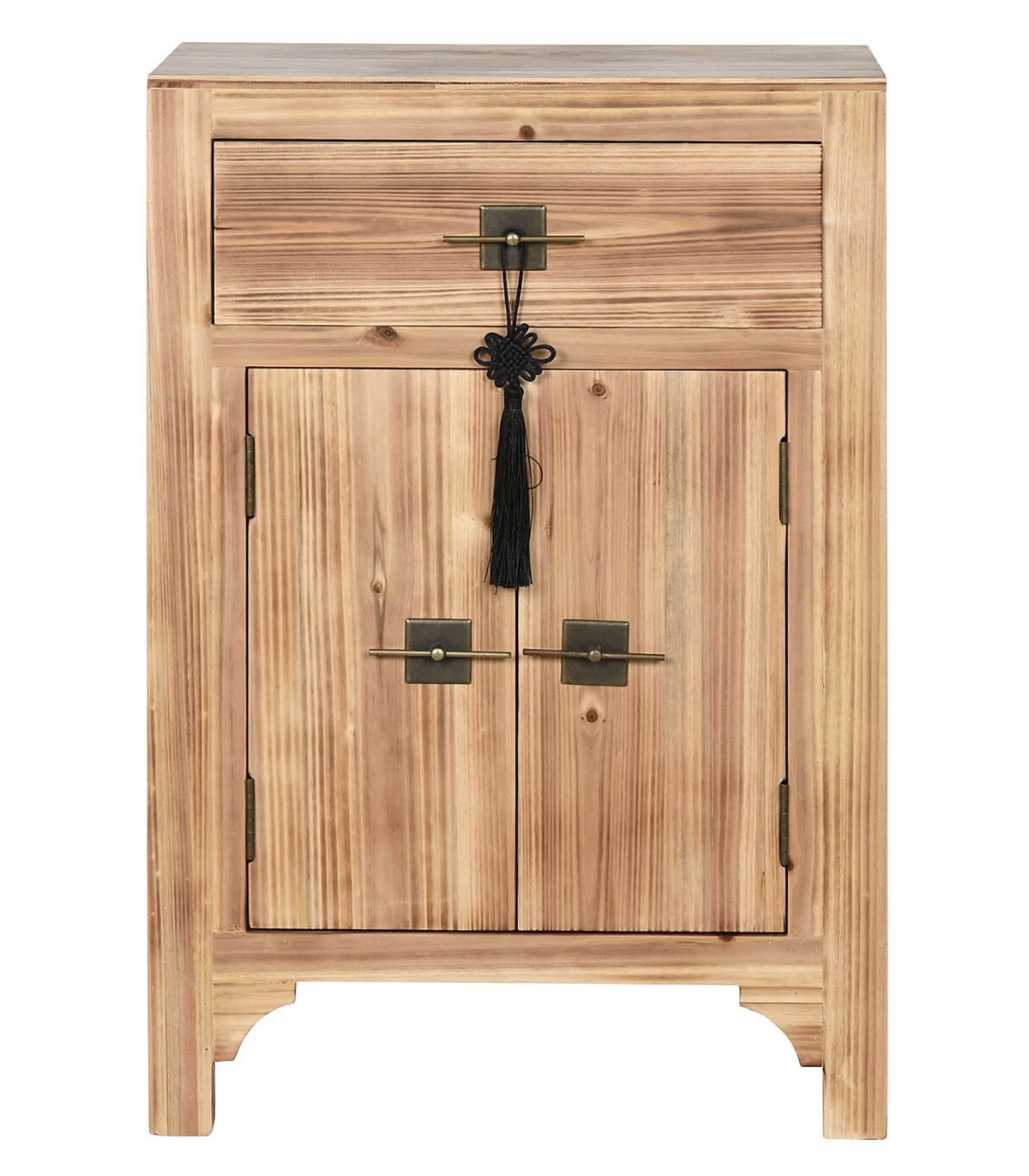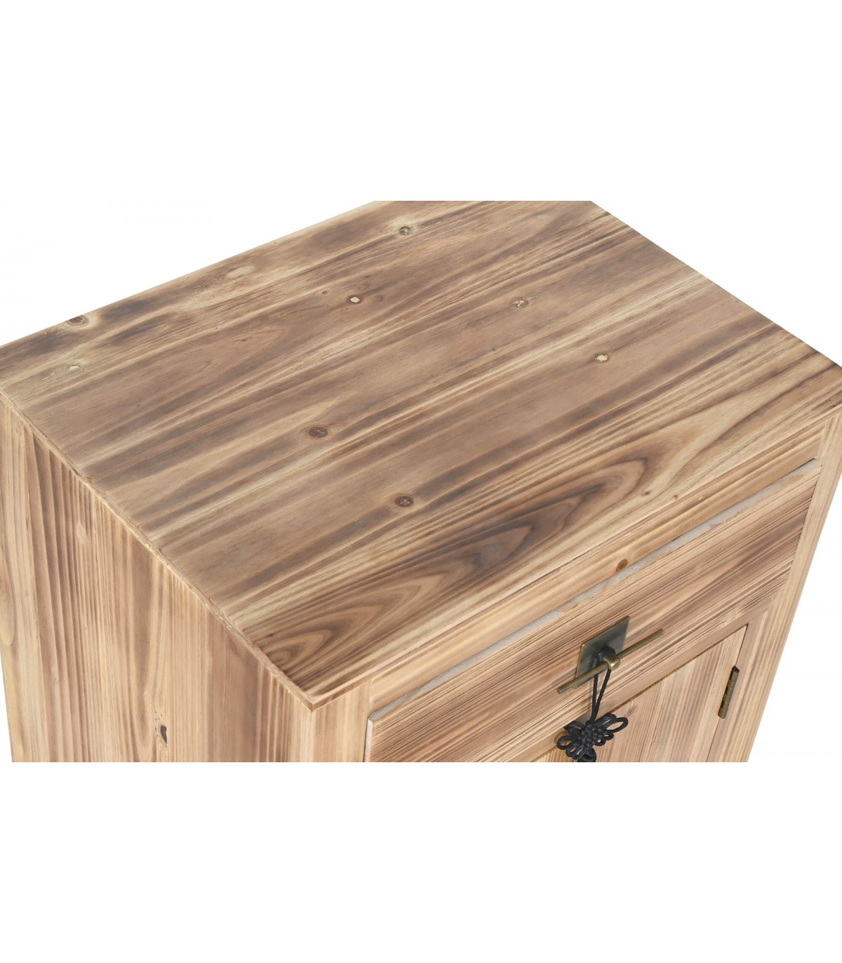Mesita de noche estilo oriental realizada en madera de abeto natural con los tiradores acabado bronce, de buena capacidad y muy decorativa, perfecta para acompañarla con cabeceros tapizados o fibras naturales.