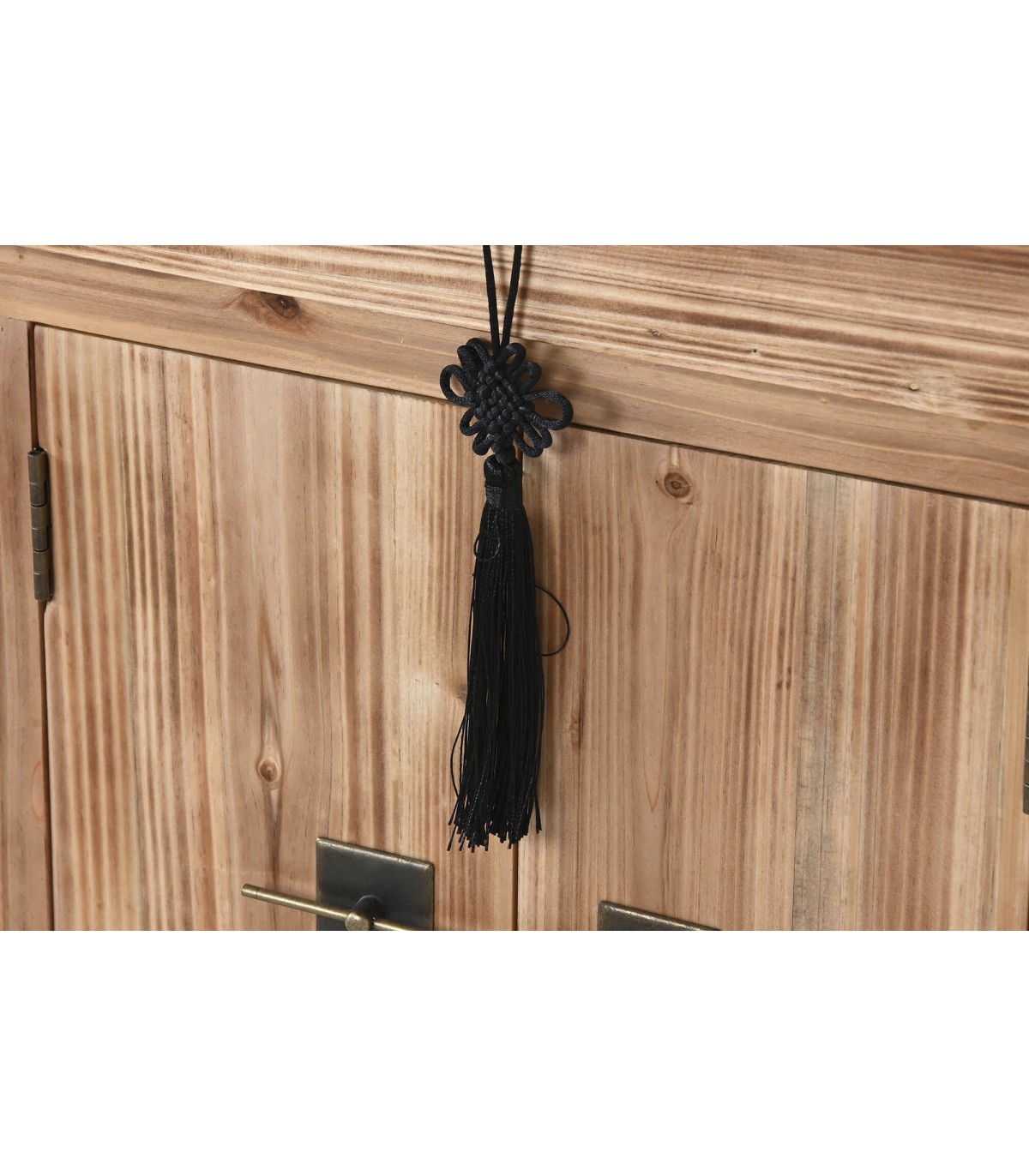 Acabado, madera natural, tiradores en latón pavonado, detalle de filigrana en color negro.