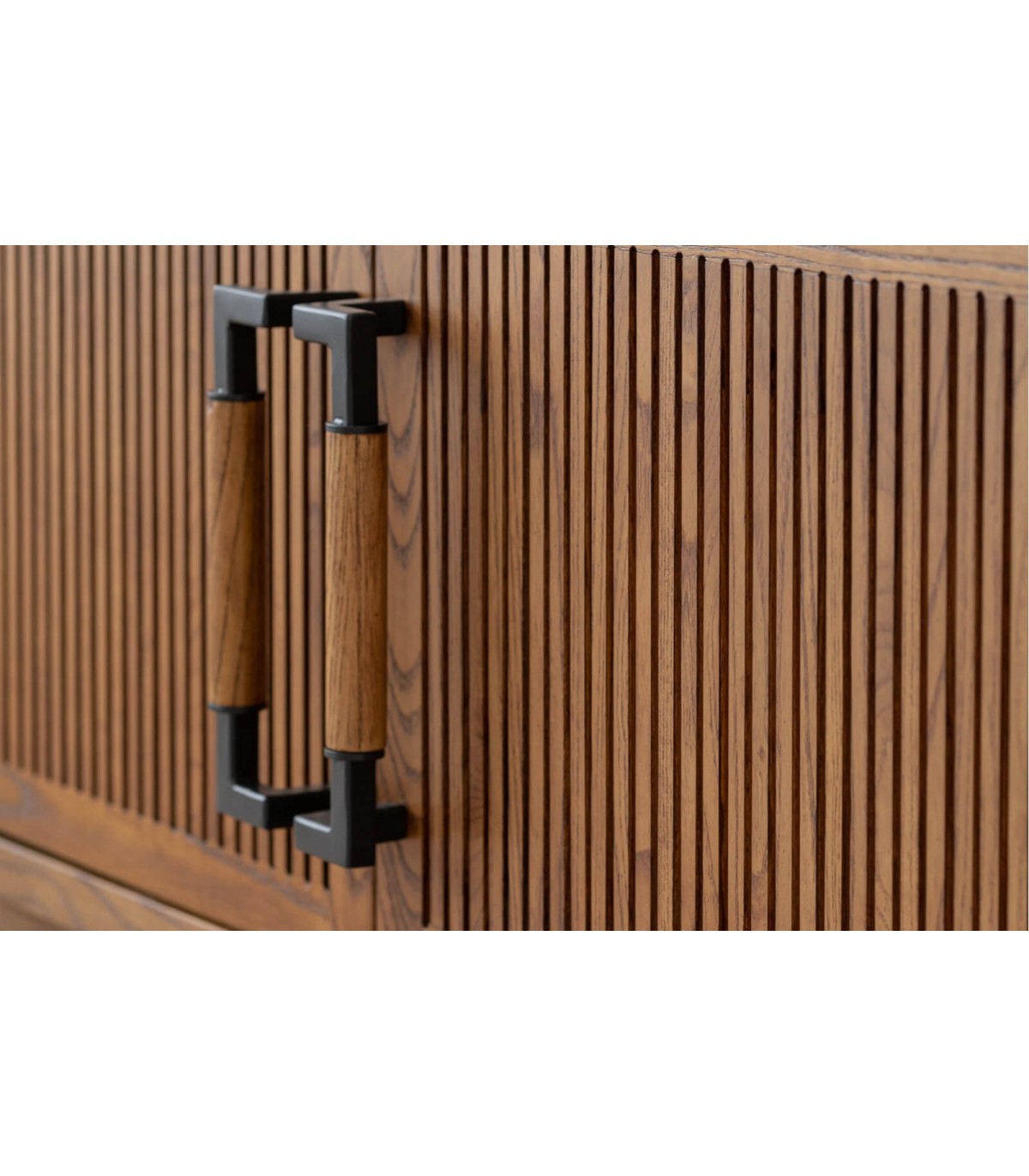 Las cuatro puertas lisas ofrecen espacio para dispositivos y accesorios, ayudando a mantener todo en orden sin renunciar al estilo. Herrajes de metal negro introducen un contraste discreto que realza la pureza del diseño. Las proporciones generosas y el aire japandi favorecen la integración en interiores nórdicos o minimalistas. Una pieza sobria y funcional que añade equilibrio visual.