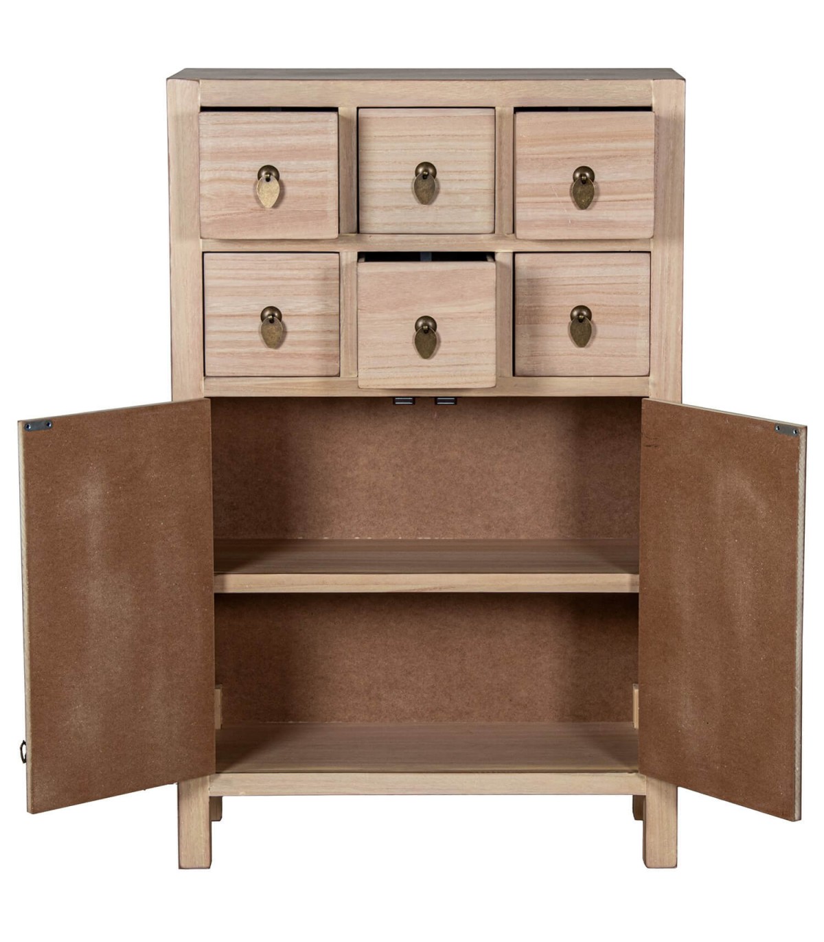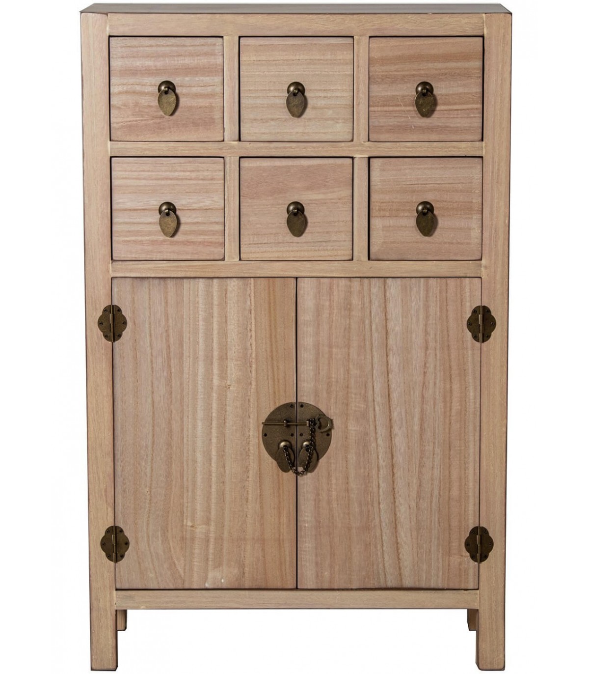 Este taquillón compacto es perfecto para aportar carácter a estancias como pasillos, recibidores o comedores. Su diseño de inspiración oriental combina seis pequeños cajones y dos puertas inferiores, ofreciendo una solución funcional y con mucha personalidad.