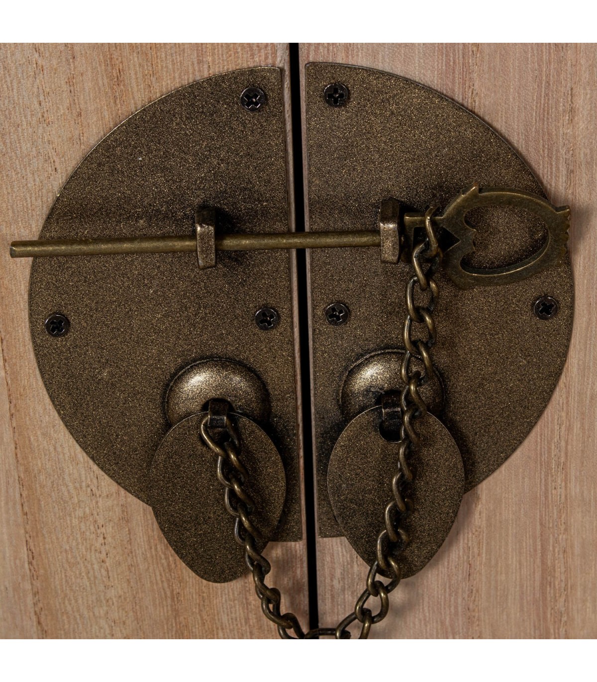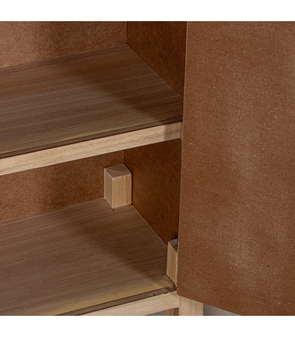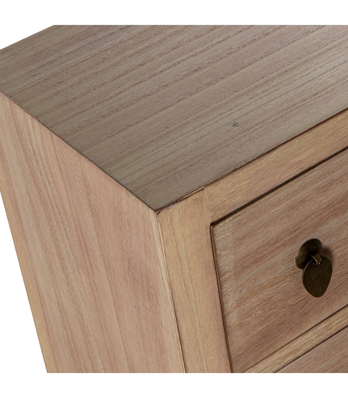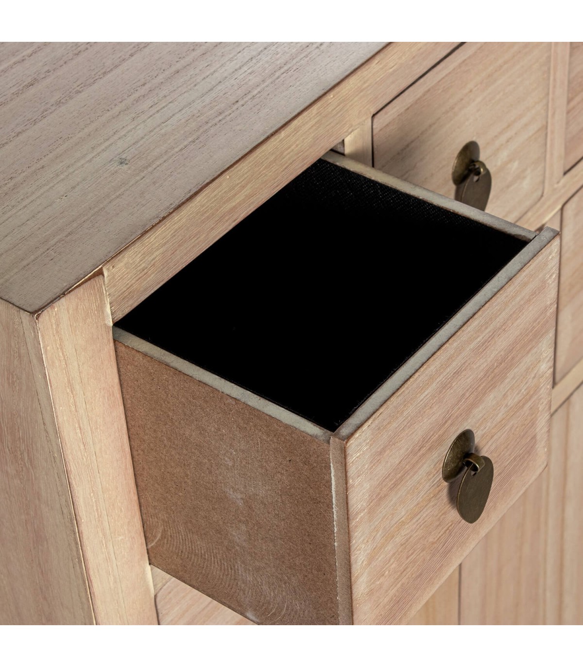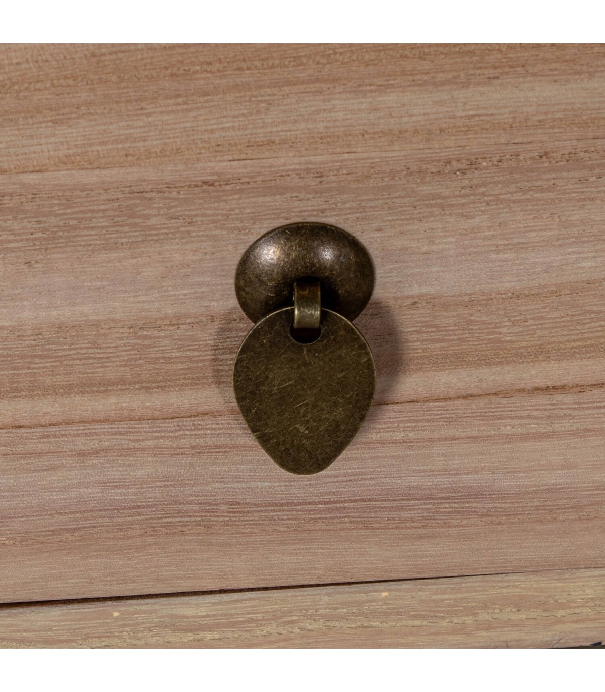 La madera natural de paulonia aporta calidez, mientras que los herrajes metálicos en bronce patinado evocan un aire tradicional refinado. Cada detalle está cuidado, con una estética limpia y artesanal que transmite equilibrio. Encaja en ambientes étnicos, rústicos o boho con un toque exótico. Una pieza decorativa y muy práctica.