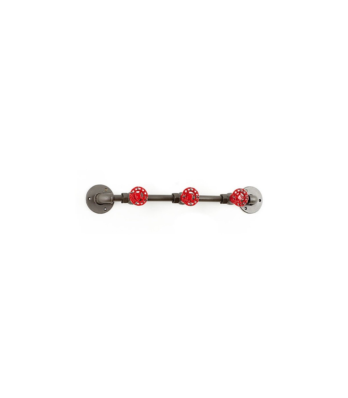 Perchero de pared original y divertido realizado en metal acabado artesanalmente en gris y rojo, con motivo de tubería, de estilo vintage.