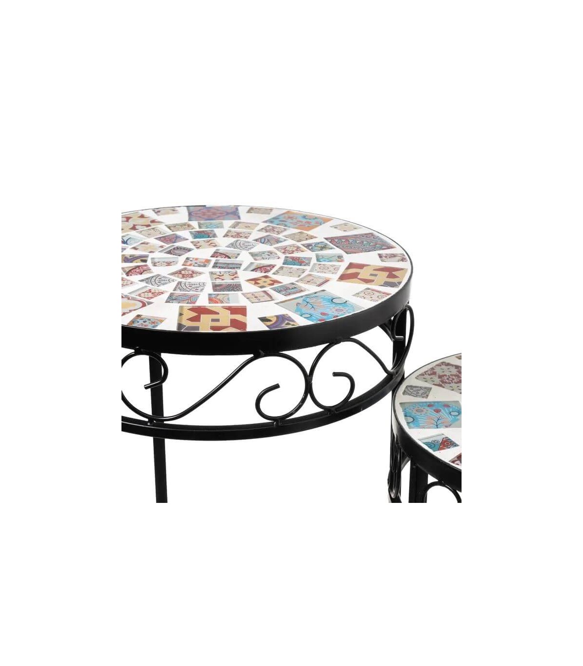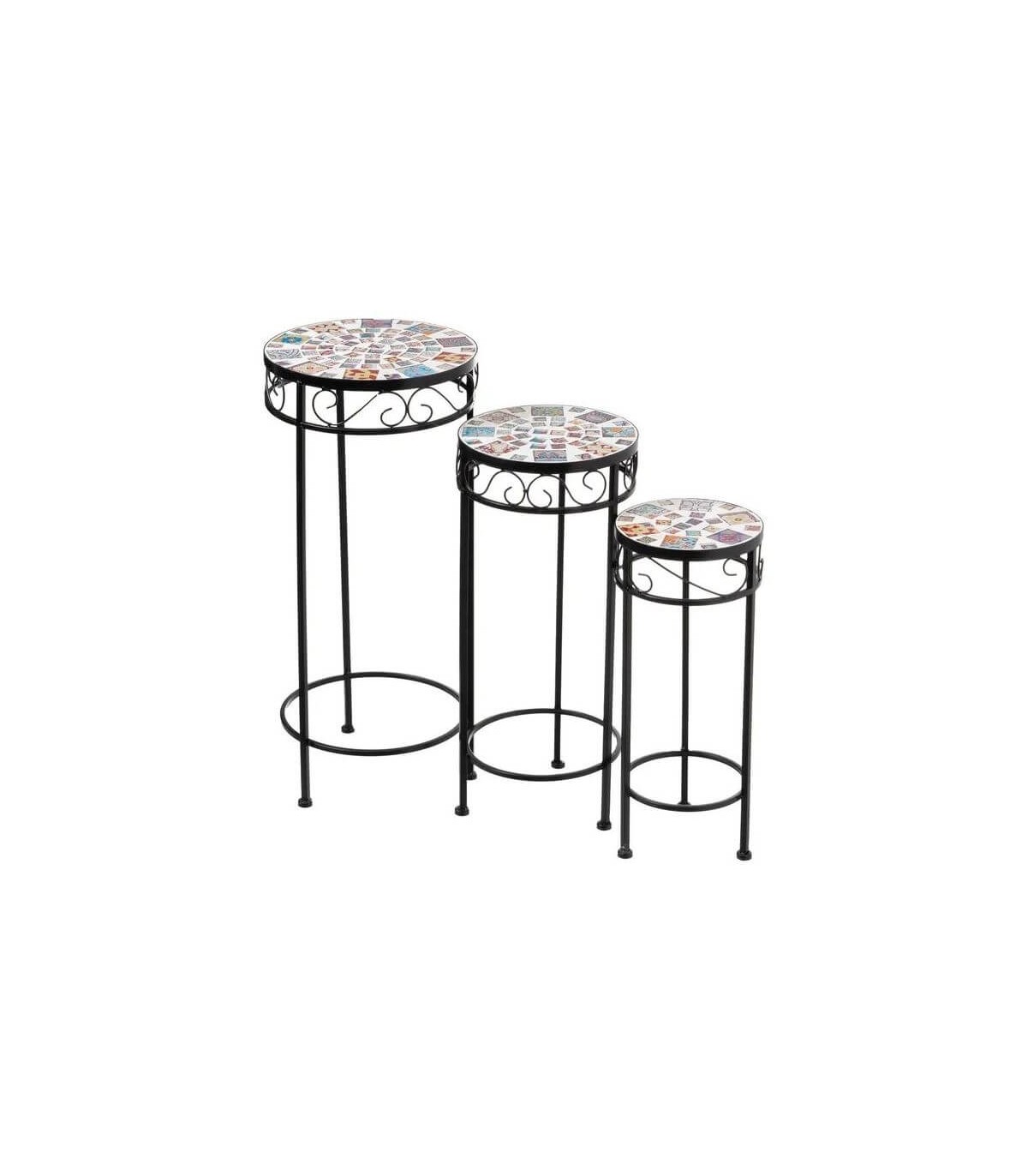 Juego de 3 pedestales con la base en hierro negro y la tapa collage de cerámica, muy valido para el interior como para el exterior, perfecta para terrazas pequeñas o jardines, se puede poner en composición, o por separado, una pieza atemporal.