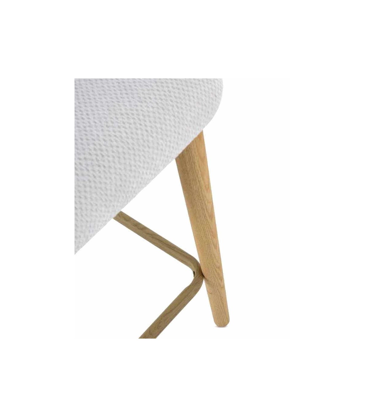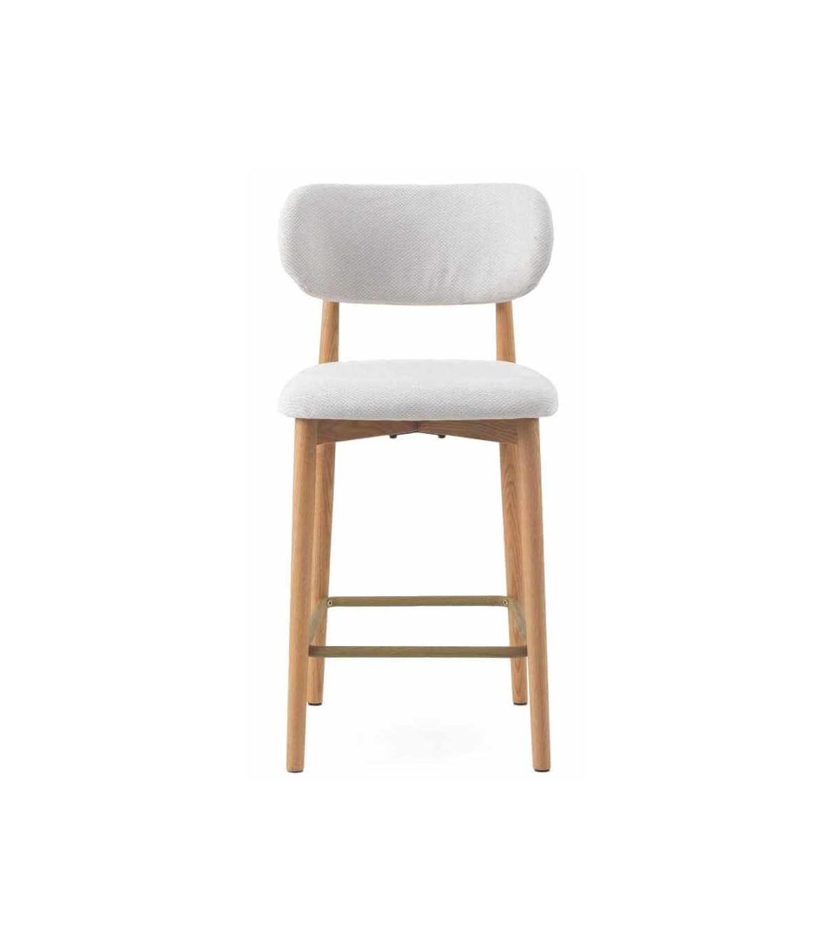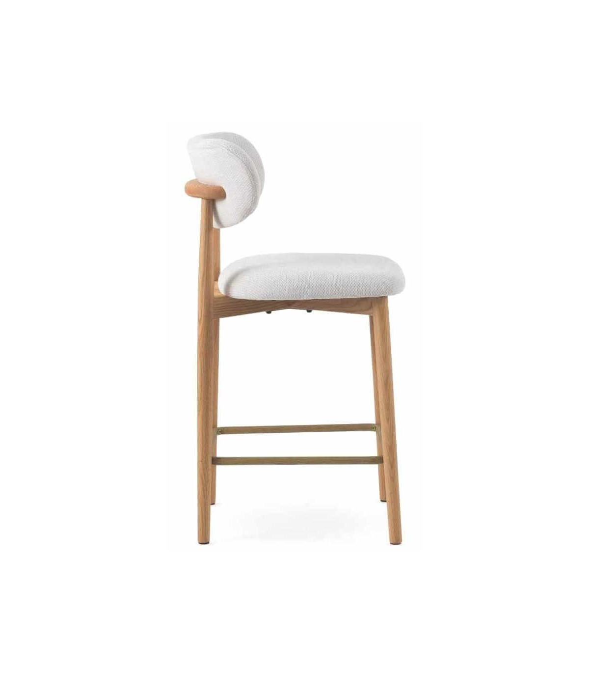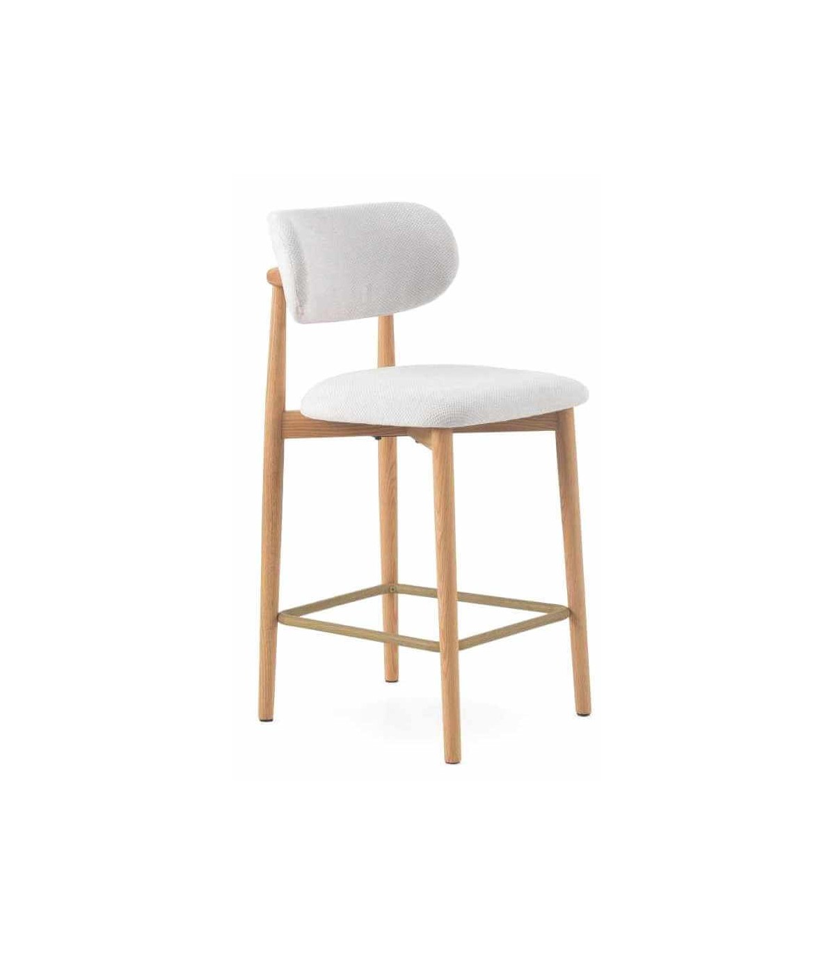 El asiento tapizado en chenilla blanca aporta confort y suavidad al conjunto sin recargar el diseño. Las líneas rectas y proporciones equilibradas refuerzan su carácter actual y atemporal. El reposapiés metálico añade estabilidad y contraste visual. Un conjunto versátil para cocinas, barras o zonas de comedor informal.