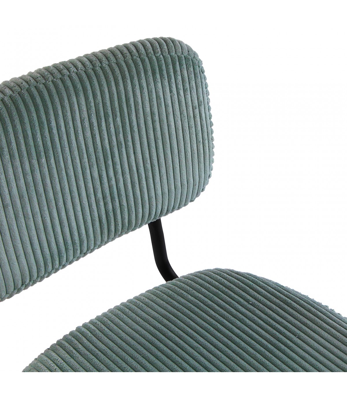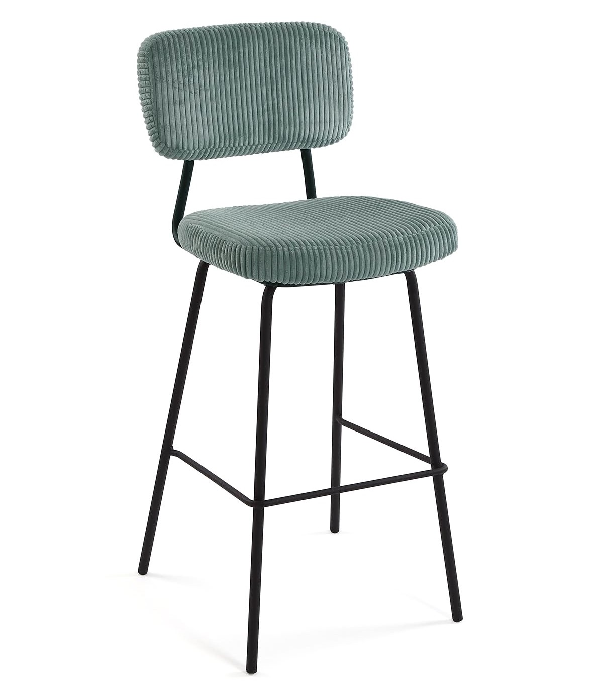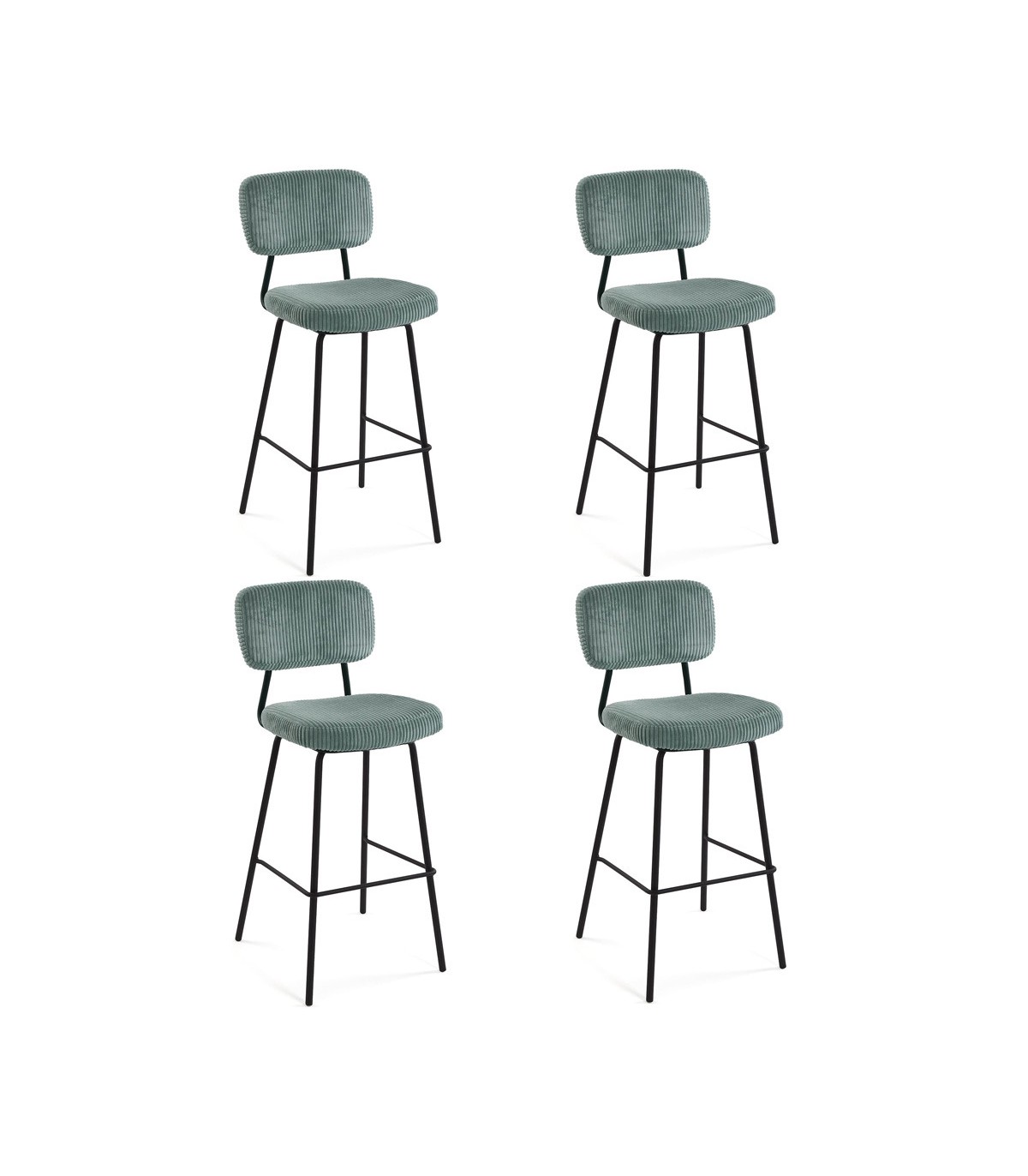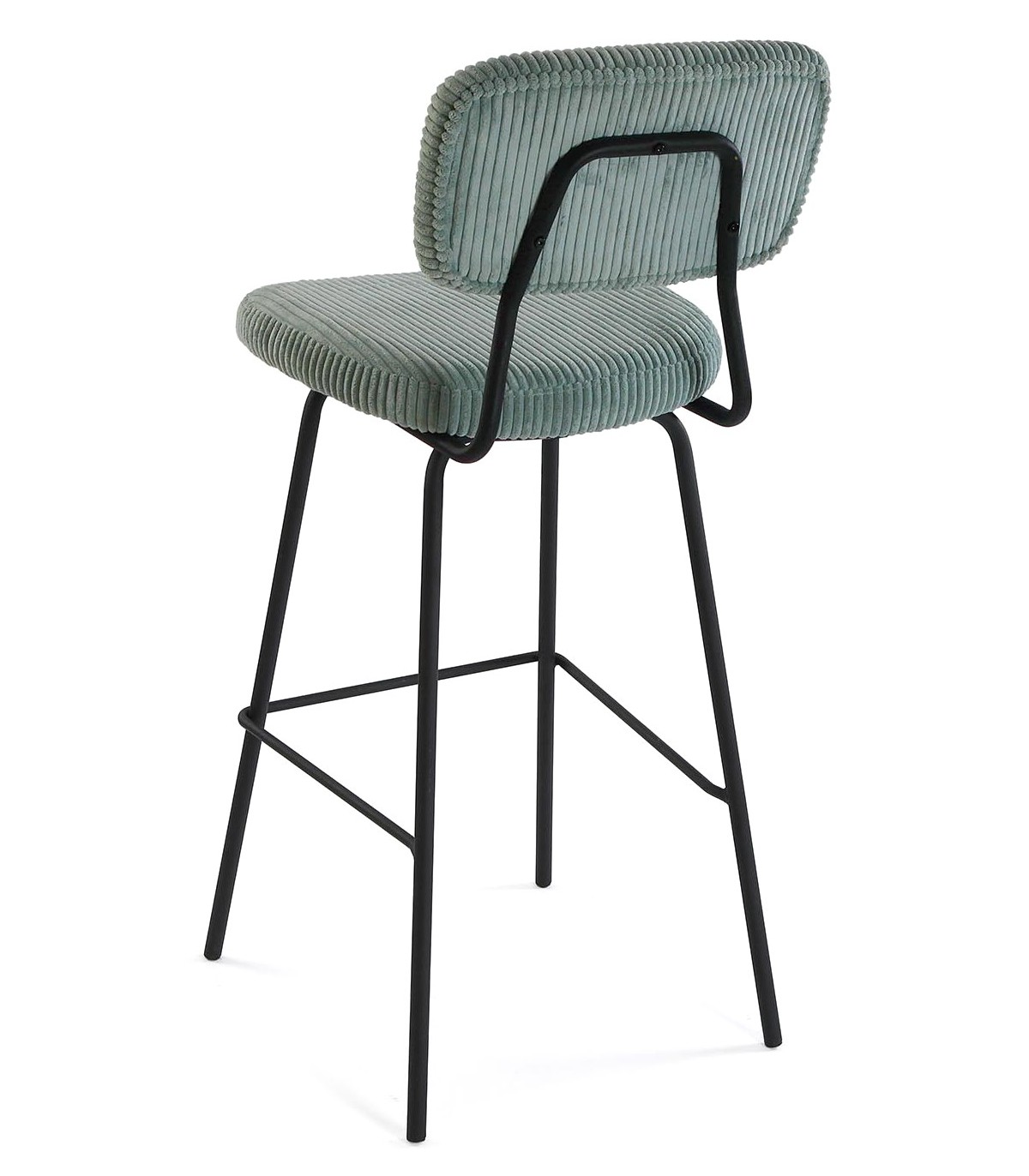 Set 4 taburetes para barra muy cómodo, con el asiento y el respaldo tapizados, estilo industrial, con la estructura en acero acabada en negro tapizado en pana color menta, perfecto para crear ambientes sofisticados y elegantes.