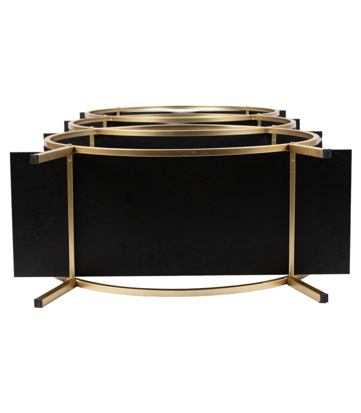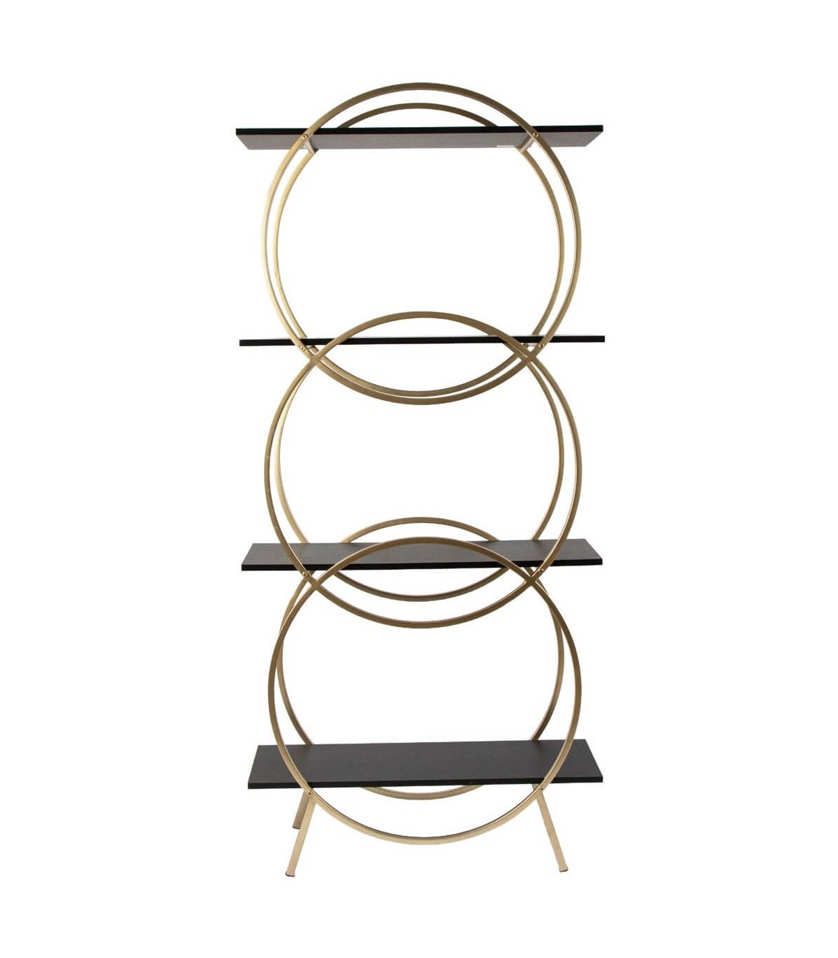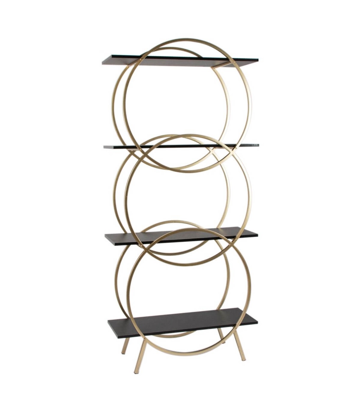 Esta estantería sorprende con una estructura geométrica de círculos dorados que realzan su diseño art decó con gran personalidad. Sus baldas en madera imitación wengué contrastan con el brillo metálico del oro, creando una combinación elegante y moderna.