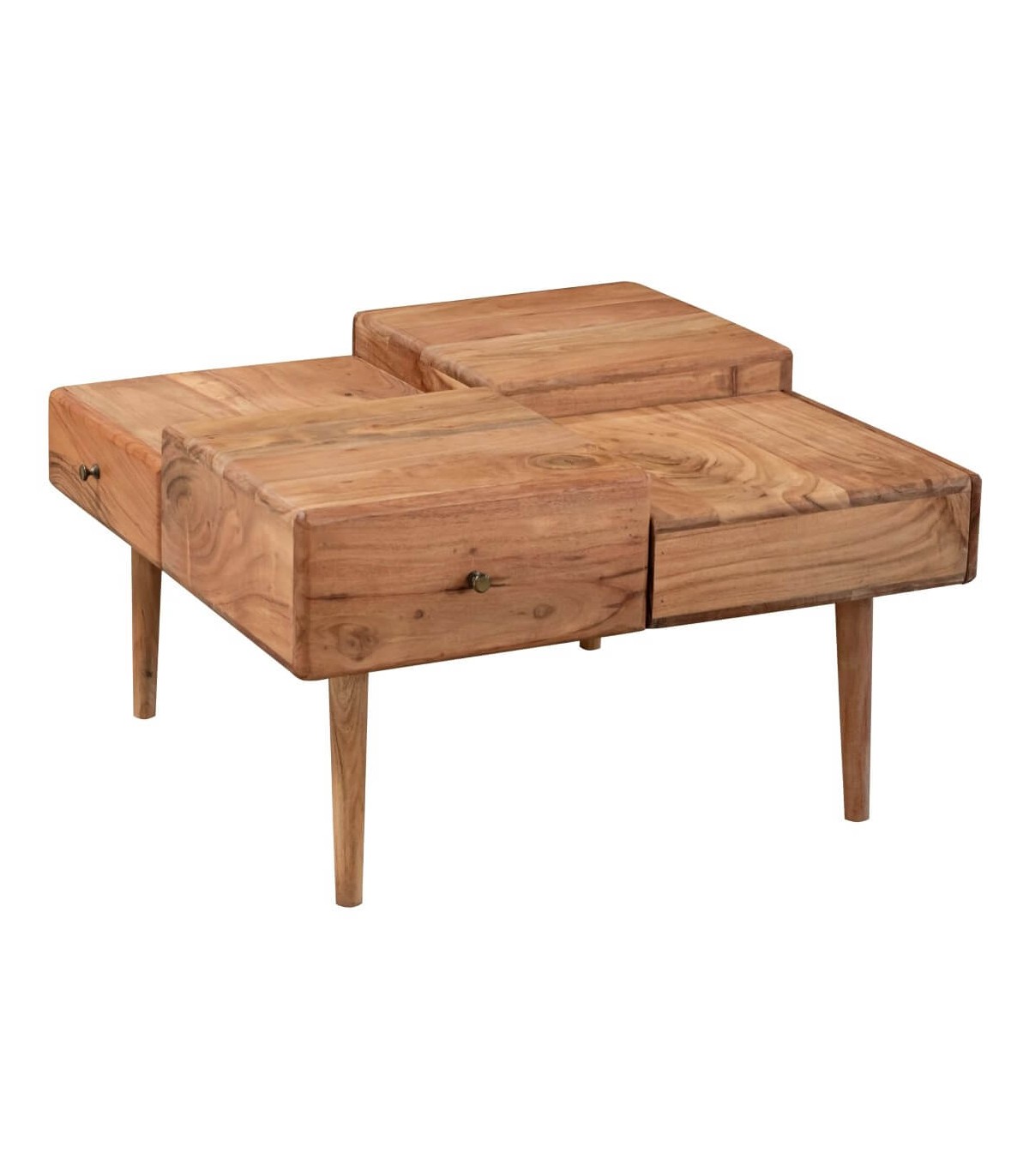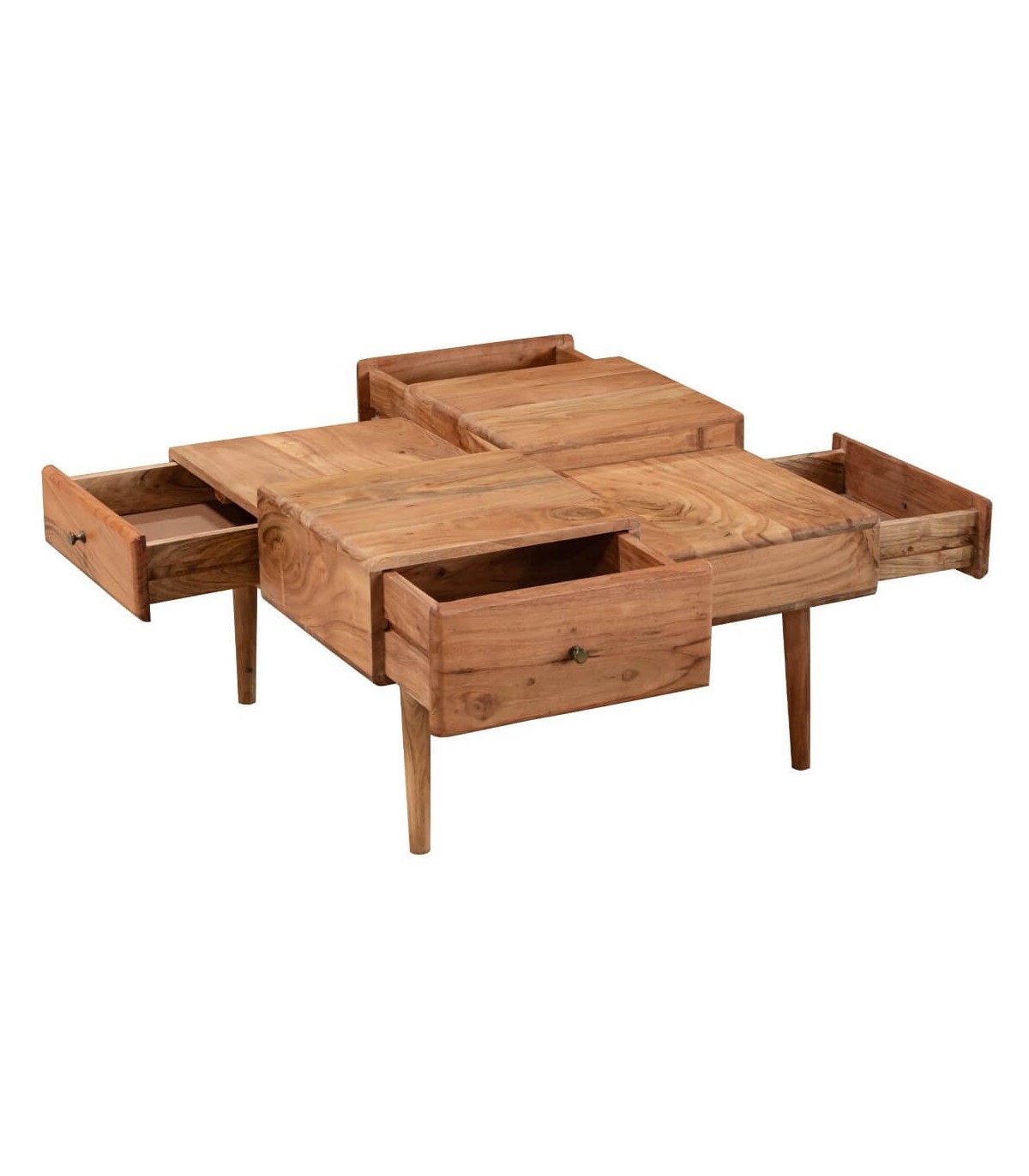 Mesa de centro original cuadrada realizada en madera de acacia natural ligeramente patinada con 4 cajones de capacidad, sobria y recia, un diseño de mesa muy actual por la que no pasará el tiempo.