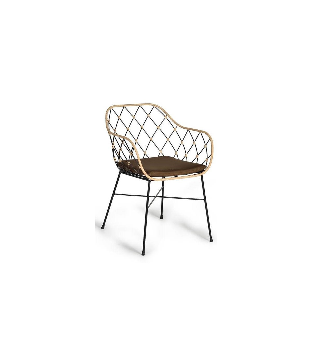 Bonita silla con cojín del asiento tapizado y desenfundable, muy bien rematada con una estructura muy consistente en metal, con el detalle decorativo del ratán trenzado a mano, una pieza que encaja perfectamente en cualquier tipo de decoración, un acierto seguro.