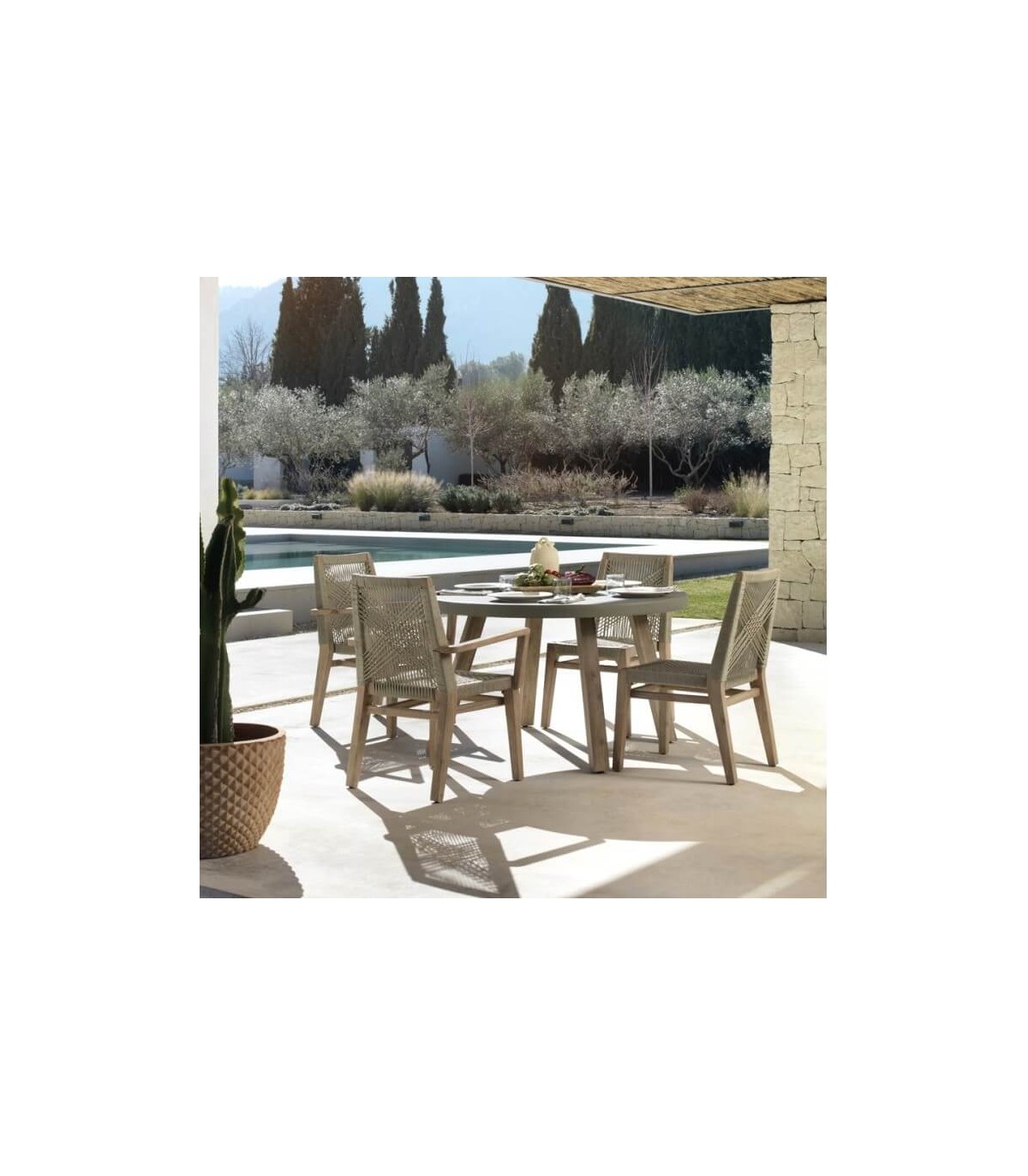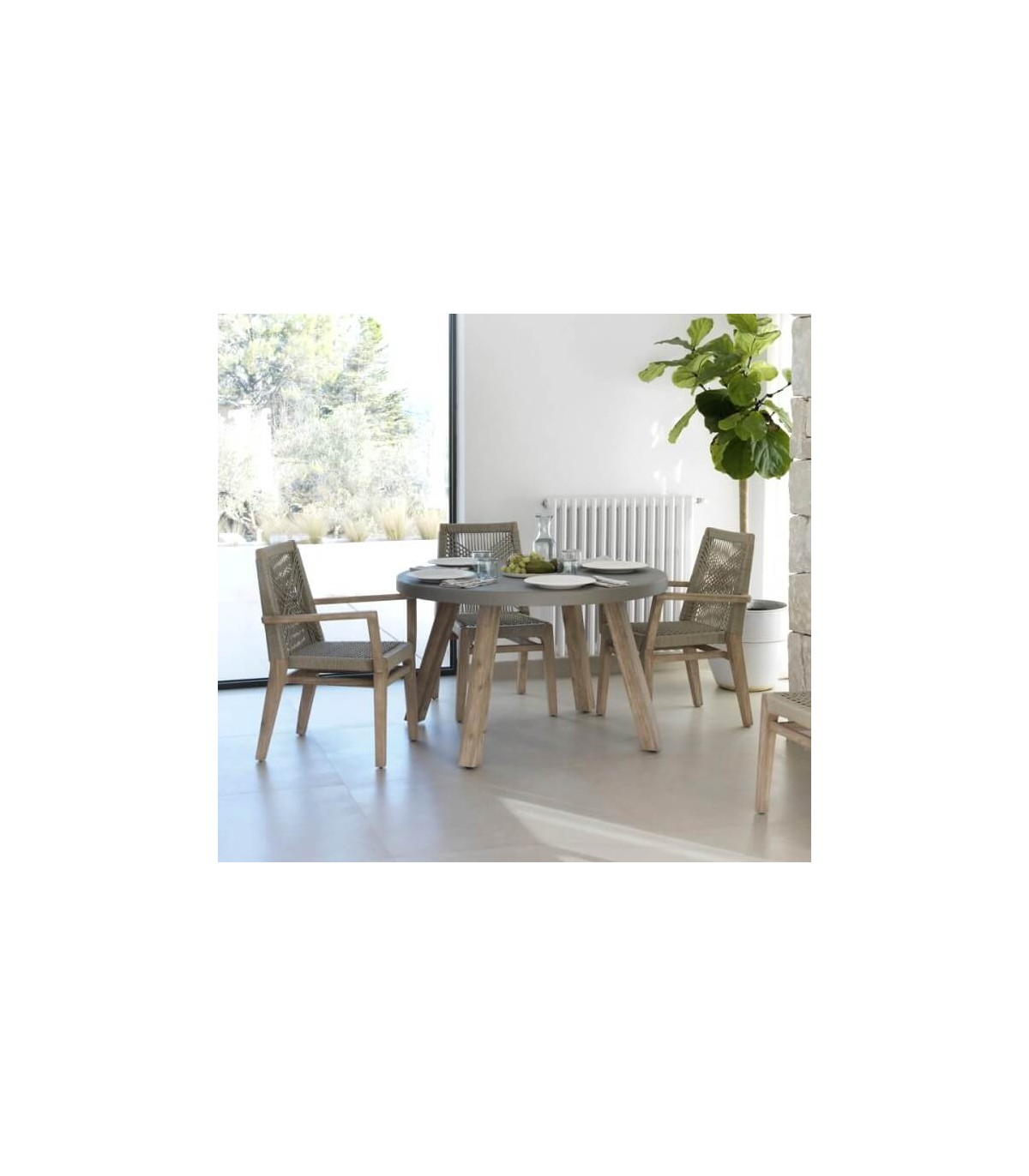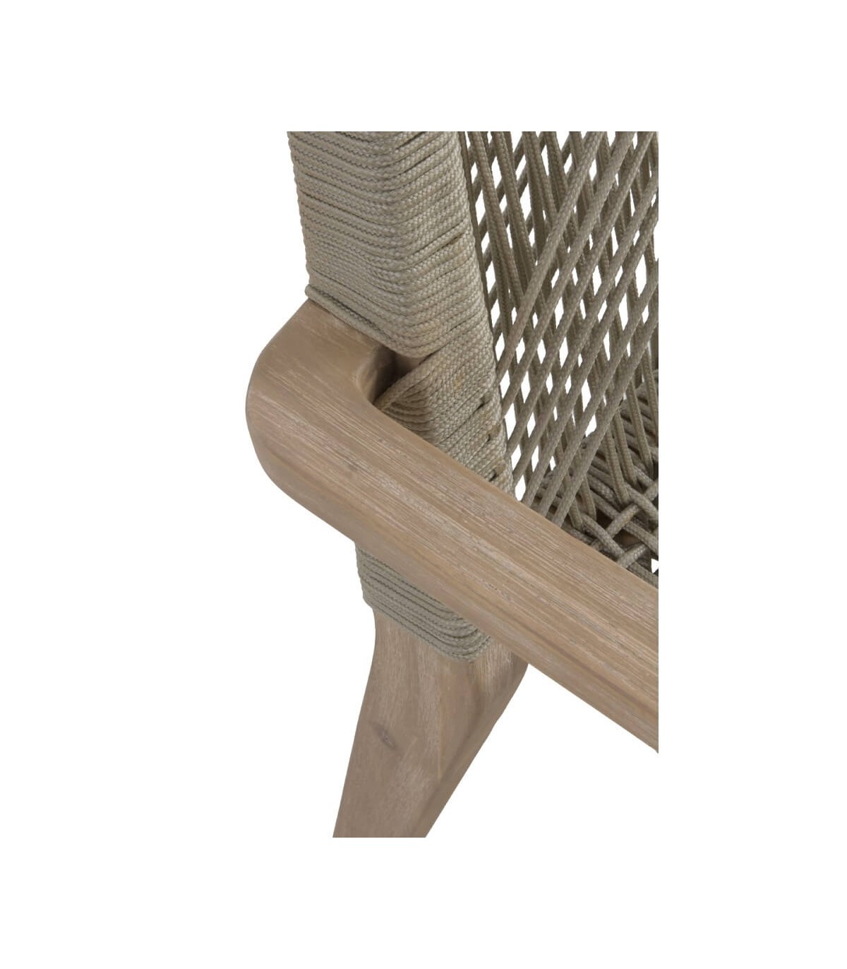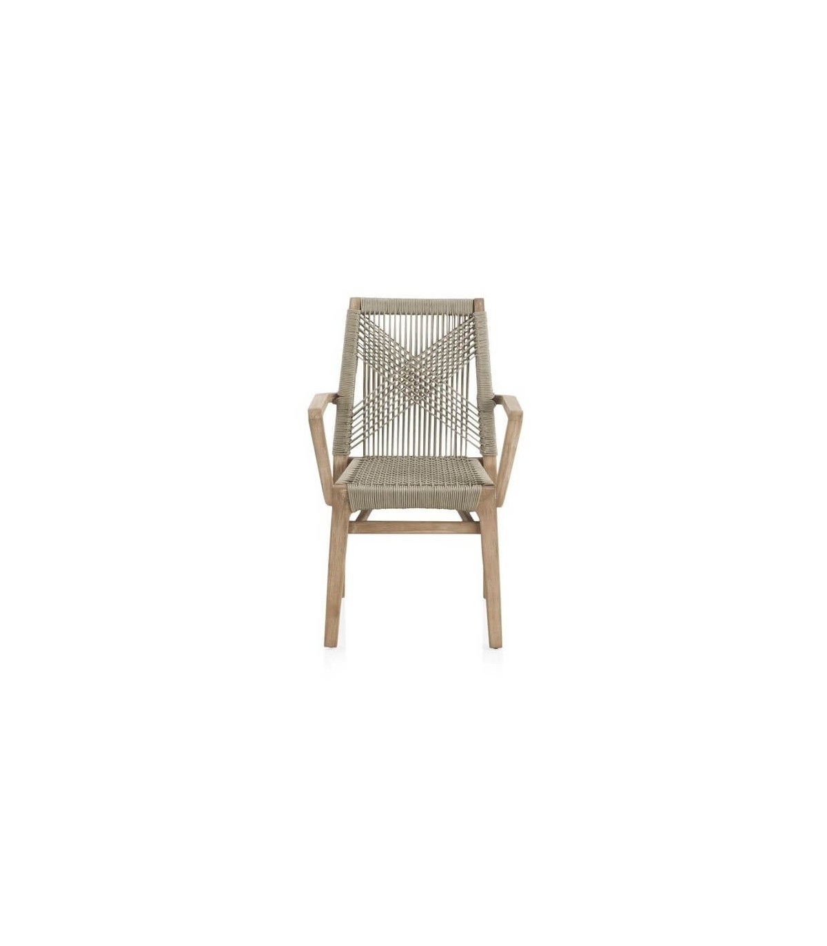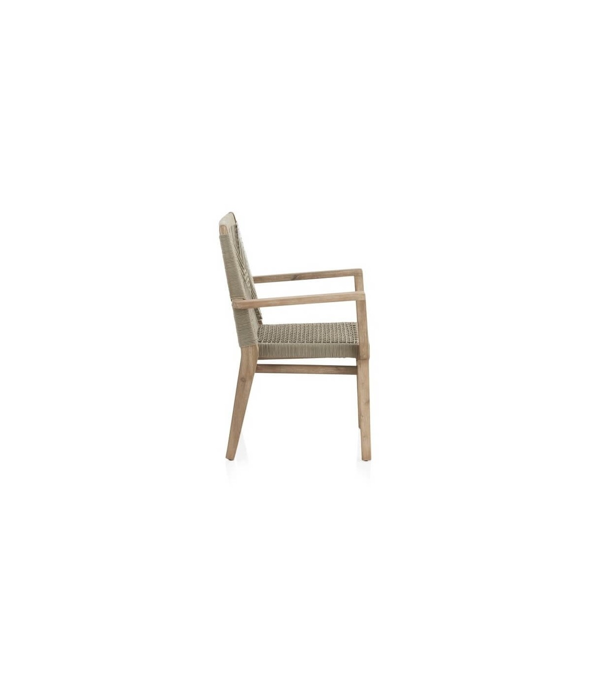 Sillón de comedor realizado en madera acacia patinada con una estructura en aluminio recubierta de cuerda color topo, un sillón resistente y cómodo que encaja bien en ambientes coloniales, incluso en exterior. Perfecta para hogar o para hostelería.