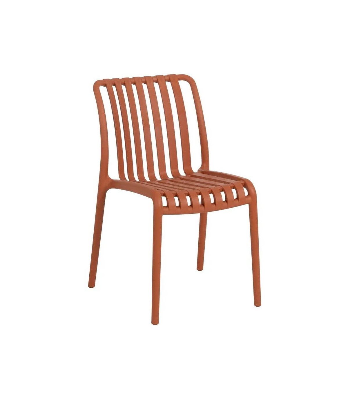 Silla de polipropileno apilable, color terracota, muy cómoda al ser una estructura no rígida, muy práctica a la hora de la limpieza, una silla perfecta para exterior o interior, para no dejarla escapar.