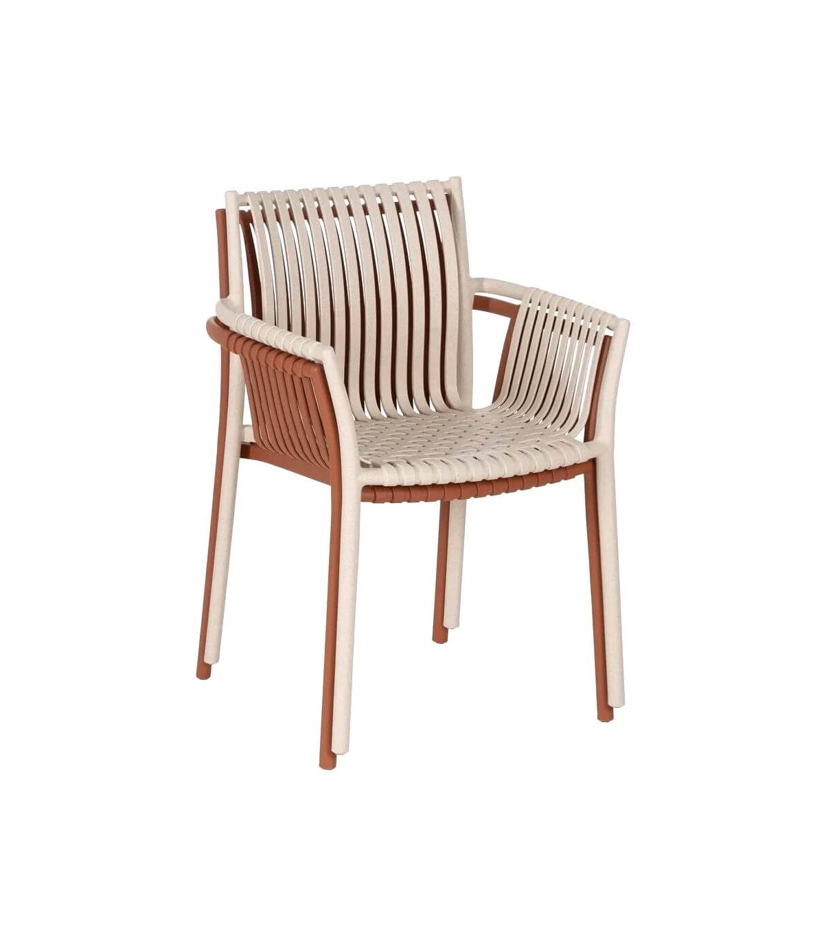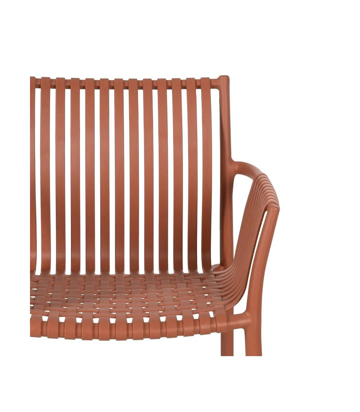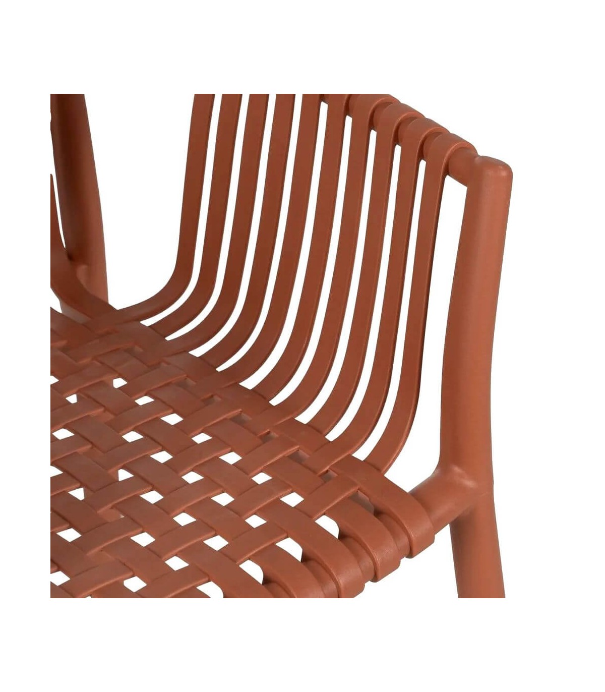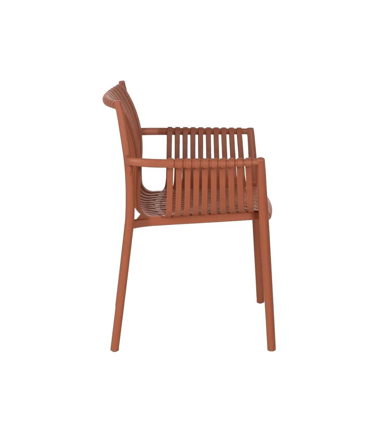 Sillón de comedor apilable para exterior realizado en polipropileno color caldero, un sillón resistente y cómodo que encaja bien en todo tipo de ambientes. Perfecta para hogar o para hostelería.